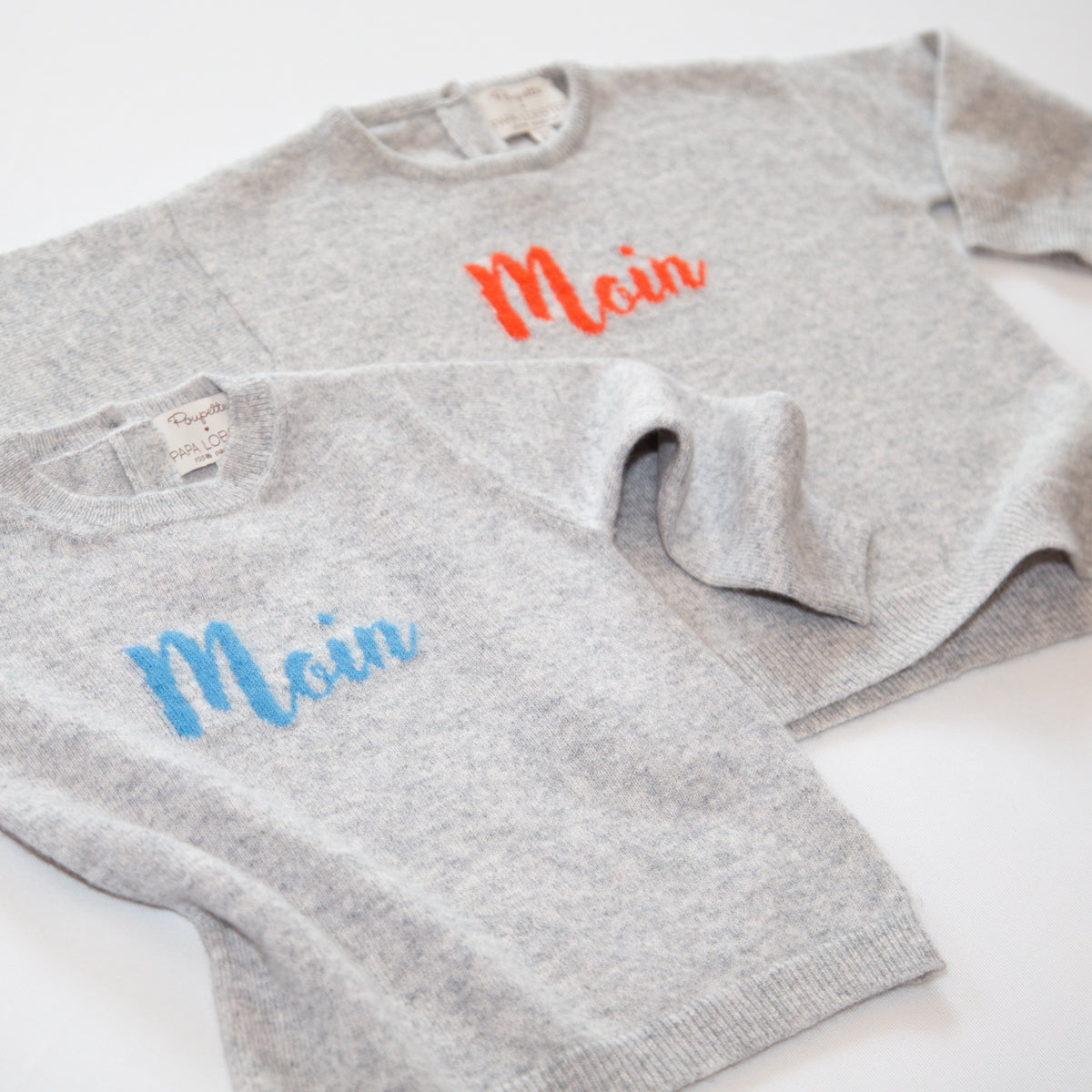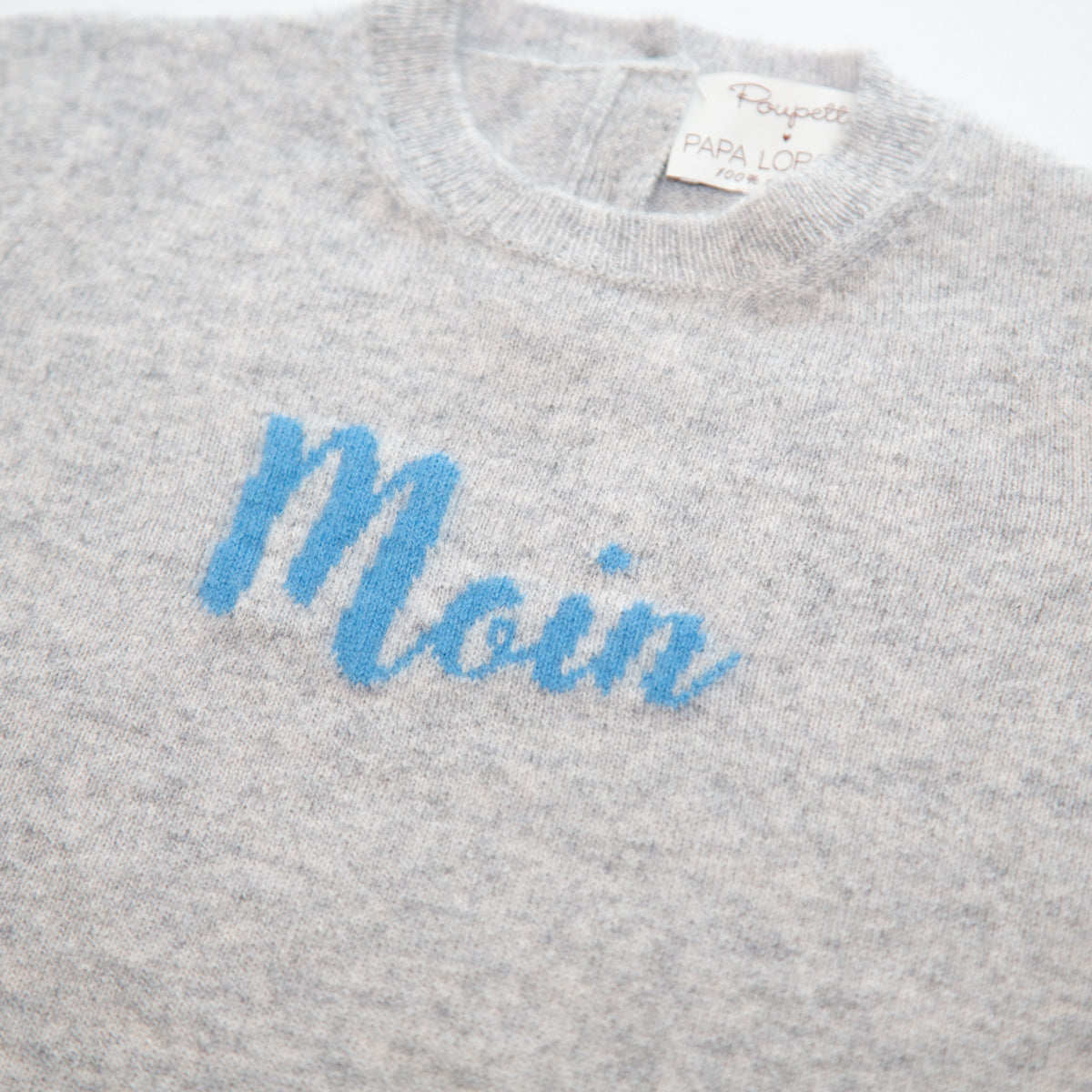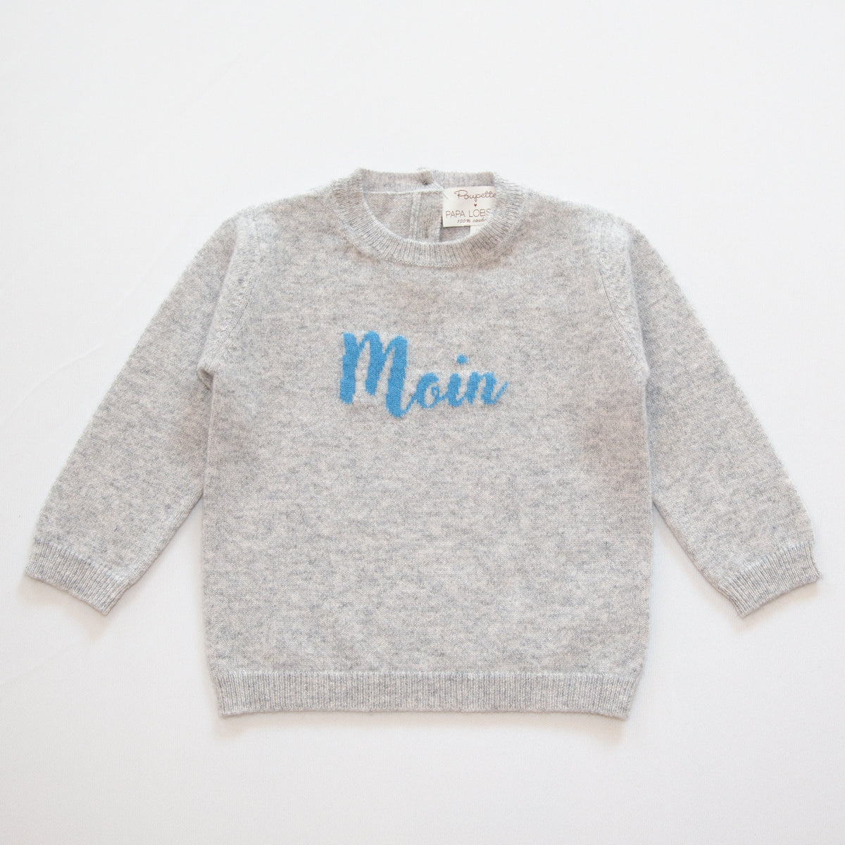Der Papa Lobster x Poupette Kaschmir-Pullover Moin in klassischem Grau mit kontrastierendem blauen Schriftzug vereint nordischen Charme mit edlem Strickdesign. Gefertigt aus 100% Kaschmir ist er besonders weich, warm und angenehm zu tragen. Der maritime Gruß „Moin“ macht den Pullover zu einem fröhlichen Hingucker – perfekt für kleine Entdecker im Alltag oder zu besonderen Anlässen.