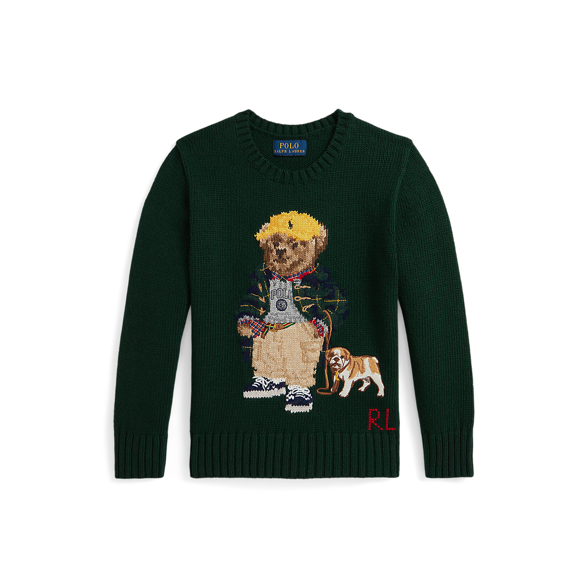 Der Polo Ralph Lauren Kids - Pullover mit Polo Bär zeigt den ikonischen Polo Bear – aufwendig gefertigt aus über 20 verschiedenen Garnen. Das charmante Motiv zeigt den Bären im typischen Ralph-Lauren-Outfit beim Spaziergang mit einer Bulldogge. Ein echter Hingucker, der klassischen Stil mit verspieltem Charakter verbindet.