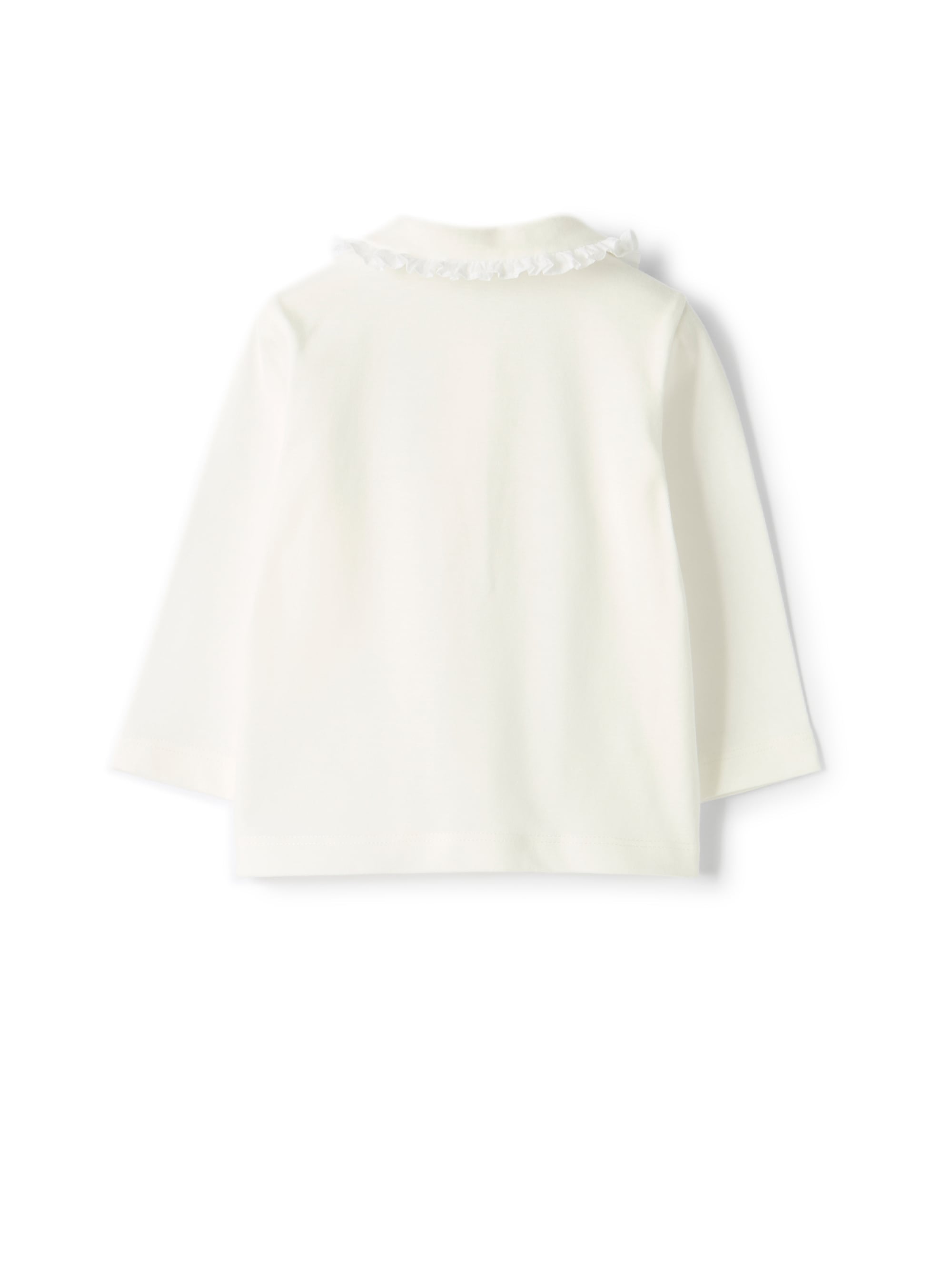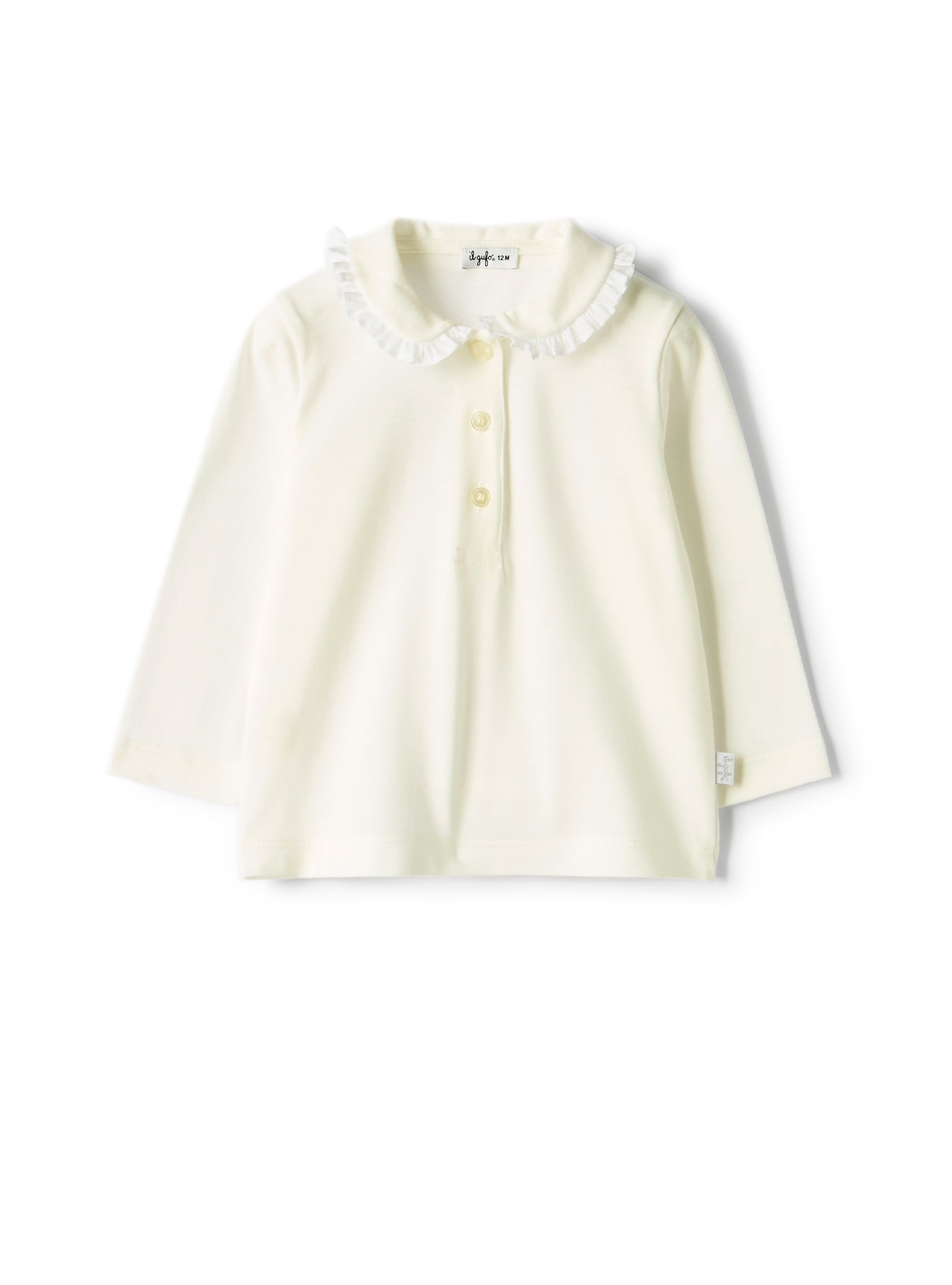 Das Il Gufo Langarmshirt mit Rüschenkragen ist ein charmantes Basic für Babys und Kinder. Gefertigt aus 100 % weicher Baumwolle, bietet es angenehmen Tragekomfort und eine hochwertige Haptik. Der runde Kragen mit zarter Rüschenverzierung verleiht dem Shirt eine elegante, verspielte Note. Mit Knopfleiste auf der Vorderseite und klassischem Schnitt ist es perfekt zum Kombinieren mit Kleidern, Strickjacken oder Latzhosen – ideal für Alltag und festliche Anlässe.