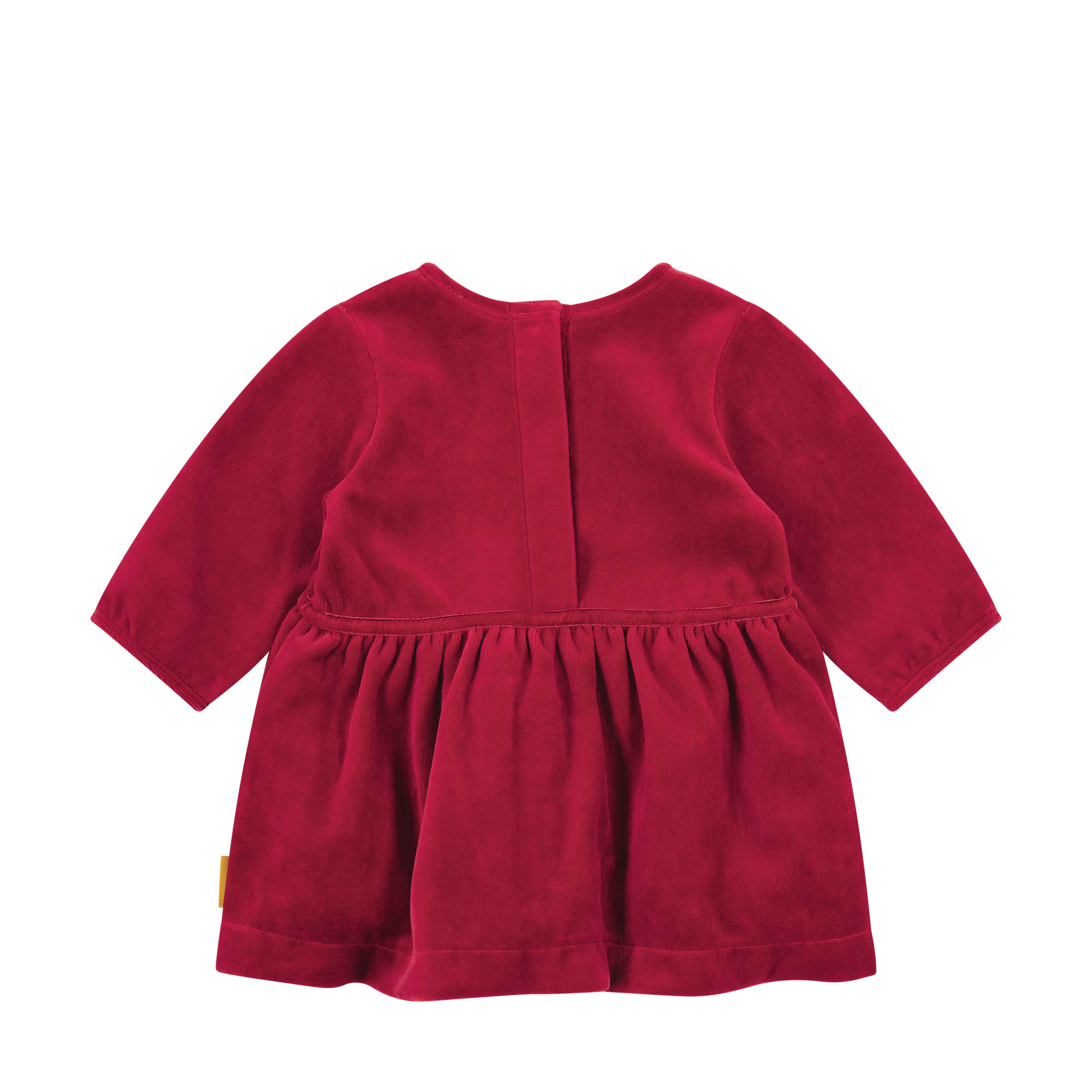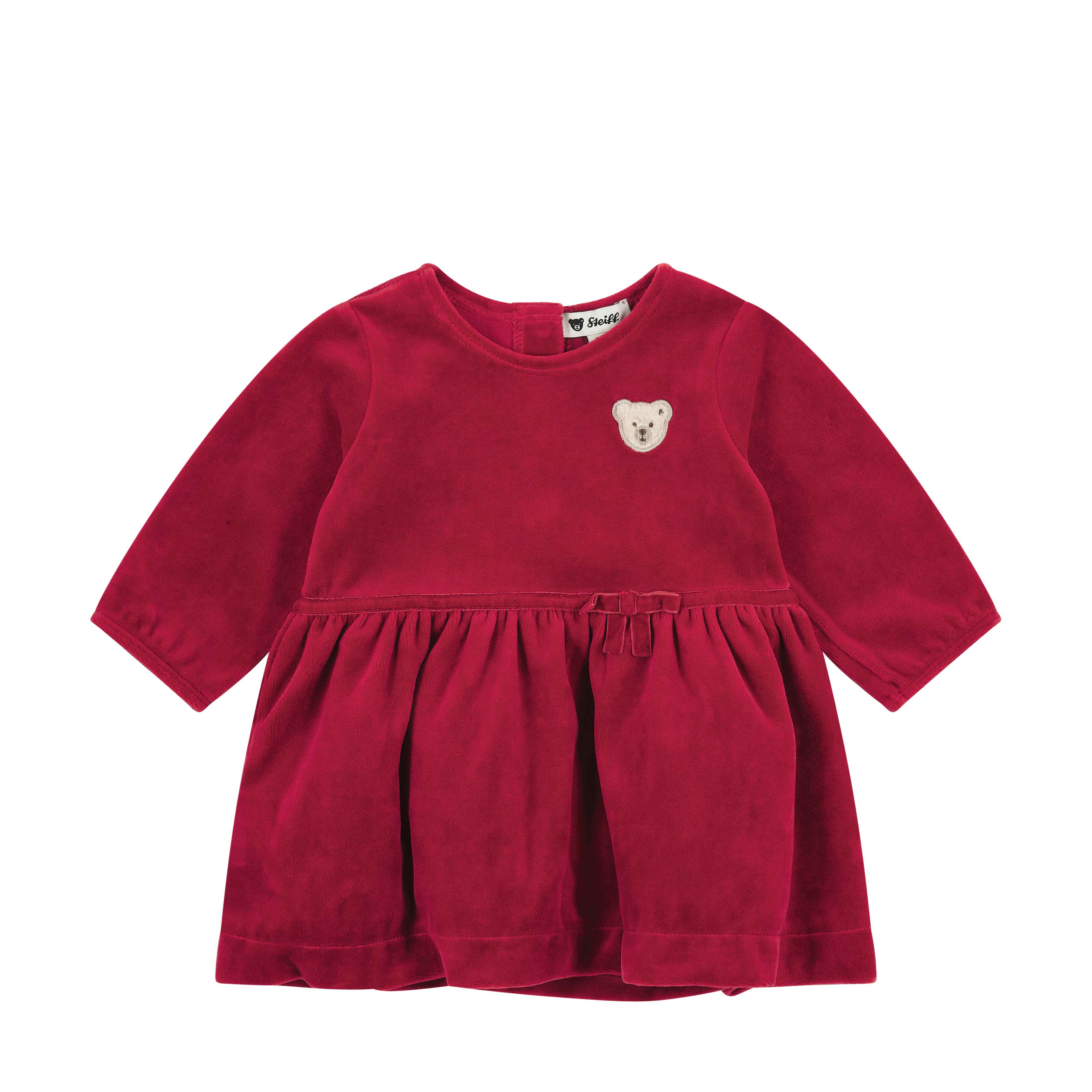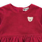 Das Steiff Langarmkleid in festlichem Rot begeistert mit schlichter Eleganz und liebevollen Details. Die weich fallende, geraffte Rockpartie sorgt für eine niedliche Silhouette, während das kleine Schleifendetail an der Taille den Look charmant abrundet. Dank der bequemen Passform können kleine Mädchen unbeschwert spielen und sich rundum wohlfühlen. Auf der Brust begleitet das klassische Steiff Teddybärmotiv und verleiht dem Kleid einen unverwechselbaren Markenakzent. Ein süßes Lieblingsstück für festliche Anlässe und besondere Momente.