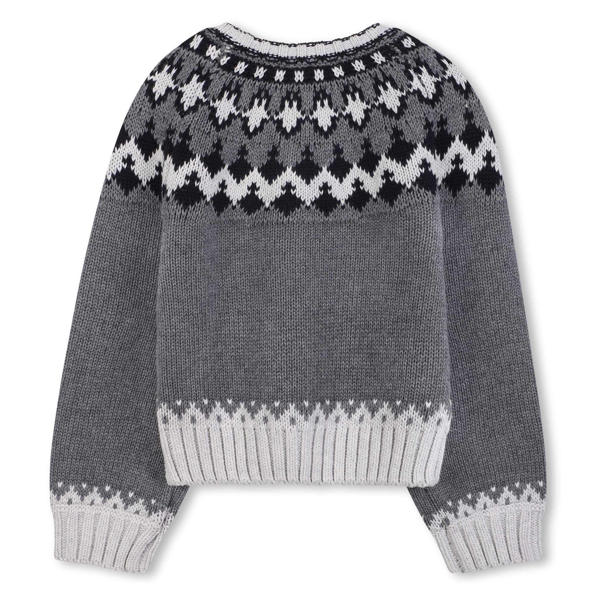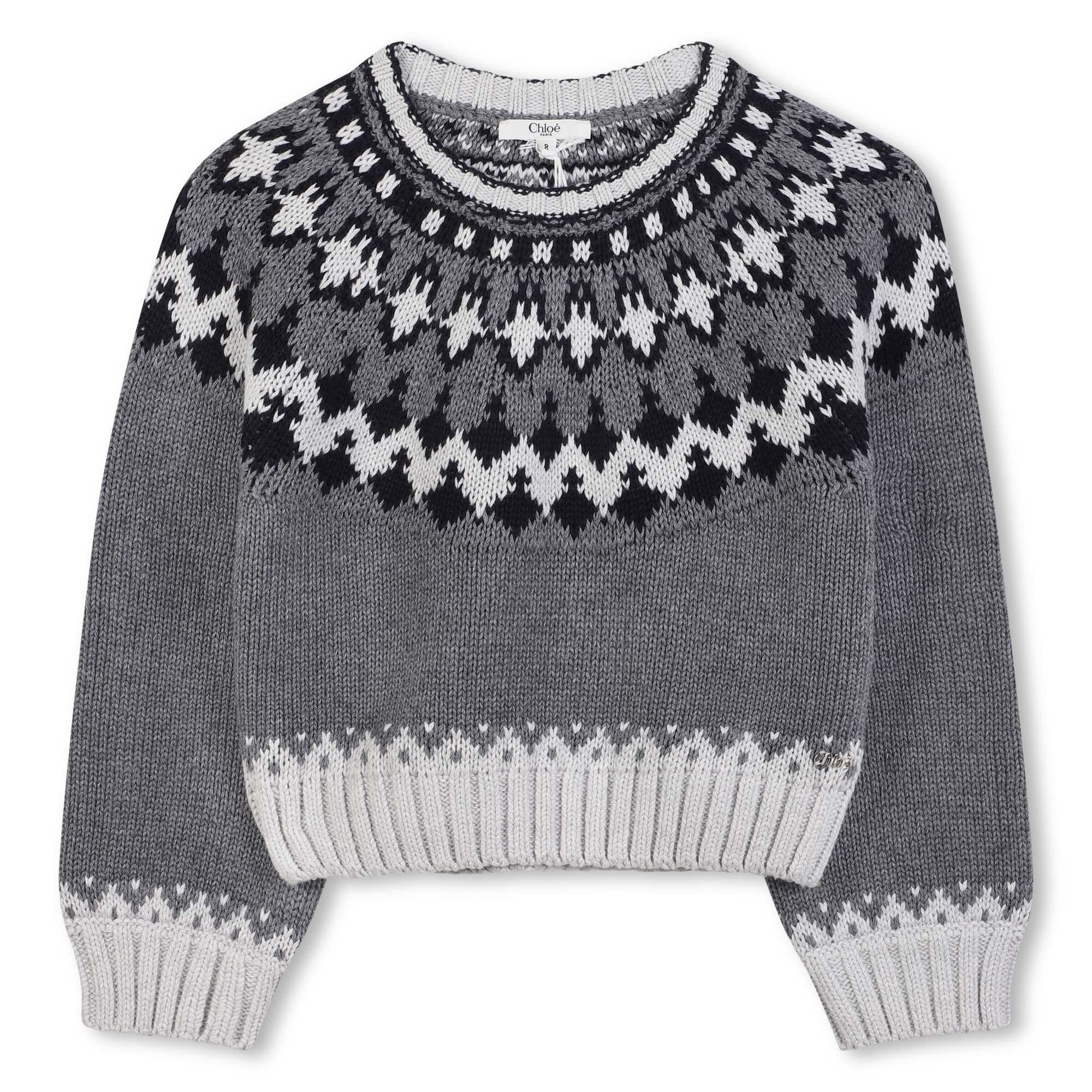 Der Chloé Kids Strickpullover in Grau ist ein winterlicher Klassiker mit modernem Twist. Gefertigt aus einer hochwertigen Baumwoll-Woll-Mischung bietet er weichen Tragekomfort und angenehme Wärme. Das aufwendige Jacquard-Muster in Schwarz und Weiß am Rundhalsausschnitt und an den Bündchen verleiht dem Pullover eine verspielte Note, die an nordische Stricktradition erinnert. Perfekt kombinierbar zu Jeans, Strickhosen oder Röcken – für einen stilvollen Look an kalten Tagen.