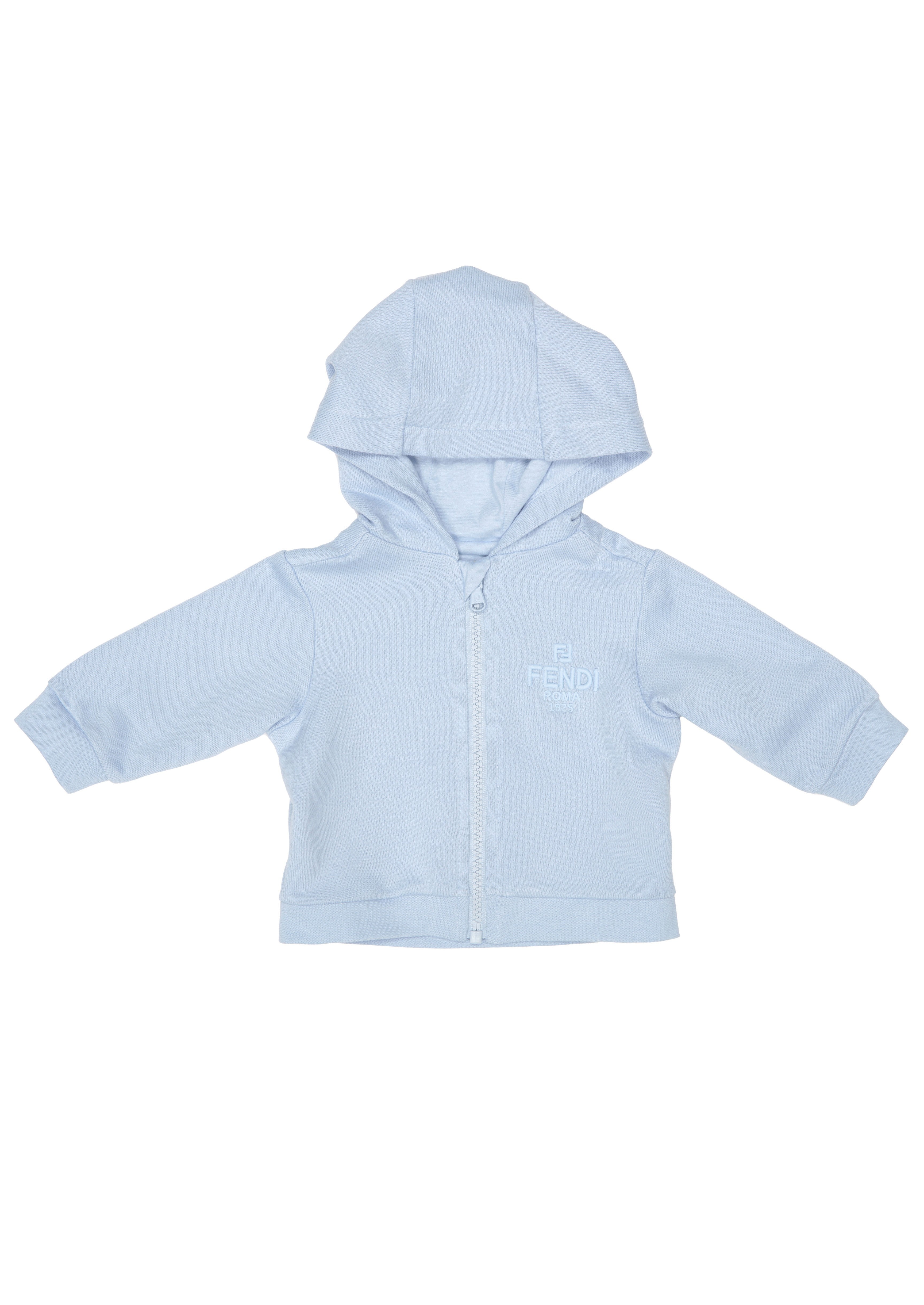 Diese hellblaue Kapuzenjacke von Fendi Kids besteht komplett aus weicher Baumwolle und ist dadurch besonders angenehm für empfindliche Babyhaut. Das leichte Innenfutter sorgt zusätzlich für Tragekomfort und ein sanftes Hautgefühl. Die tonale „FENDI ROMA 1925“-Stickerei auf der Brust setzt einen dezenten Markenakzent, ohne zu aufdringlich zu wirken. Dank durchgehendem Reißverschluss lässt sich die Jacke mühelos an- und ausziehen, während die Kapuze und die gerippten Abschlüsse für eine bequeme Passform sorgen. Ideal für den Alltag und zum Kombinieren mit Jogginghosen oder Stramplern.
