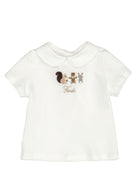 Das T-Shirt von Fendi Kids besteht aus einem weichen Baumwoll-Elasthan-Mix, der angenehm anschmiegt und viel Bewegungsfreiheit bietet. Der glatte Baumwollkragen verleiht dem Oberteil eine klassische, fast blusenartige Optik. Auf der Vorderseite befinden sich drei fein gestickte Tiermotive sowie ein dezenter Fendi-Schriftzug. Die hochwertige Stickerei sorgt für einen verspielten, aber eleganten Look. Ein Druckknopf am Rücken erleichtert das An- und Ausziehen. Perfekt für Babys und Kleinkinder, die Komfort und Stil gleichermaßen brauchen.