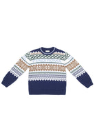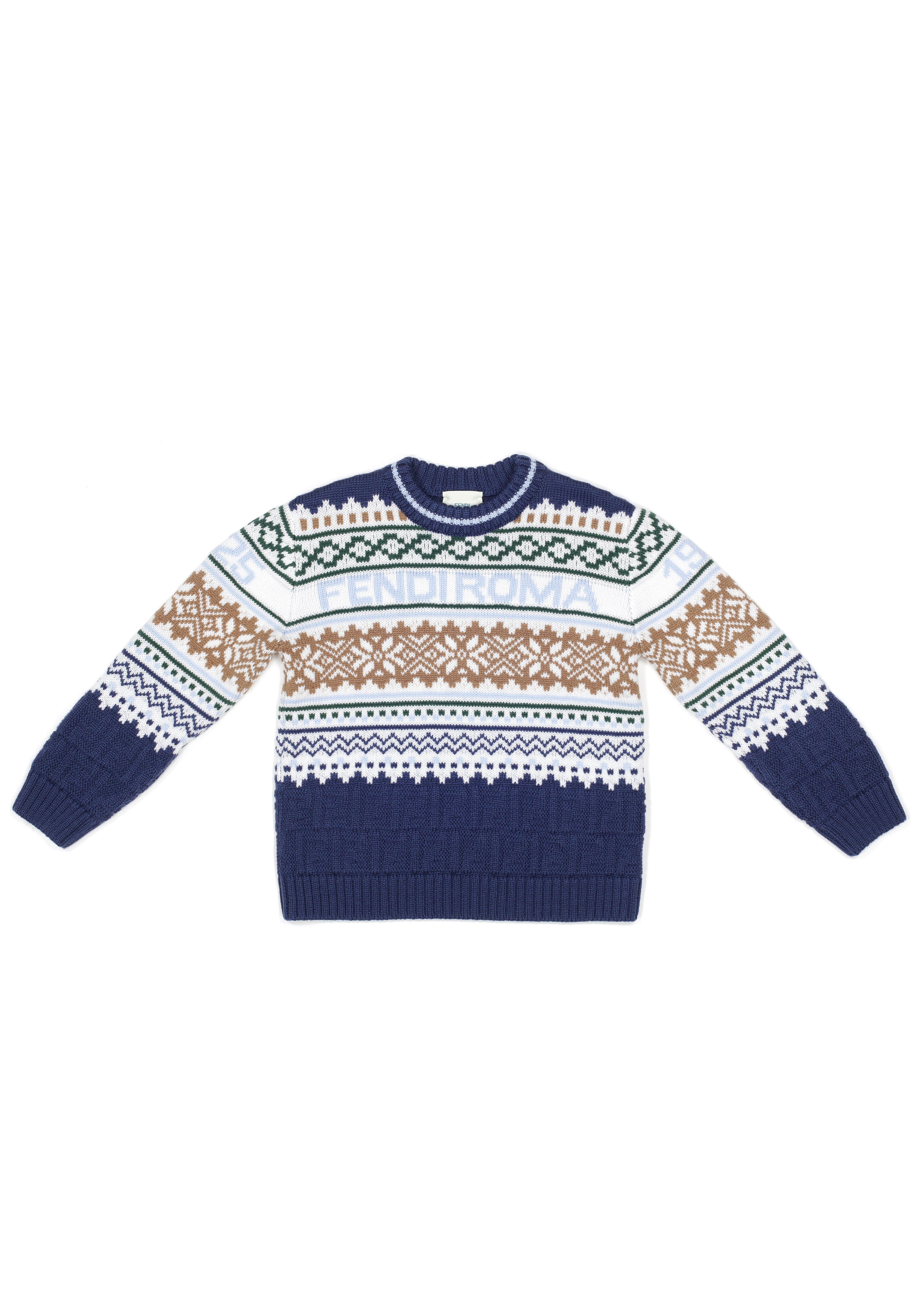 Der Wollpullover von Fendi Kids zeigt ein klassisches Fair-Isle-Strickdesign in harmonischen Blau-, Weiß-, Braun- und Grüntönen. Der „FENDI ROMA“-Schriftzug ist elegant in das Muster integriert. Reine Schurwolle sorgt für Wärme und Komfort, während die gerippten Abschlüsse für eine stabile, bequeme Passform sorgen. Ein hochwertiger Winterpullover mit ikonischem Fendi-Charakter.