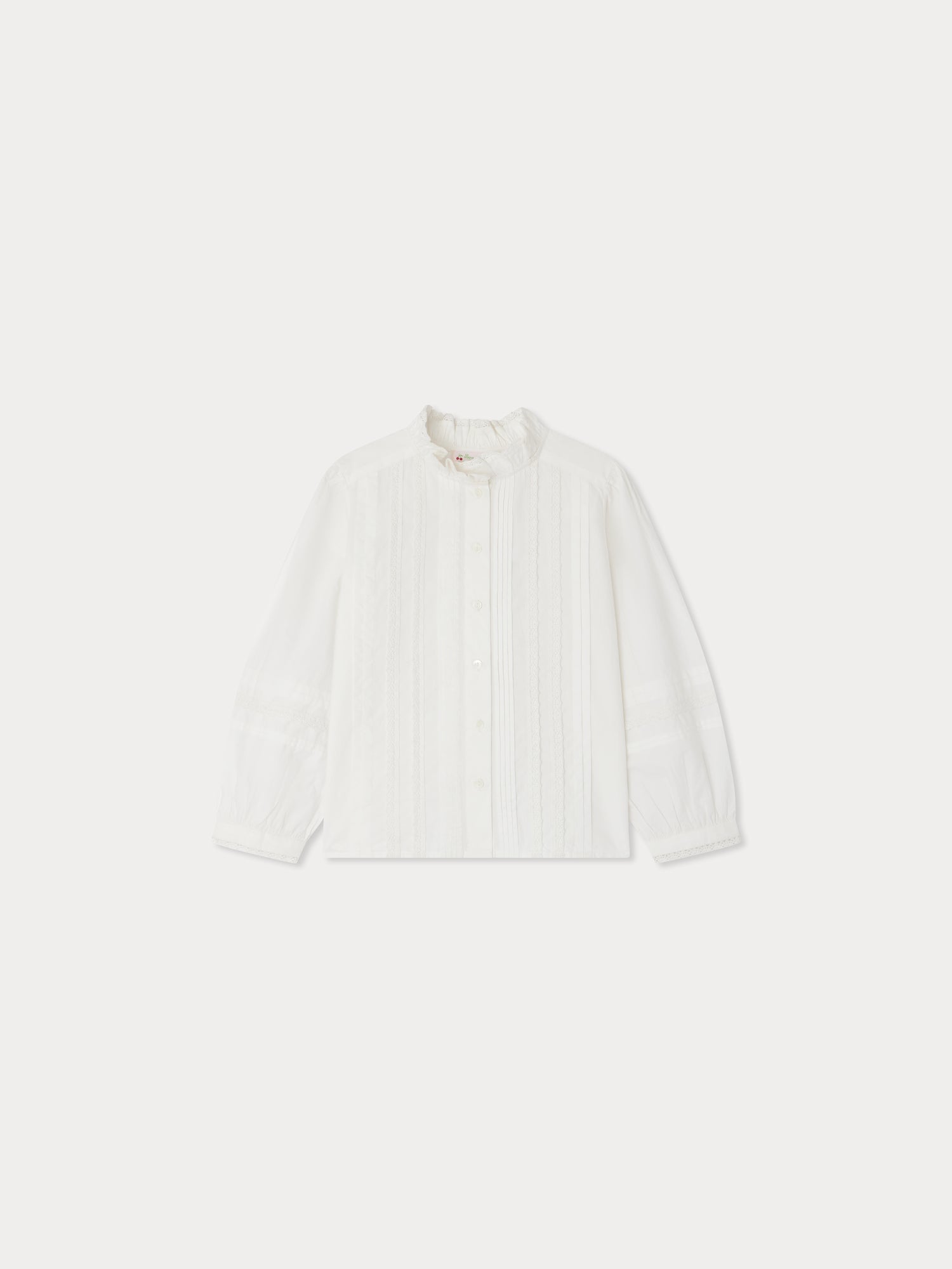 Die Bonpoint Emelia Bluse für Mädchen vereint zarte Spitze mit klassischer Eleganz. Gefertigt aus Bio-Baumwollpopeline, begeistert sie mit feinen Spitzeneinsätzen, flachen Falten und einem verspielten Stehkragen mit Rüschen. Kleine Perlmuttknöpfe auf der Vorderseite ermöglichen ein vollständiges Öffnen, während Raffungen an der Rückenpasse das Design auflockern. Ein edles Modell, das sowohl im Alltag als auch zu festlichen Anlässen überzeugt.