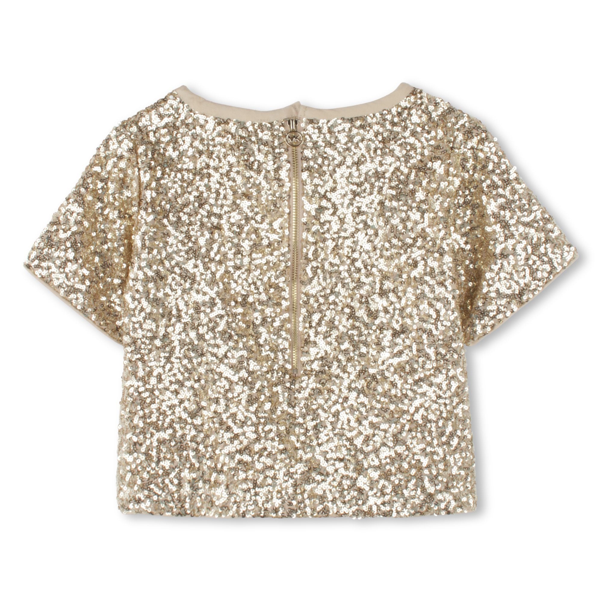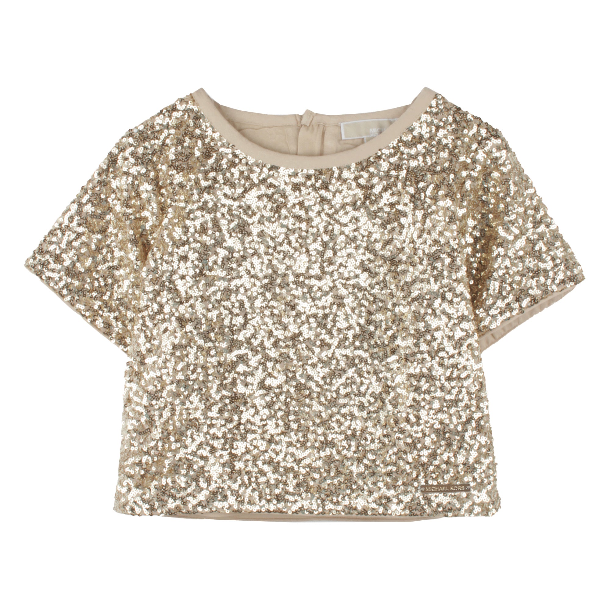Dieses glitzernde Mädchentop in Gold verleiht jedem Outfit das gewisse Etwas. Funkelnde Pailletten und ein klassischer Schnitt mit Rundhalsausschnitt und kurzen Ärmeln machen es zum idealen Begleiter für besondere Anlässe oder modische Alltagslooks. Ein praktischer Reißverschluss auf der Rückseite sorgt für einfaches An- und Ausziehen. Das weiche Material liegt angenehm auf der Haut und bietet hohen Tragekomfort. Michael Kors Kids kombiniert hier stilvolles Design mit Alltagstauglichkeit und schafft ein echtes Highlight.