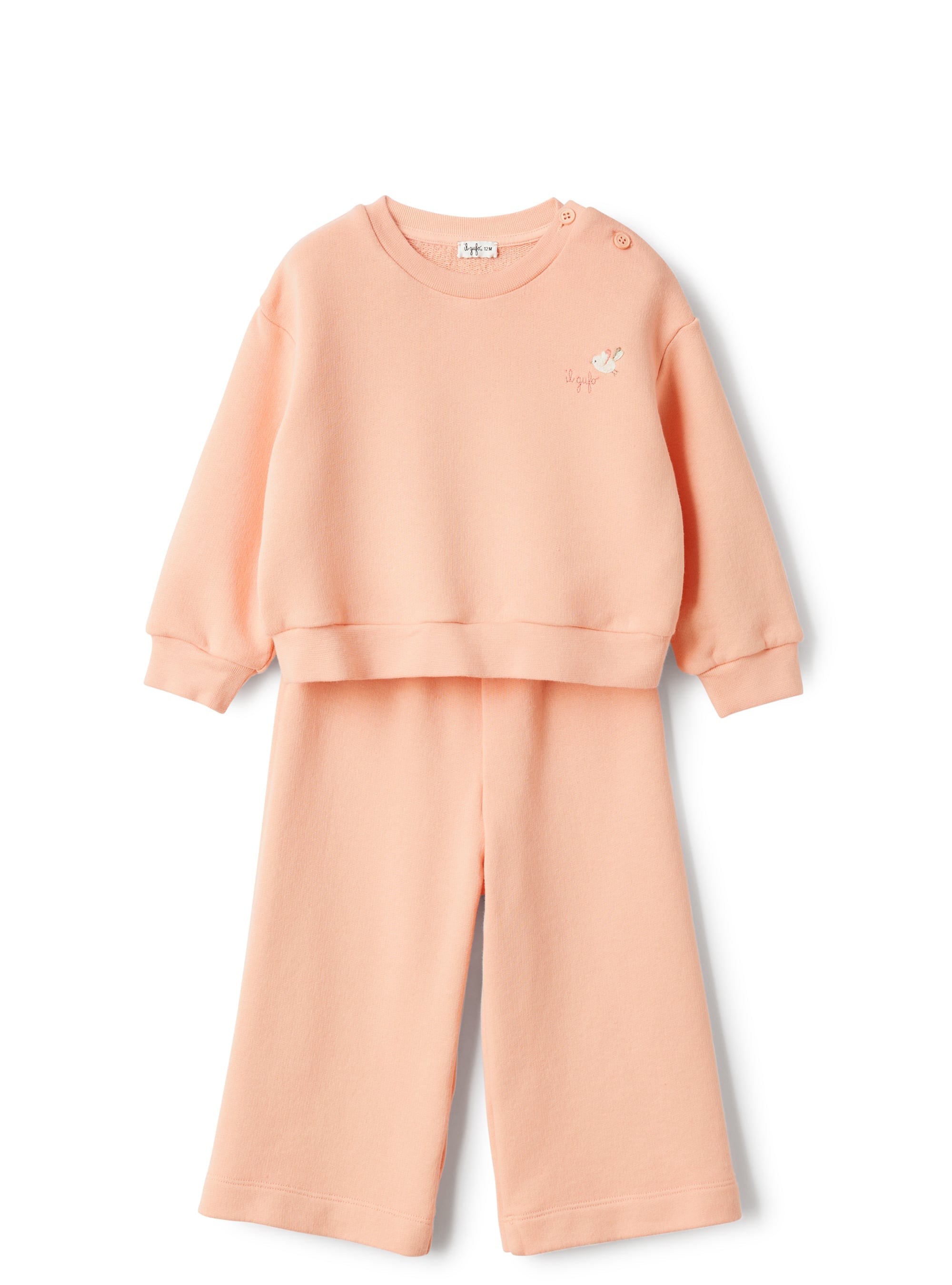 Dieses gemütliche Set von Il Gufo besteht aus einem langärmeligen Rundhalsshirt aus weichem Baumwollfleece, verziert mit einer liebevoll eingestickten Vogeldarstellung. Die dazugehörige Hose ist locker geschnitten und sorgt mit ihrem elastischen Bund für optimalen Tragekomfort und Bewegungsfreiheit. Perfekt für entspannte Tage, die sowohl stilvoll als auch bequem sind.