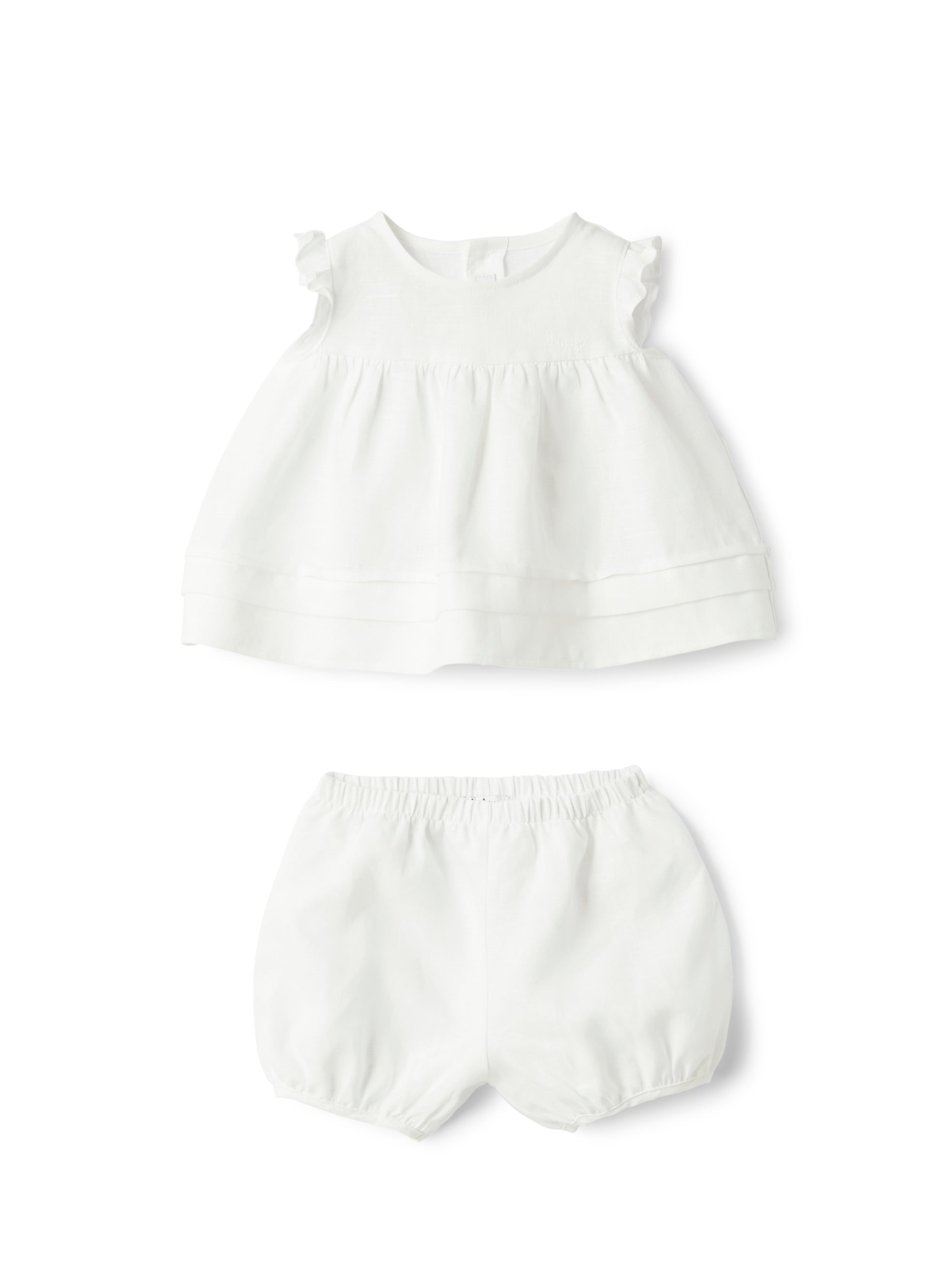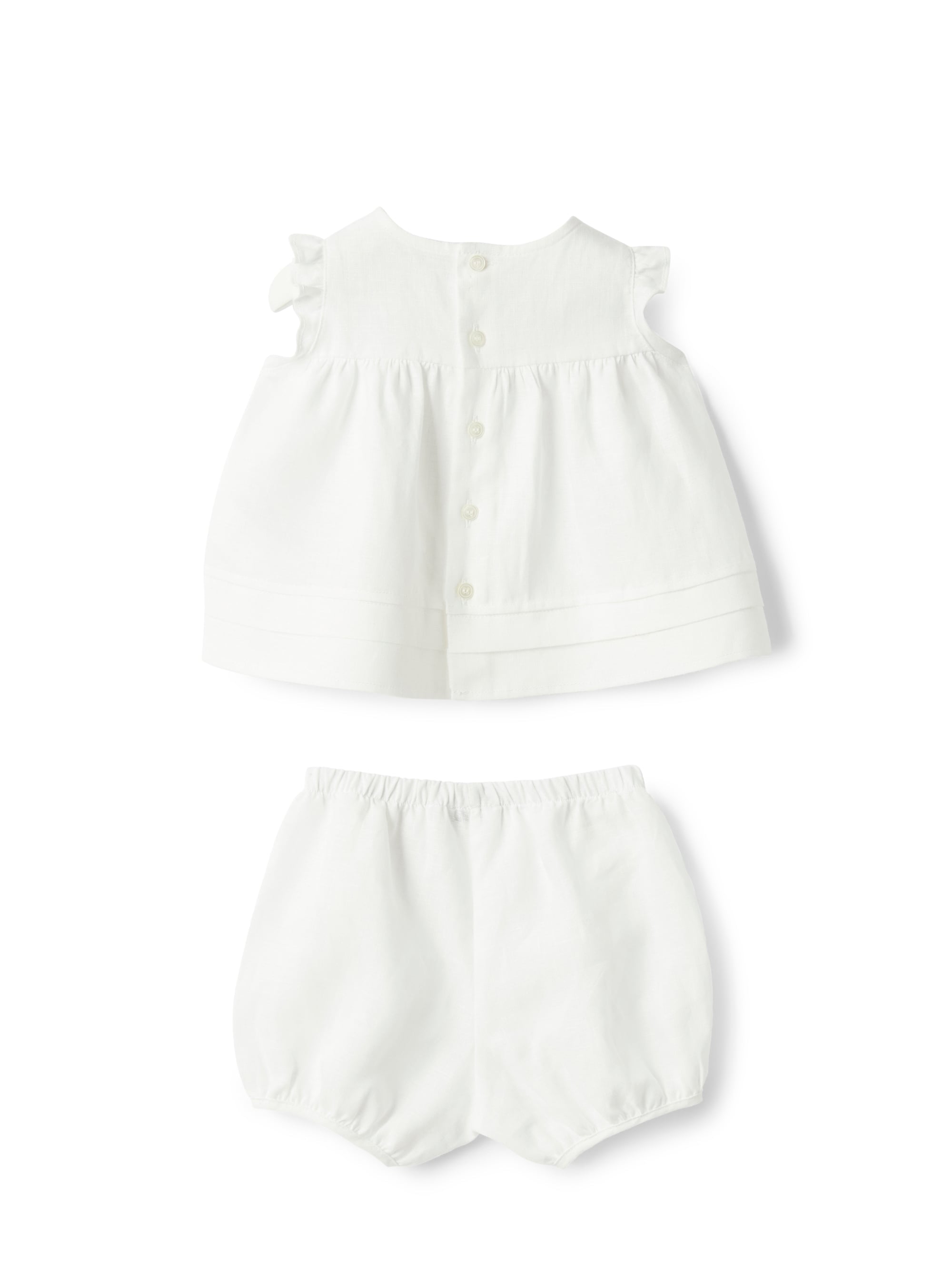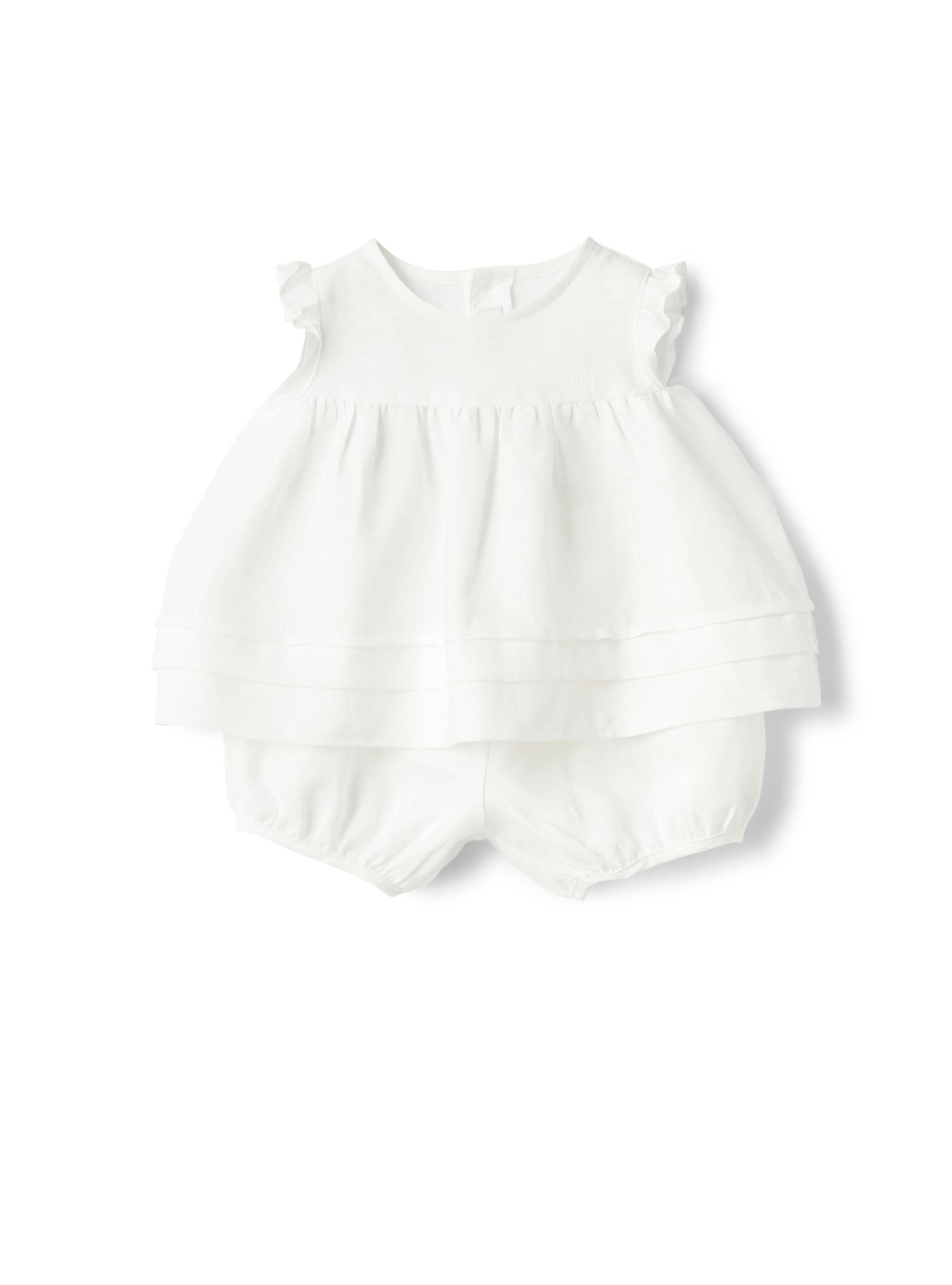 Dieses bezaubernde Babyset von Il Gufo besteht aus einem leichten Empire-Top aus Leinen, das mit einer praktischen Knopfleiste auf der Rückseite ausgestattet ist. Zarte Volants an den Ärmeln und ein plissiertes Detail am Saum verleihen dem Top eine verspielte Note. Die dazugehörigen Shorts mit elastischem Bund sorgen für hohen Tragekomfort und perfekte Bewegungsfreiheit. Ein stilvolles Set für warme Sommertage, das sowohl praktisch als auch schick ist.