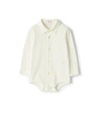 Der Il Gufo Langarm-Bodysuit aus Baumwolljersey vereint klassischen Stil mit funktionalem Komfort. Gefertigt aus hochwertigem, weichem Baumwolljersey, bietet er ein angenehmes Tragegefühl auf der empfindlichen Babyhaut. Der italienische Kragen und die durchgehende Frontknopfleiste verleihen dem Design eine elegante Hemdoptik. Knöpfe an den Ärmeln und ein praktischer Druckknopfverschluss im Schritt erleichtern das An- und Ausziehen – perfekt für Alltag und festliche Momente.