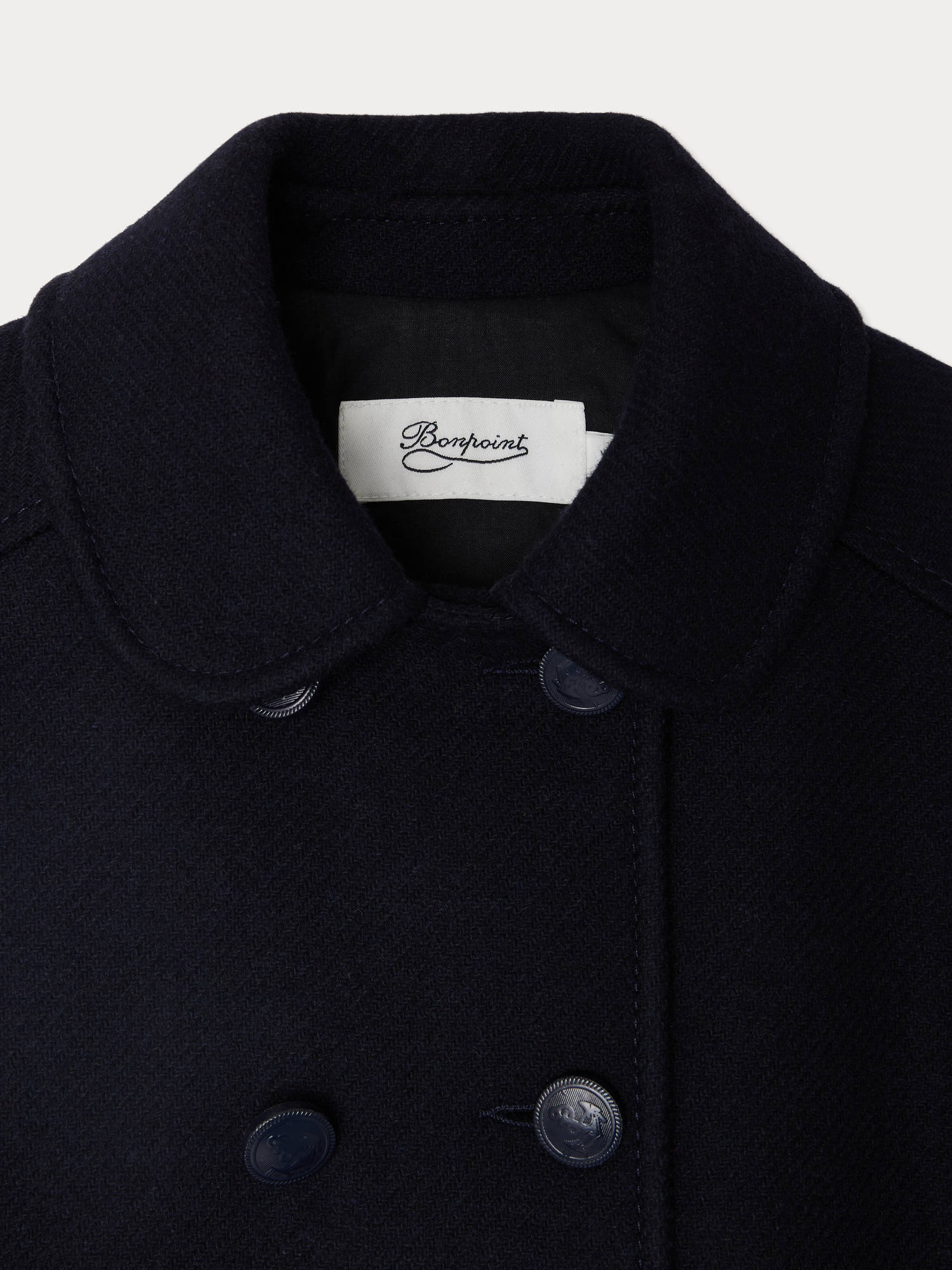 Der Bonpoint Mantel Joulia vereint stilvolle Eleganz mit funktionaler Wärme und ist damit ein unverzichtbares Kleidungsstück für die kühleren Tage. Inspiriert von klassischer Erwachsenenmode, überzeugt er durch seinen markanten spitzen Kragen und ein zeitloses Design. Gefertigt aus mehrheitlich recycelter Wolle, bietet er nicht nur hohen Tragekomfort, sondern auch einen nachhaltigen Ansatz. Die zweireihige Knopfleiste mit verzierten Knöpfen unterstreicht den edlen Charakter, während die schrägen Leistentaschen praktischen Stauraum schaffen. Auf der Rückseite runden Martingal und Schlitz das traditionelle Erscheinungsbild ab – perfekt für kleine Fashionistas, die Wert auf Stil und Qualität legen.
