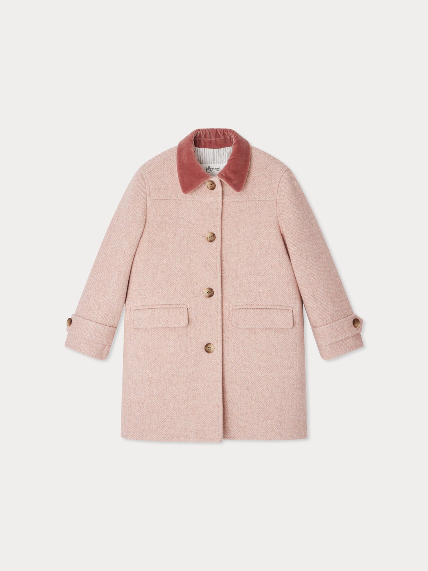 Der Bonpoint Wollmantel mit Samtkragen vereint klassische Eleganz mit modernem Charme. Gefertigt aus edlem Wollgewebe sorgt er für angenehme Wärme in der kühlen Jahreszeit. Ein besonderer Blickfang ist der kontrastierende Samtkragen in Rosé, der dem Mantel eine raffinierte Note verleiht. Praktische Details wie die Knopfleiste vorne und die seitlichen Pattentaschen machen ihn zu einem stilvollen und funktionalen Begleiter.