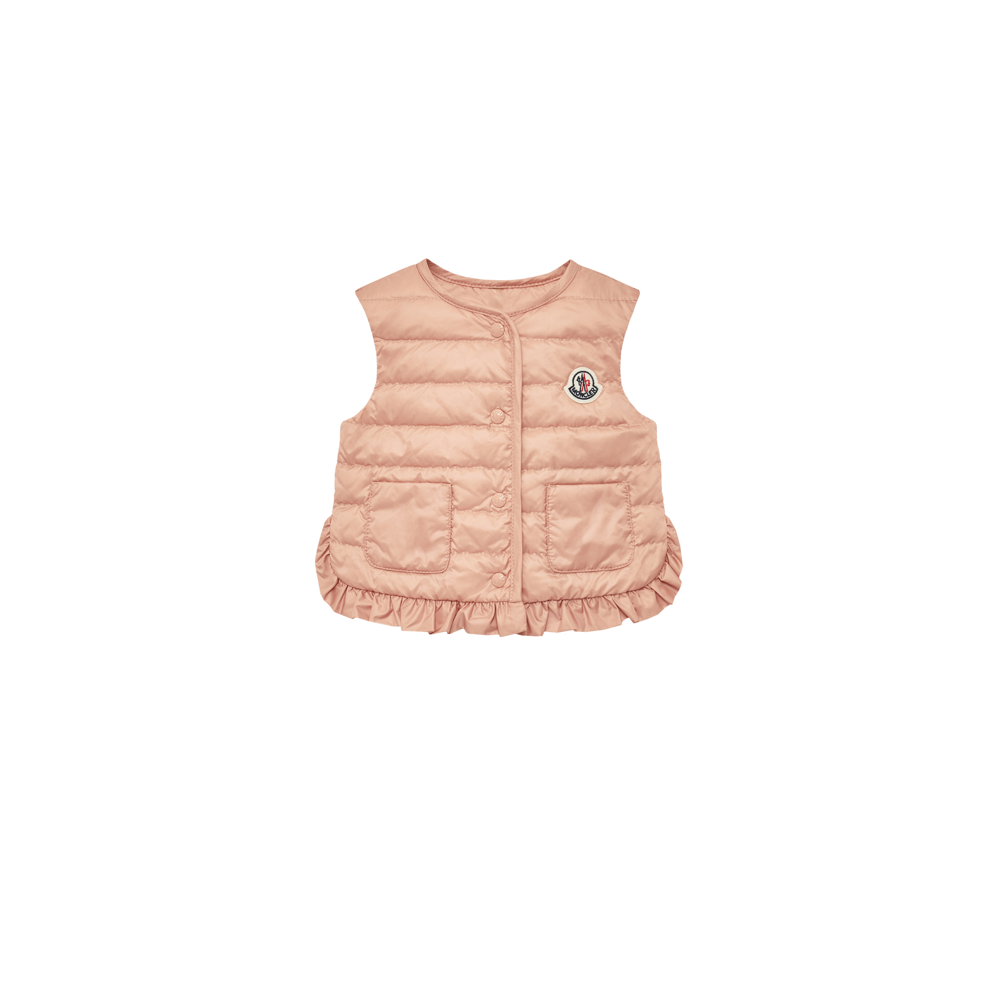 Die Moncler Enfant - Portia Weste bietet an milderen Tagen leichten Schutz. Das gestepptes Design wird durch Rüschen am unteren Rand ergänzt, die der Weste einen süßen, mädchenhaften Charme verleihen.