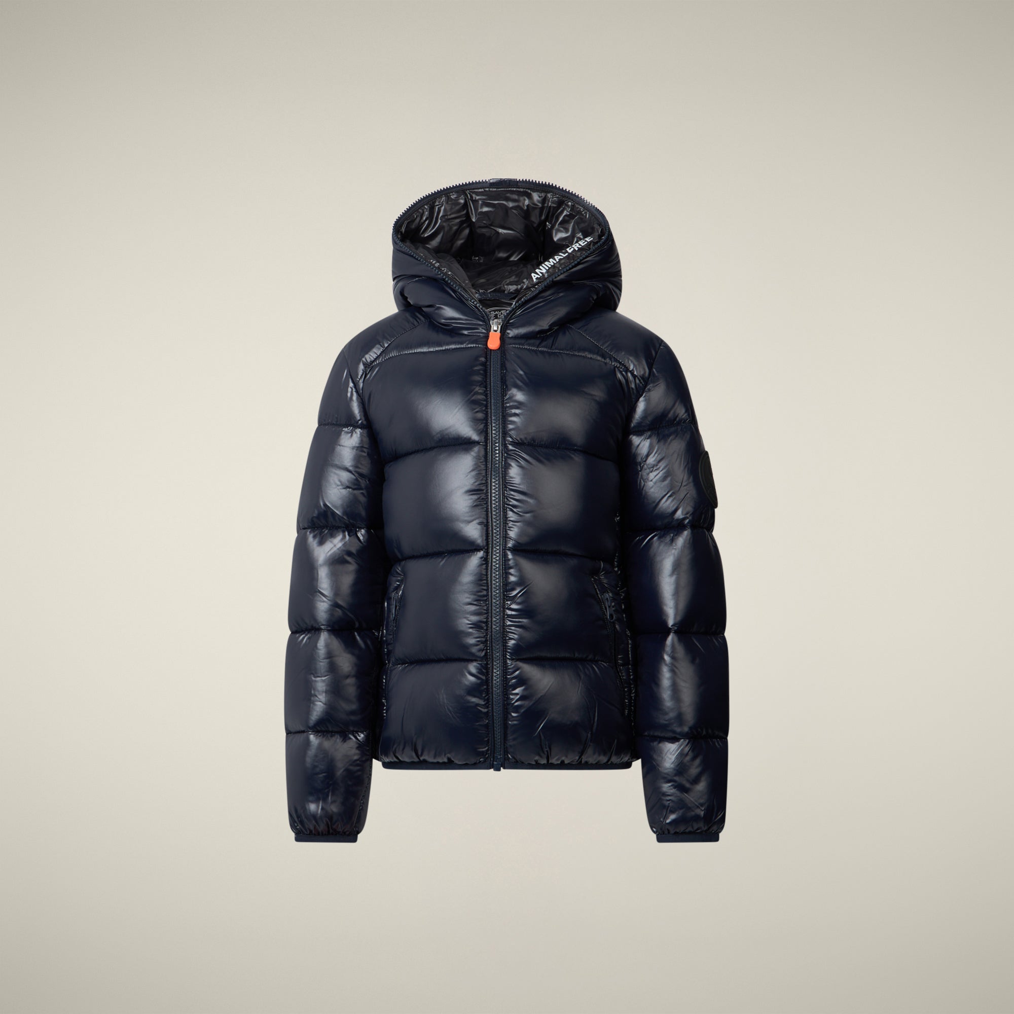 Der orangene Zipper, das ANIMAL FREE Innen-Print und das runde Logo setzen zusätzliche Akzente.