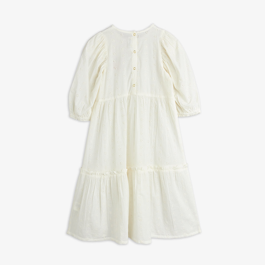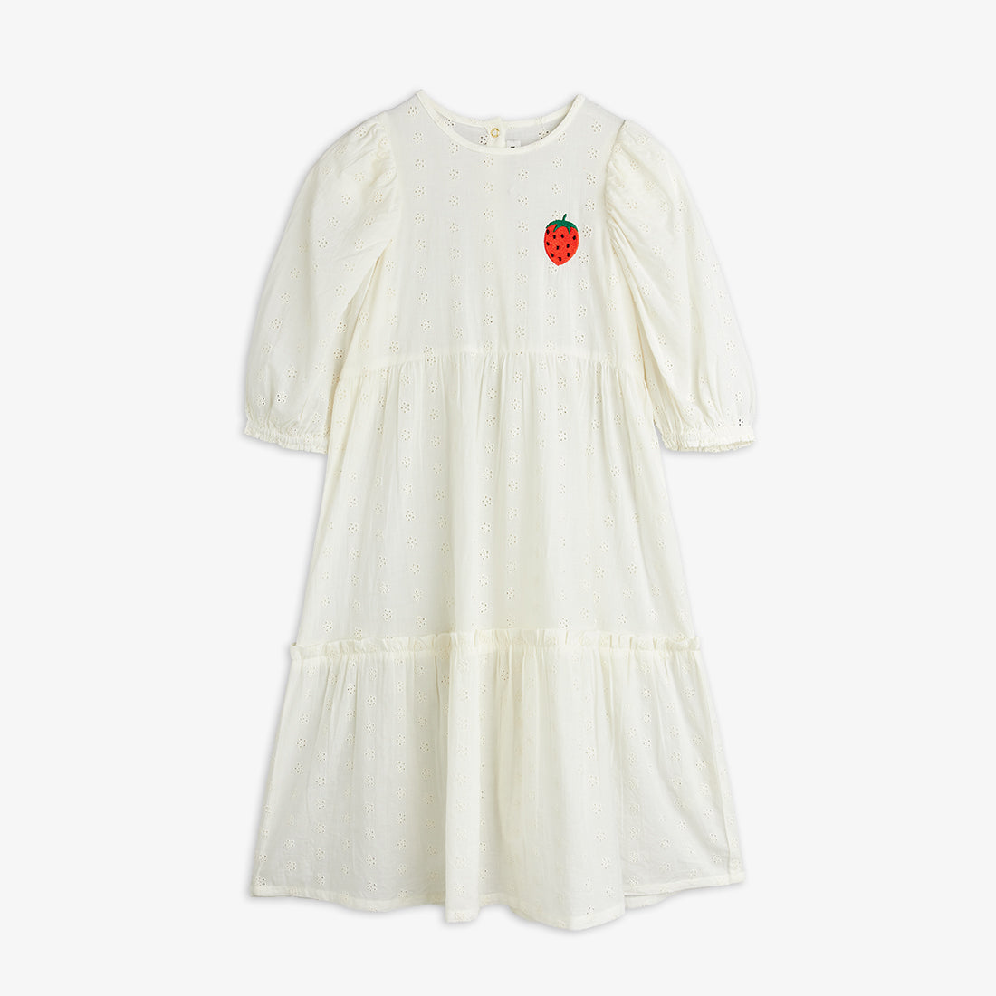Das Mini Rodini Gewebtes Kleid mit Erdbeer-Schiffli-Stickerei ist aus 100 % GOTS-zertifizierter Bio-Baumwolle im durchbrochenen Schiffli-Stil gefertigt.