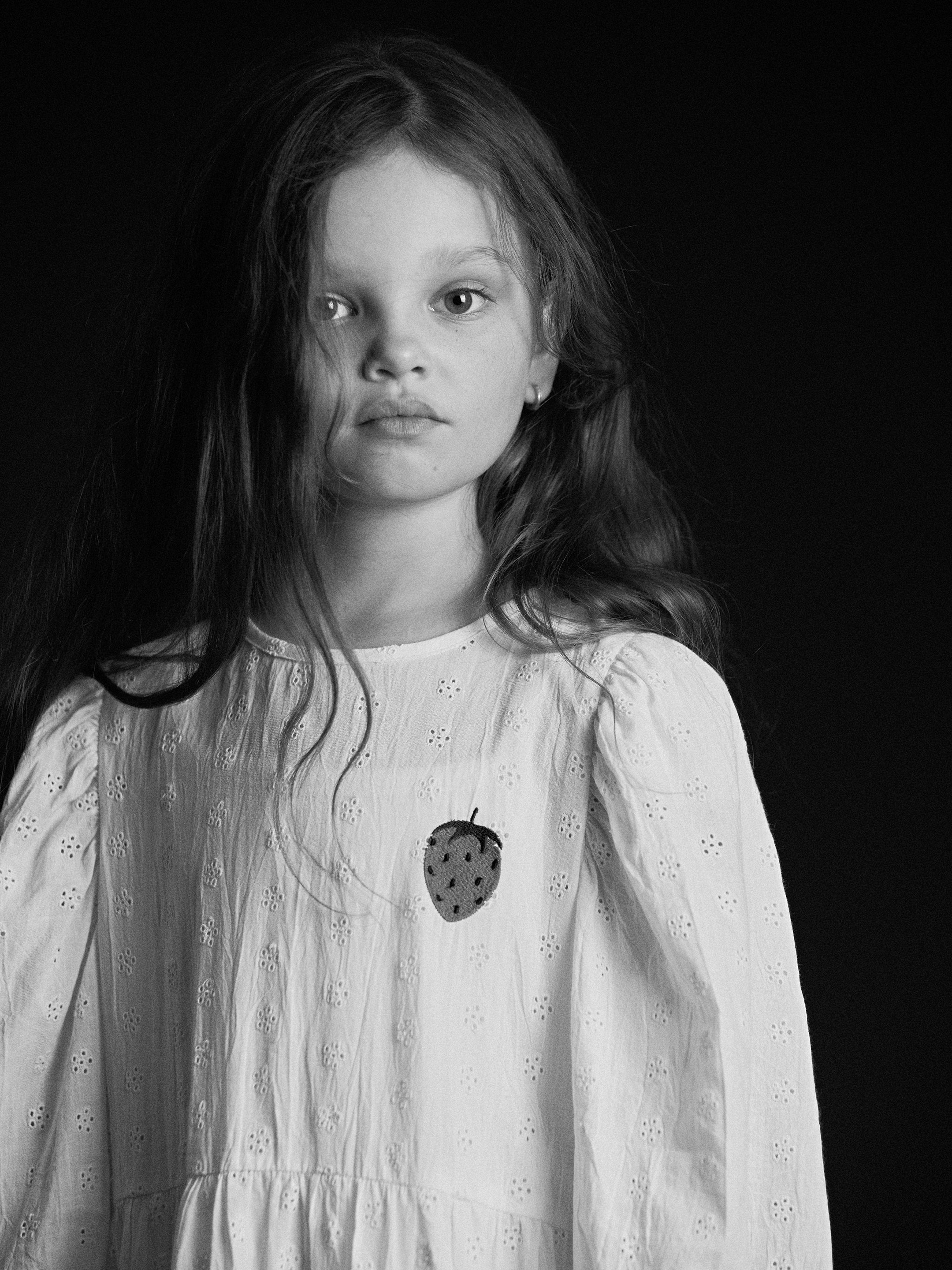 Das Mini Rodini Gewebtes Kleid mit Erdbeer-Schiffli-Stickerei ist aus 100 % GOTS-zertifizierter Bio-Baumwolle im durchbrochenen Schiffli-Stil gefertigt. Die lockere Passform wird durch zarte Puffärmel und mehrere Lagen Rüschen ergänzt. Ein gesticktes Erdbeer-Badge auf der Brust verleiht dem Design eine verspielte Note – ideal für besondere Anlässe oder warme Sommertage.