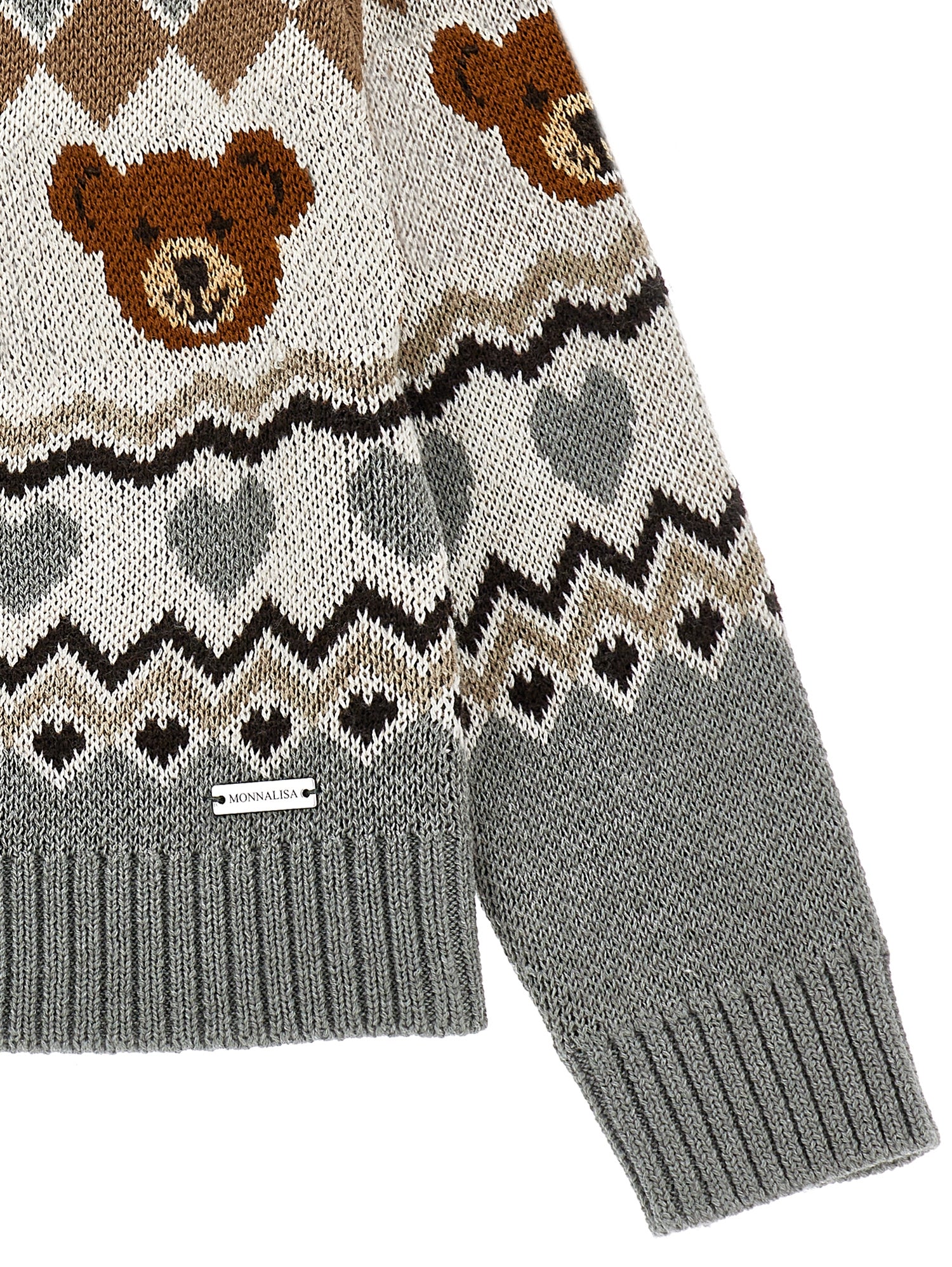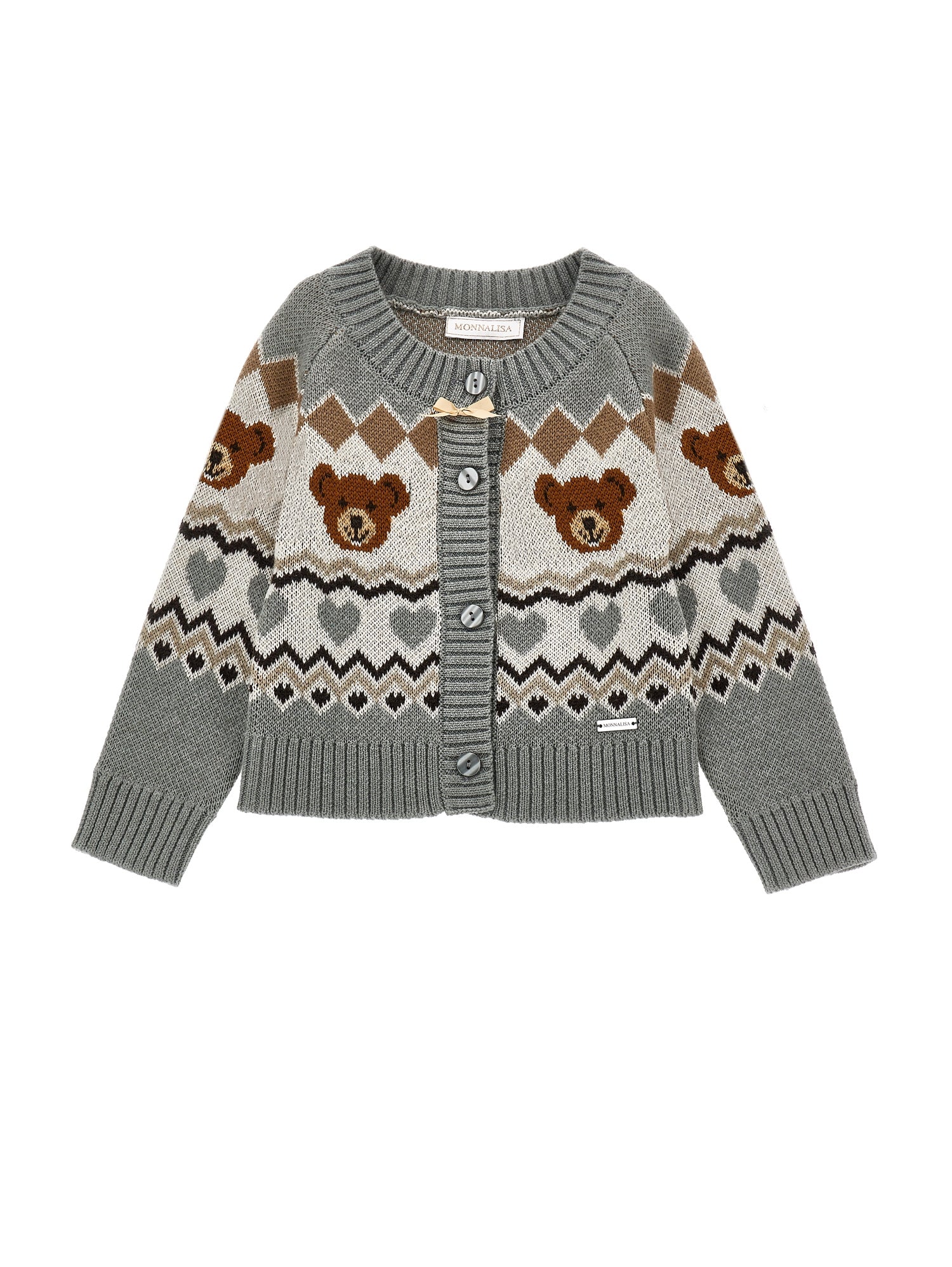 Gestrickte Monnalisa Cardigan mit Bärchenmuster in Grau und Naturtönen.