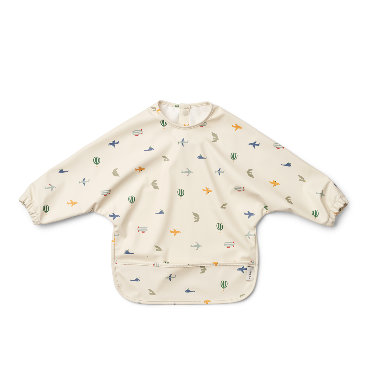Das LIEWOOD Merle Cape Lätzchen Aviator schützt die Kleidung deines Kindes bei jeder Mahlzeit oder Bastelstunde. Ausgestattet mit langen Ärmeln, elastischen Bündchen und einer großzügigen Auffangtasche bietet es rundum Schutz und höchsten Tragekomfort. Das Material aus 100 % recyceltem Polyester ist wasserabweisend, leicht und pflegeleicht – perfekt für kleine Pilot*innen in der Entdeckerphase. Der liebevolle Aviator-Print auf hellem Untergrund bringt verspielte Leichtigkeit an den Tisch.