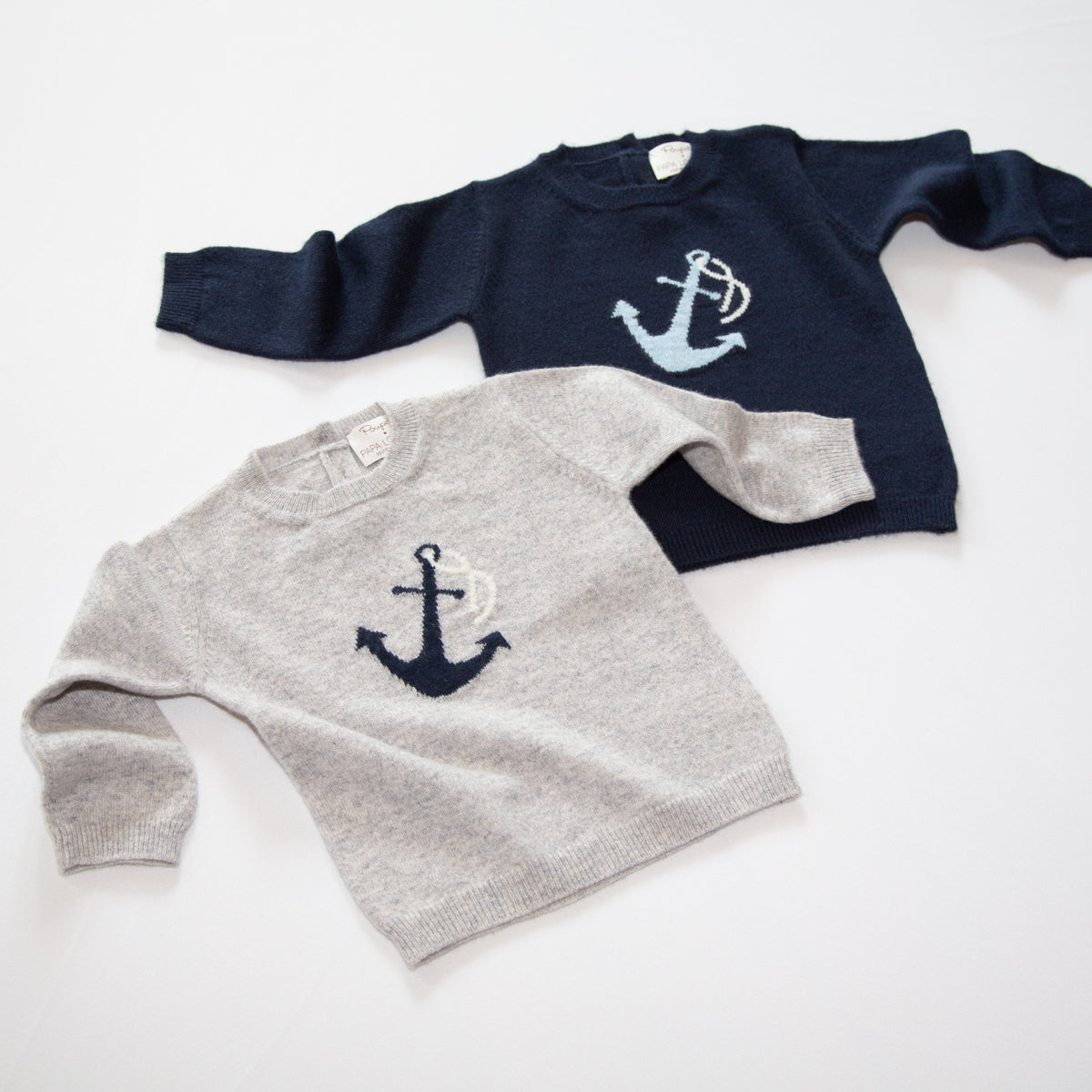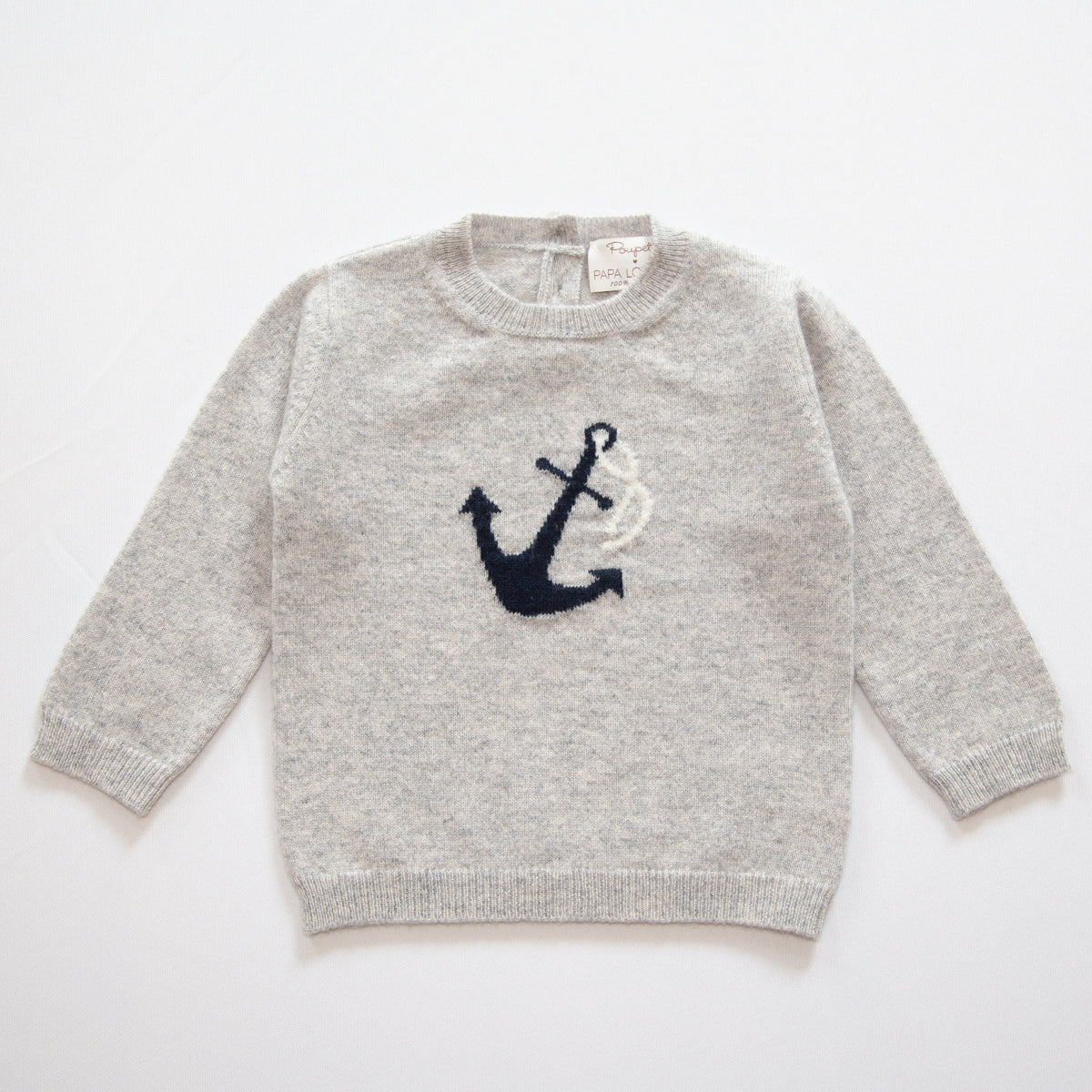 Der Papa Lobster x Poupette Kaschmir-Pullover Anker vereint maritimen Stil mit kuscheliger Kaschmirqualität. Gefertigt aus 100% Kaschmir, bietet er wohlige Wärme und höchsten Tragekomfort. Das eingestrickte Anker-Motiv in Marineblau mit Seil-Detail unterstreicht den nordischen Charakter und macht den Pullover zu einem besonderen Hingucker. Ideal für Babys und Kleinkinder – ein weiches Lieblingsstück für jeden Tag.