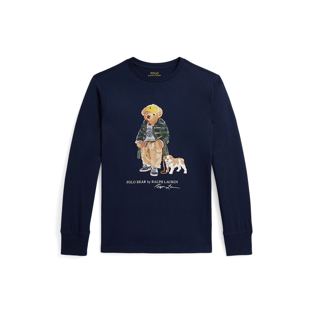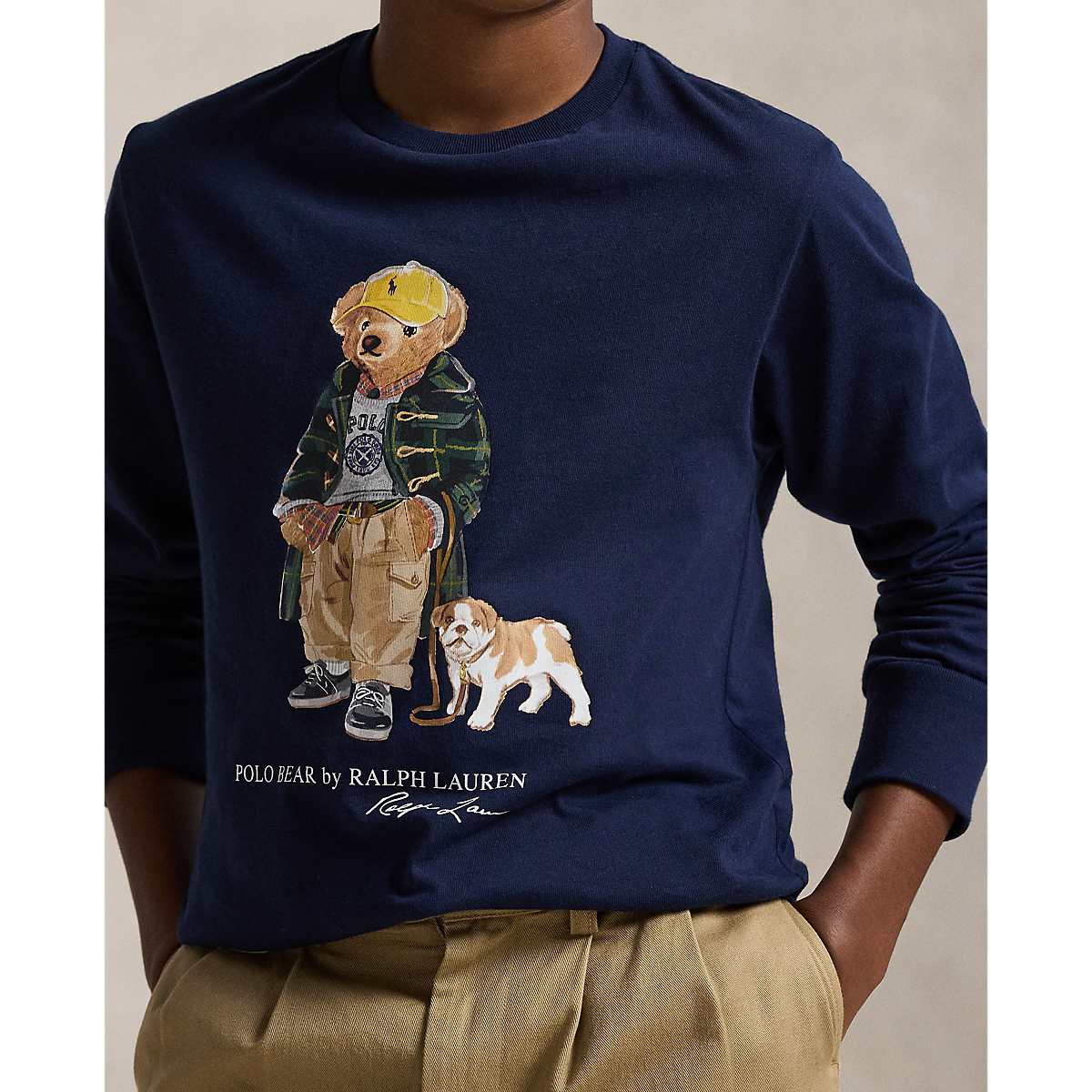 Der Polo Ralph Lauren Kids - Langarmshirt mit Polo Bär zeigt den legendären Polo Bear in einem typischen Ralph-Lauren-Outfit – stilvoll unterwegs mit einer Bulldogge. Das detailreiche Motiv macht das Shirt zu einem besonderen Hingucker im Alltag und bringt verspielten Charme in jede Kinder-Garderobe.