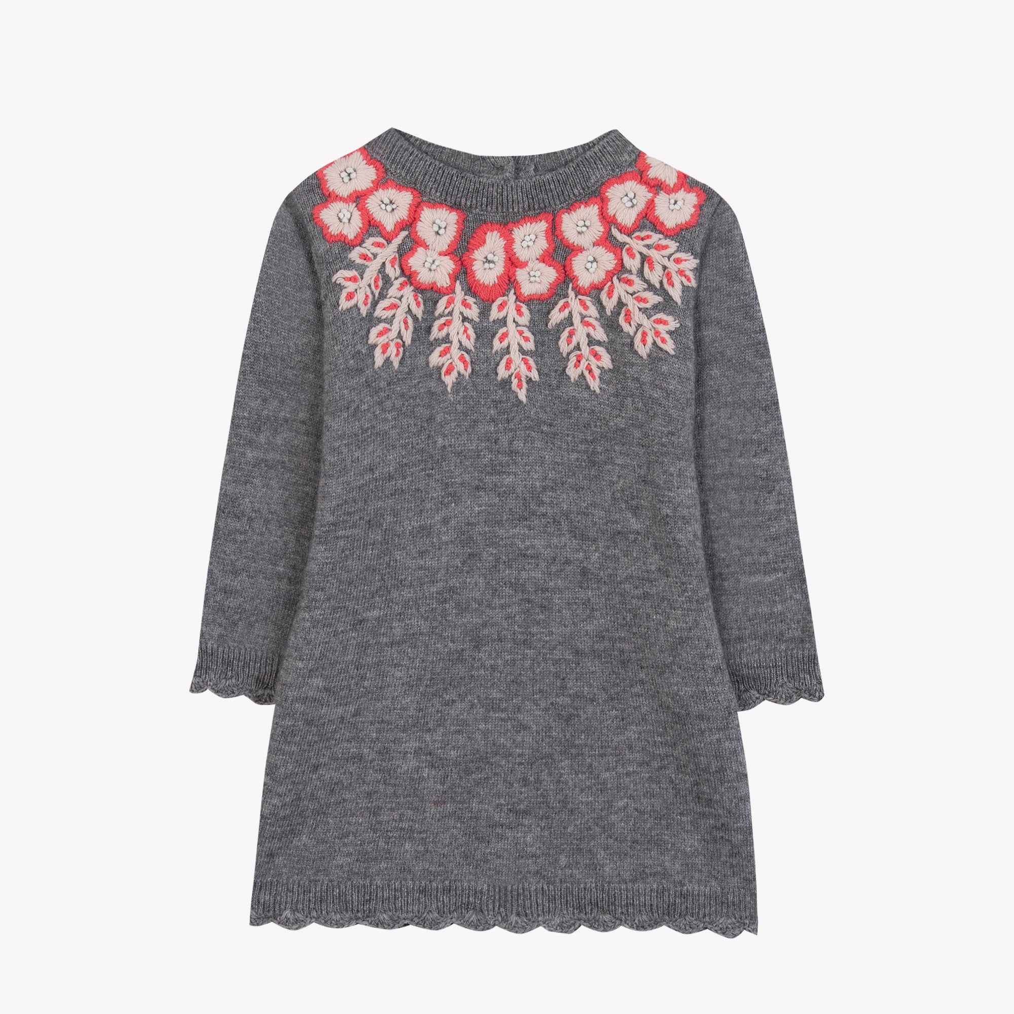 Das Tartine et Chocolat Kleid – Meliertes Mittelgrau ist ein stilvolles Winterkleid für kleine Mädchen, das durch seine hochwertige Verarbeitung und liebevollen Details überzeugt. Gefertigt aus weicher Wolle, bietet es angenehme Wärme und höchsten Komfort an kalten Tagen. Besonders charmant ist die zarte Blumenstickerei am Kragen in sanften Pralinentönen, die dem Kleid eine poetische und raffinierte Ausstrahlung verleiht. Mit seinen langen Ärmeln und dem klassischen Schnitt ist dieses Kleid die perfekte Wahl für elegante Auftritte in der kalten Jahreszeit.