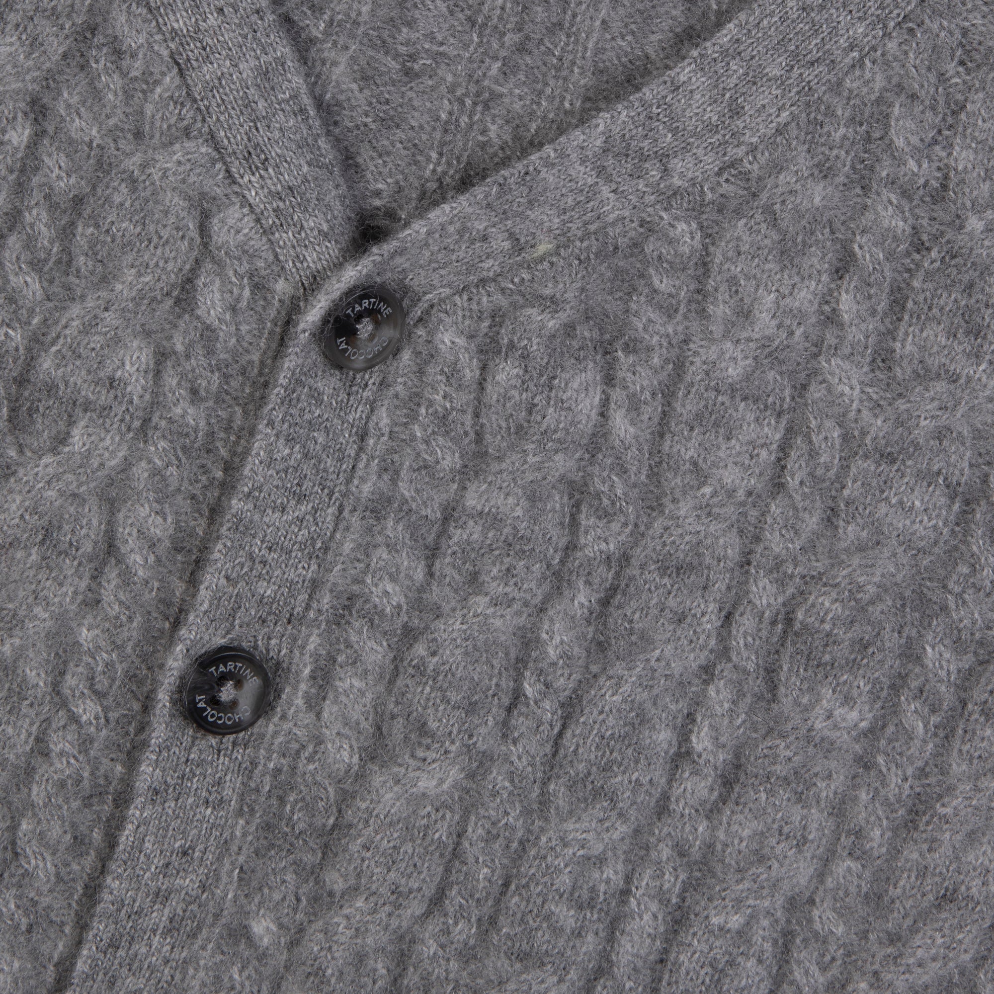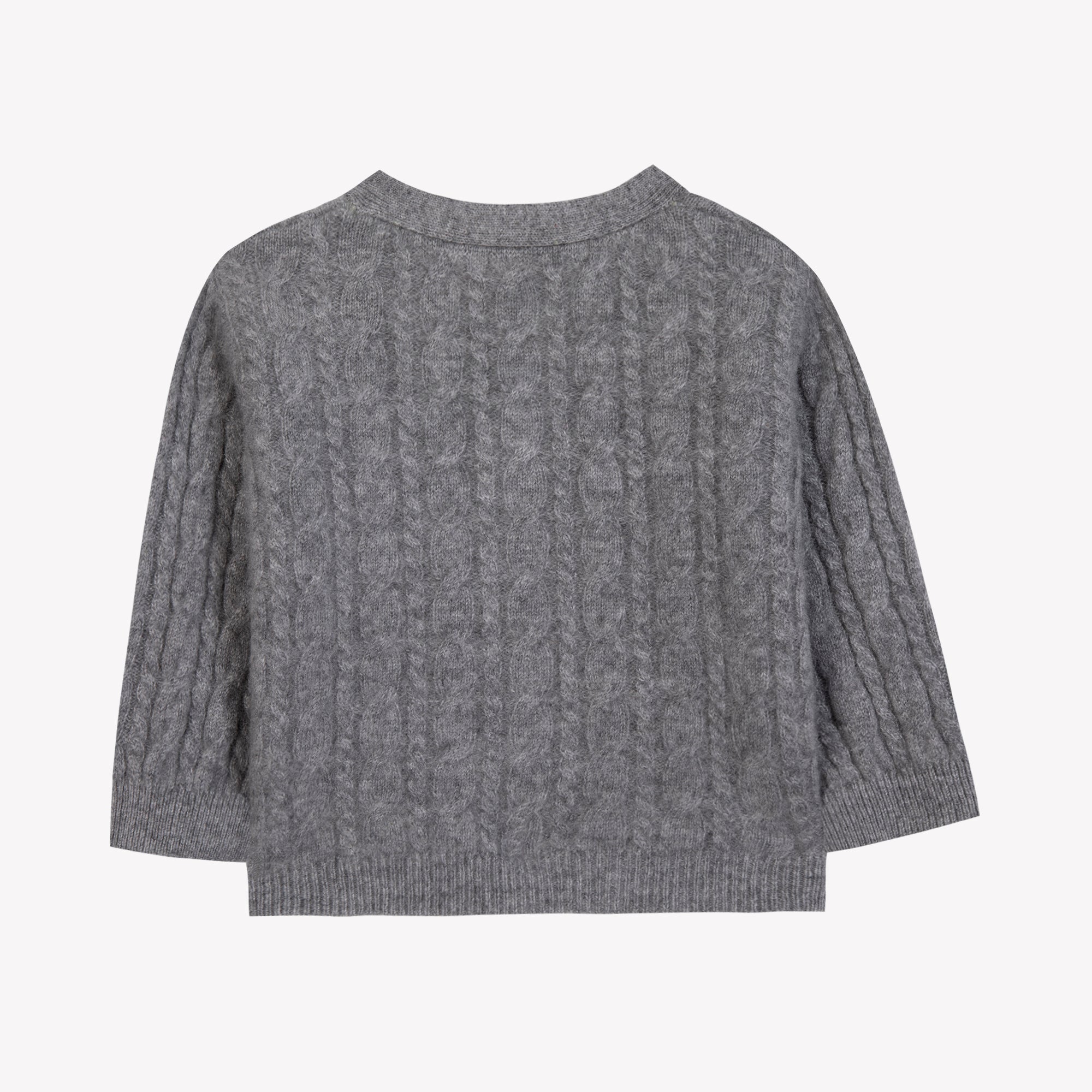 Der Tartine et Chocolat Cardigan – Graumeliert besticht durch sein elegantes Zopfmuster und die weiche, luxuriöse Struktur aus reinem Kaschmir. Der klassische V-Ausschnitt und fein gearbeitete Knöpfe verleihen dem Strickstück ein gepflegtes, zeitloses Finish. Ideal für den Alltag oder festliche Anlässe – diese Weste verbindet Wärme, Komfort und Raffinesse und rundet die Outfits kleiner Kinder stilvoll ab.