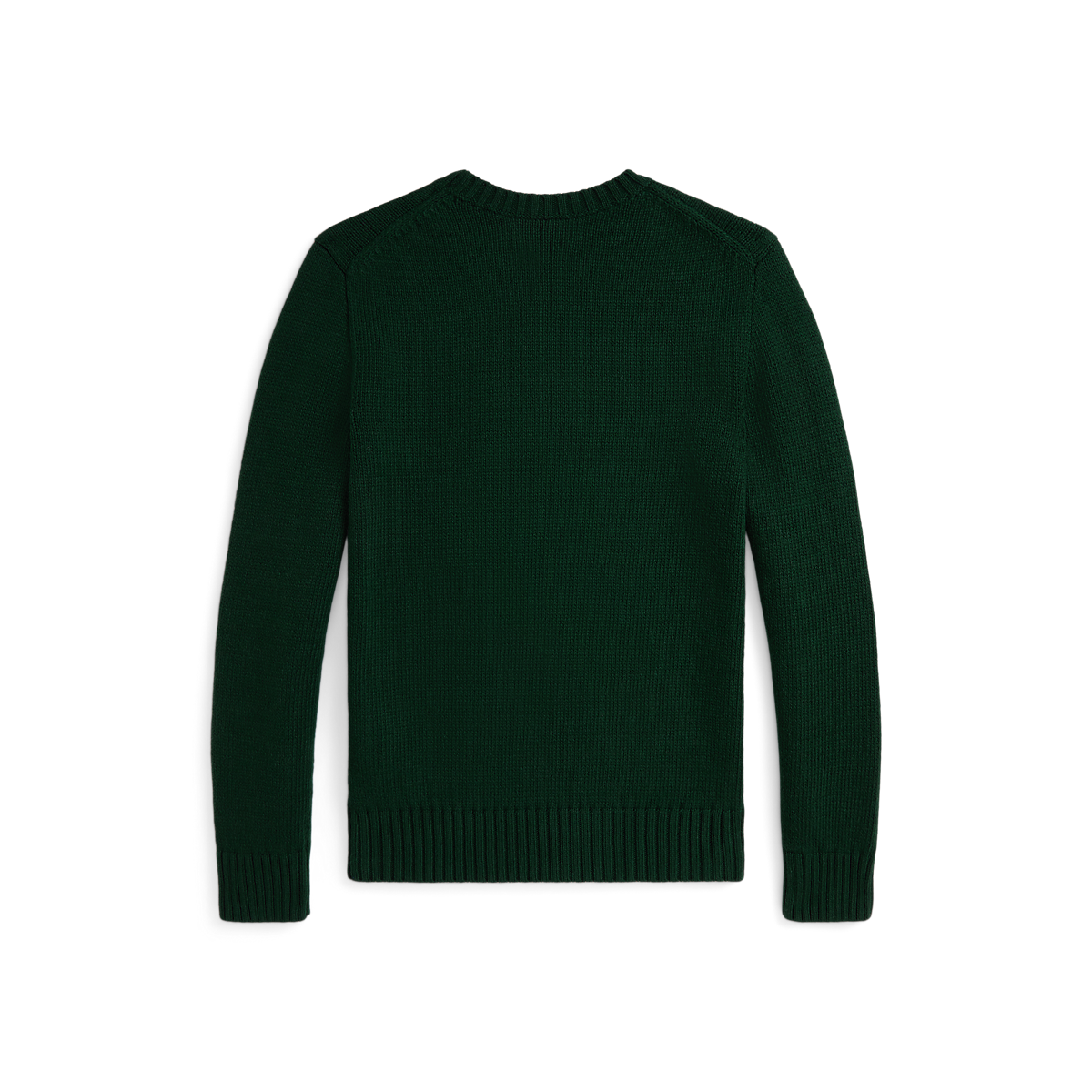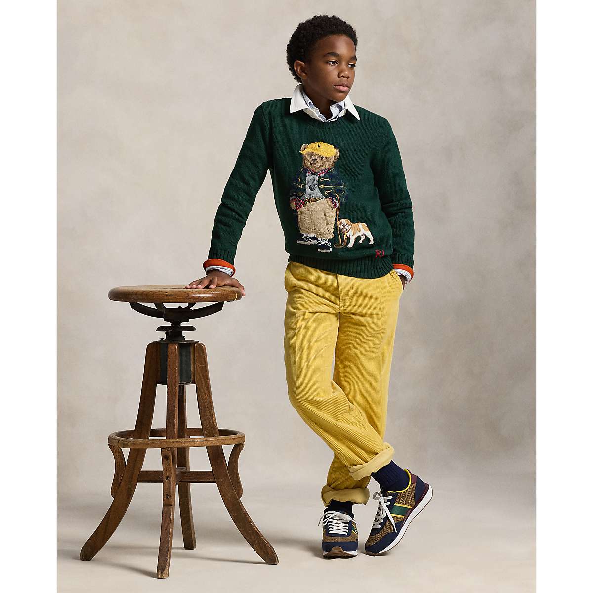 Der Polo Ralph Lauren Kids - Pullover mit Polo Bär zeigt den legendären Polo Bear in einer detailreichen Szene: gekleidet in ein klassisches Ralph-Lauren-Outfit und begleitet von einer Bulldogge. Das Motiv besteht aus über 20 verschiedenen Garnen und verleiht dem Rundhalspullover einen hochwertigen, verspielten Look. Ein echtes Highlight für stilbewusste Kinder.