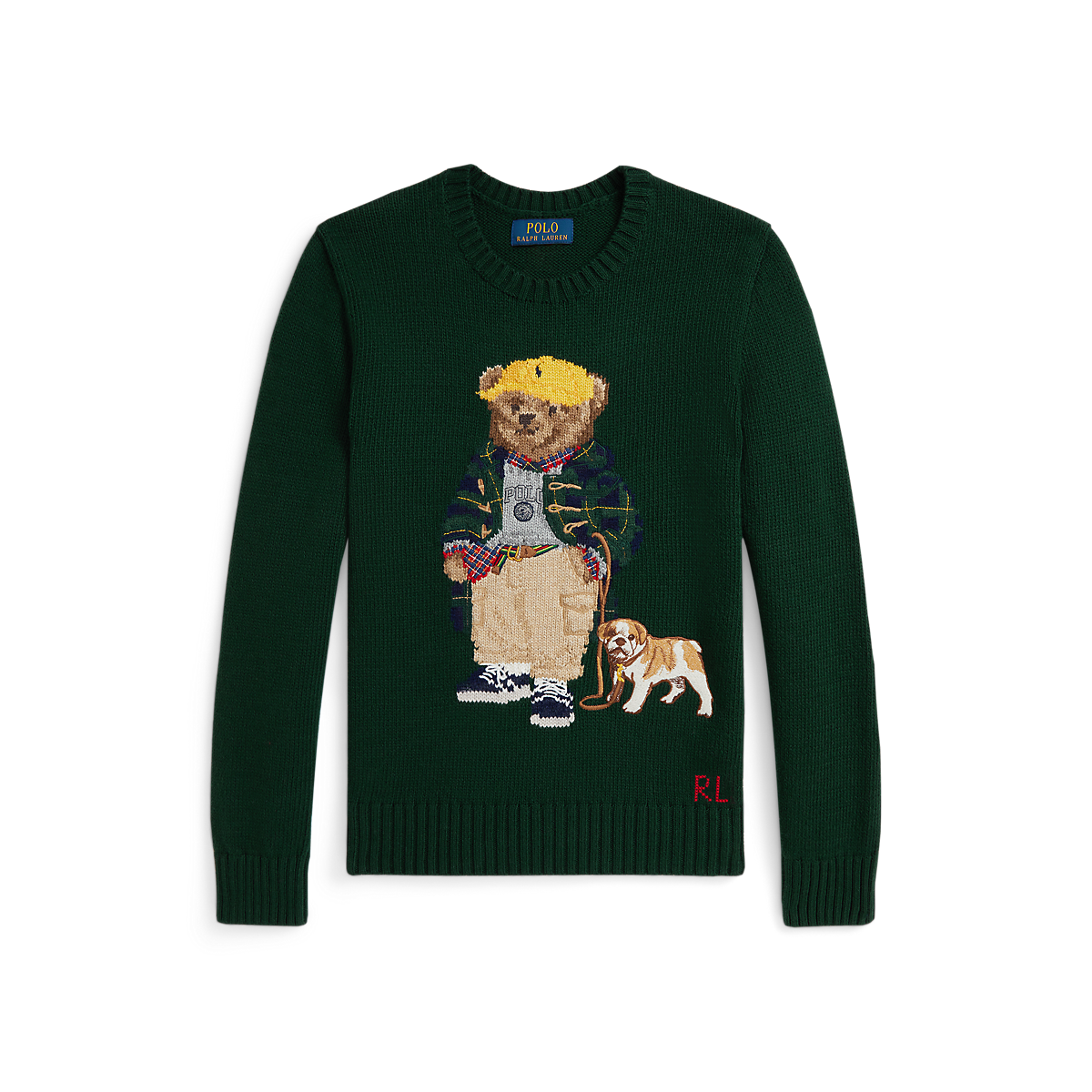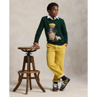 Der Polo Ralph Lauren Kids - Pullover mit Polo Bär zeigt den legendären Polo Bear in einer detailreichen Szene: gekleidet in ein klassisches Ralph-Lauren-Outfit und begleitet von einer Bulldogge.