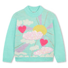 Der Billieblush Pullover ist ein süßer Strickpullover in leuchtendem Mintgrün mit einem spielerischen Allover-Motiv aus Sonnen, Wolken, Herzen und Glitzer. Perfekt für kleine Fashionistas, die sich gerne trendig und verspielt kleiden!