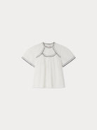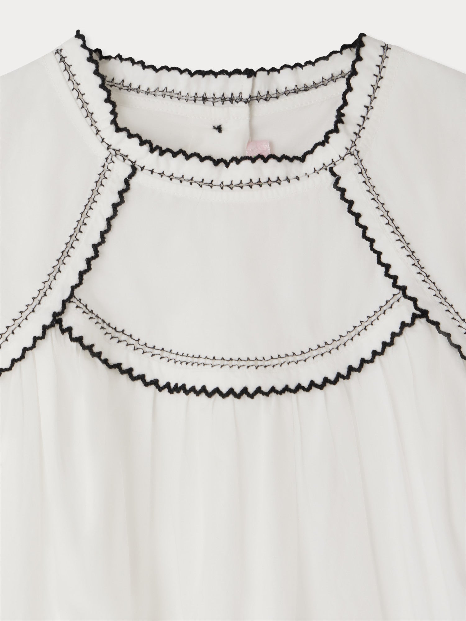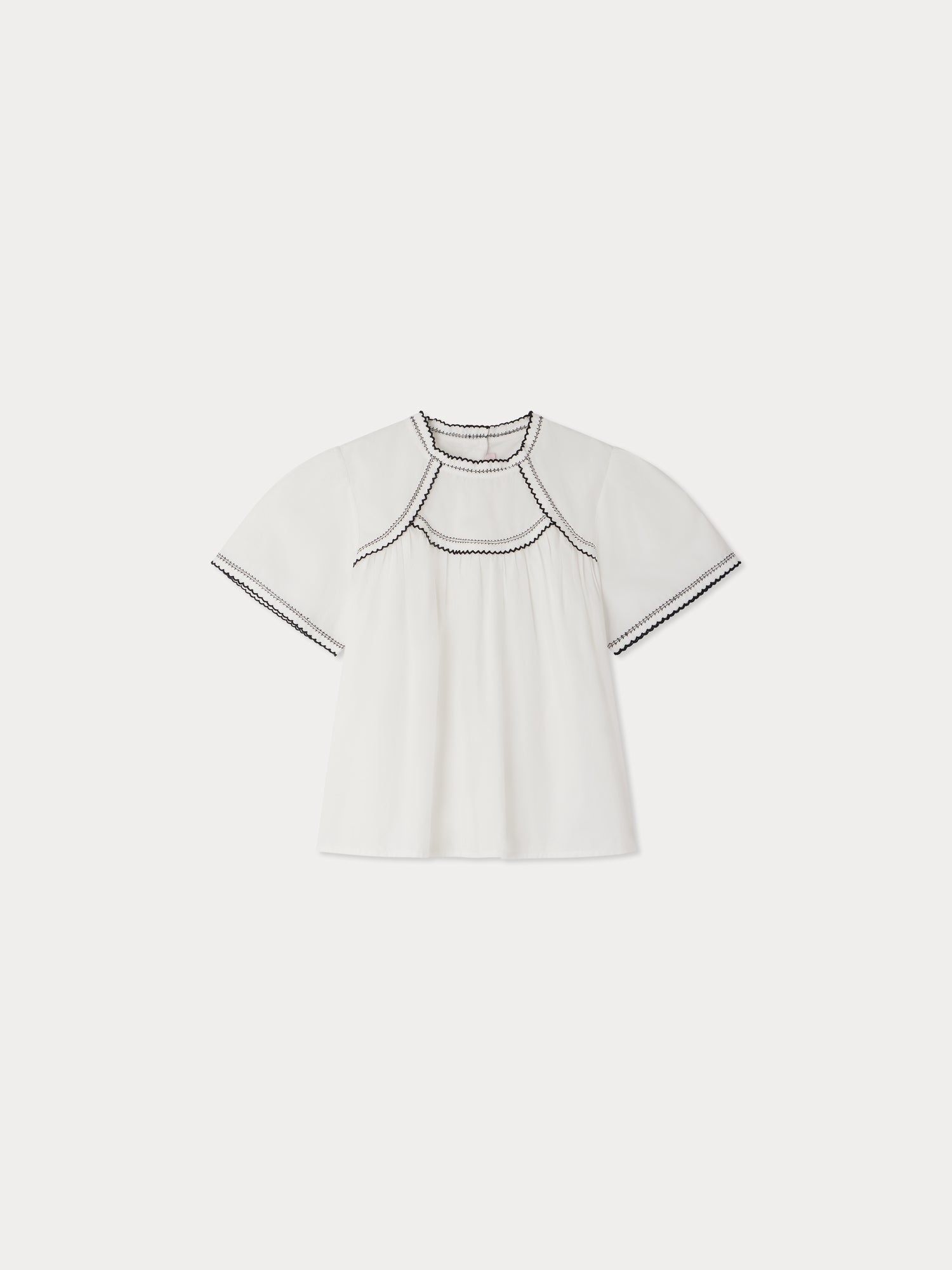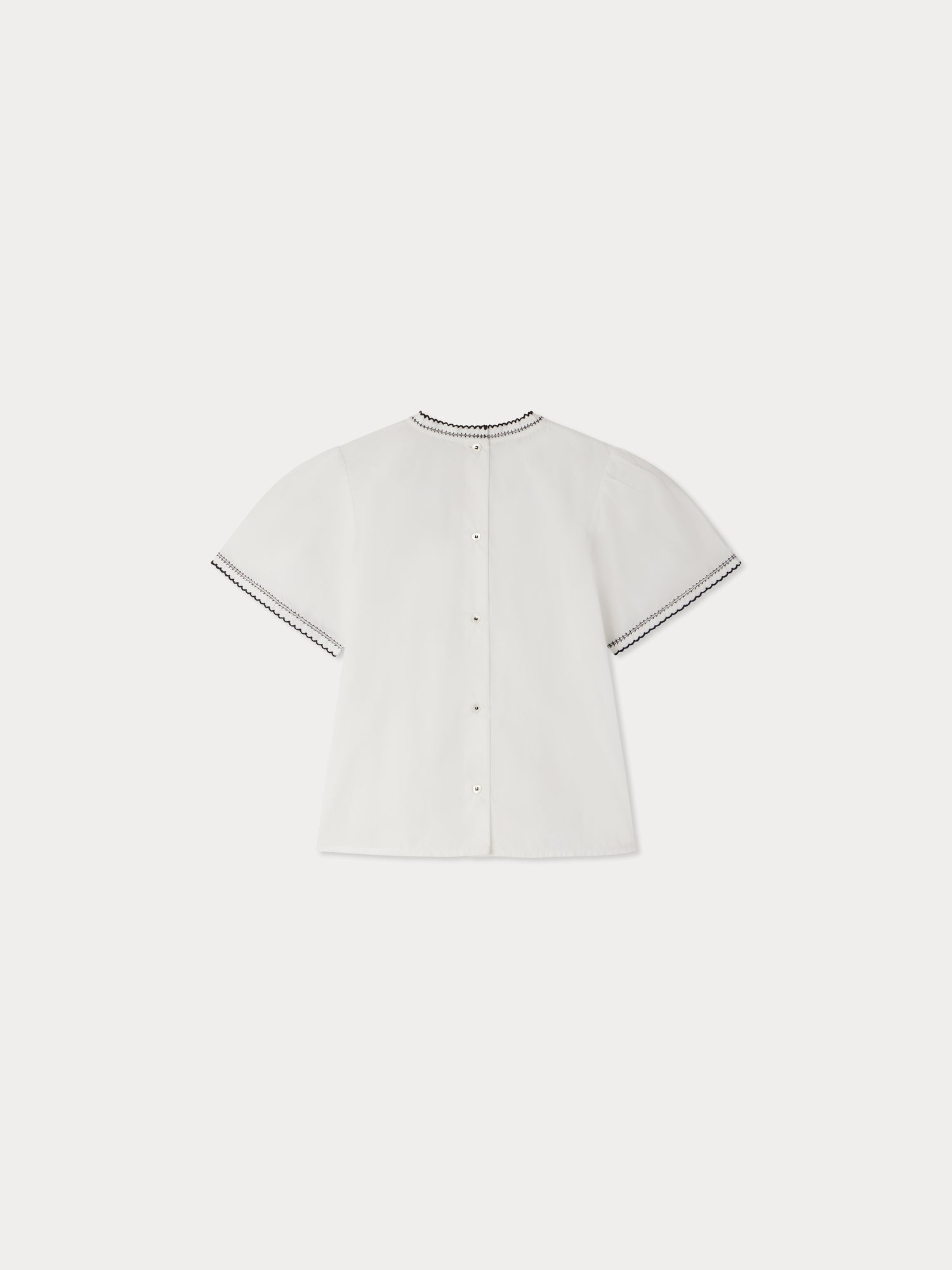 Entdecke zeitlose Eleganz mit der Bonpoint Bluse Eldoradie. Diese weiße Bonpoint Bluse ist mit einer schwarzen Umrandung versehen und besticht durch Leichtigkeit. Ein klassisches und vielseitiges Kleidungsstück für jeden Anlass.