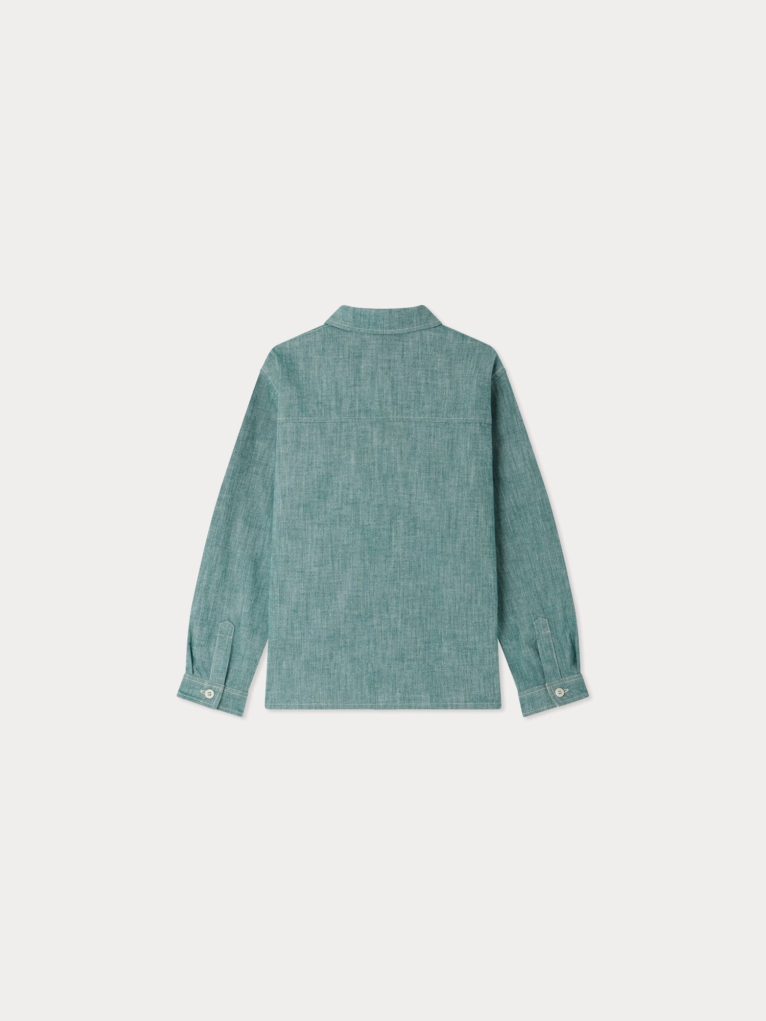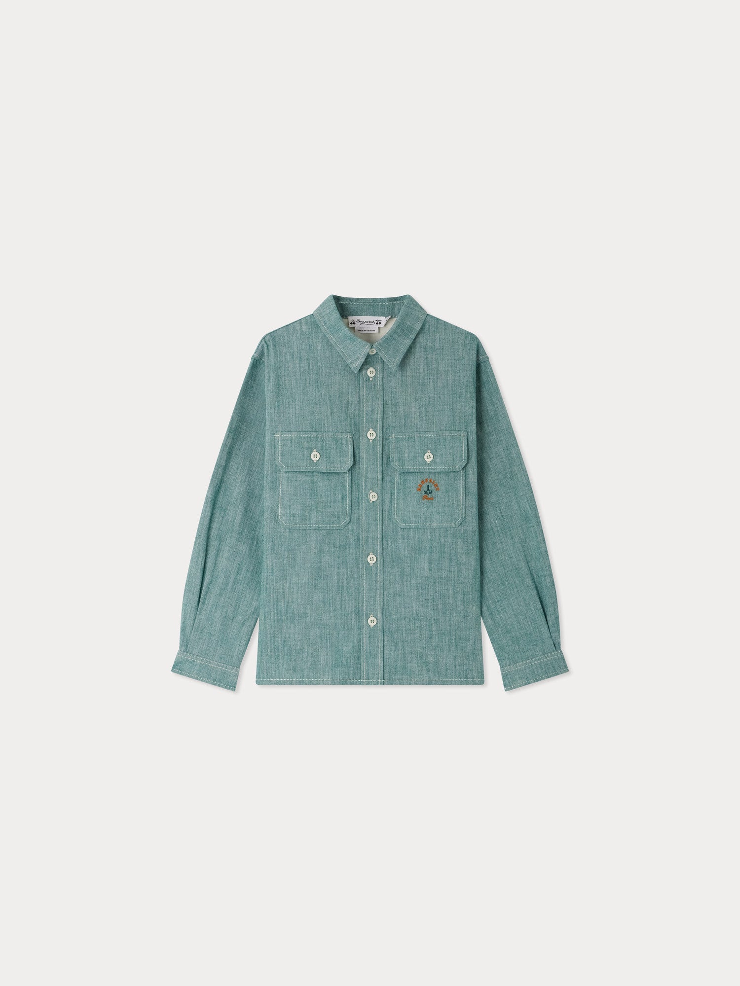 Das Bonpoint - Hemd Eddy für Jungen aus zertifiziertem Bio-Baumwoll-Chambray überzeugt mit zwei geknöpften Pattentaschen auf der Brust, eine davon mit ikonischer Stickerei. Der Reverskragen verleiht einen klassischen Look, während Kellerfalten den langen Ärmeln Volumen geben. Kontrastierende Steppnähte runden das Design ab.
