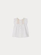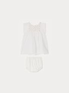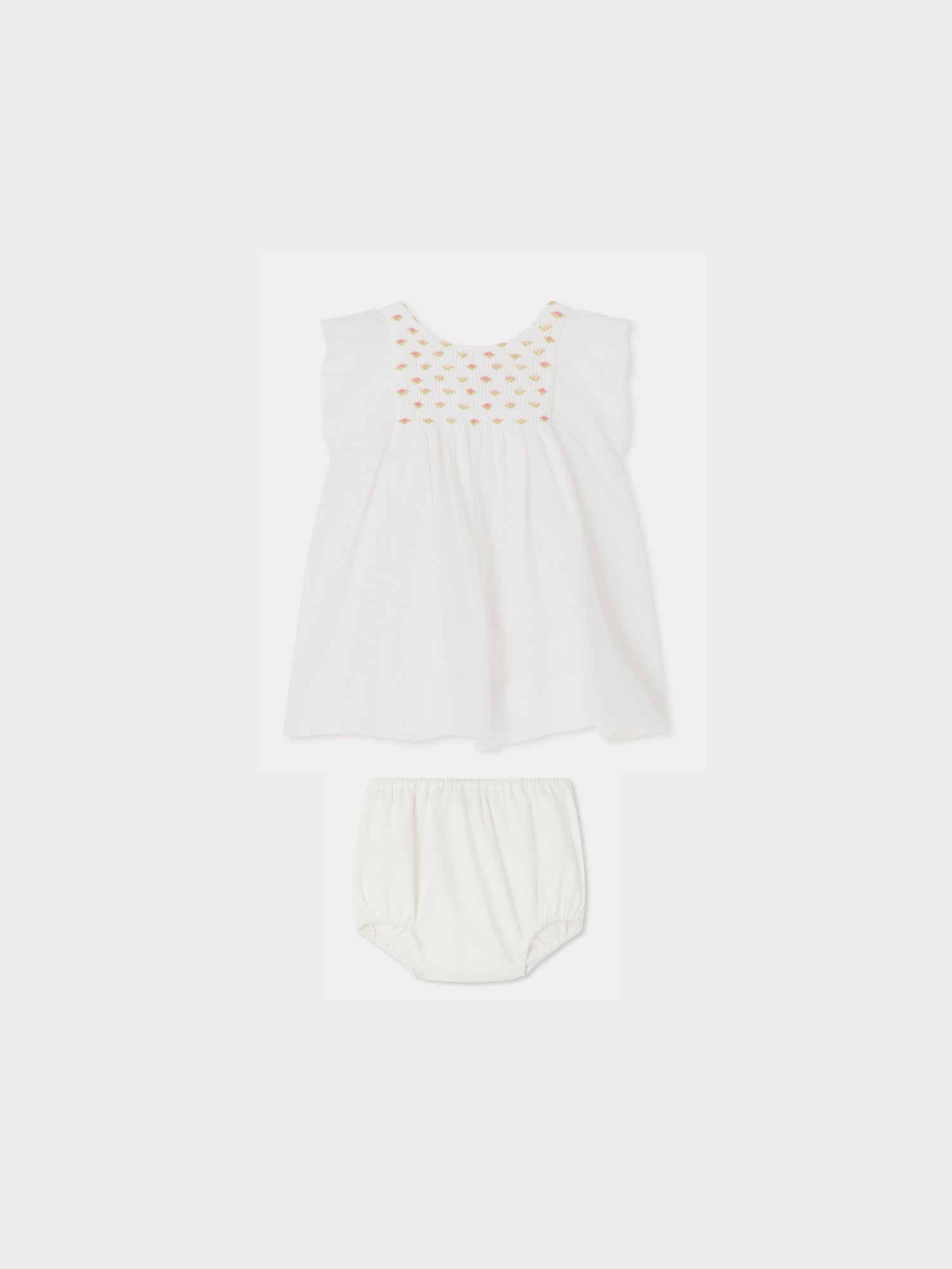 Das Bonpoint - Kleid mit Pumphose Cadelili für Babys wird mit passenden Pumphosen geliefert und ist somit ein stilvolles und bequemes Outfit für besondere Anlässe. Es ist an der Brust gesmokt und mit gestickten Blumen verziert. Die leichten, kurzen Ärmel und die Raffungen unter den Kitteln verleihen dem Kleid zusätzlichen Charme.