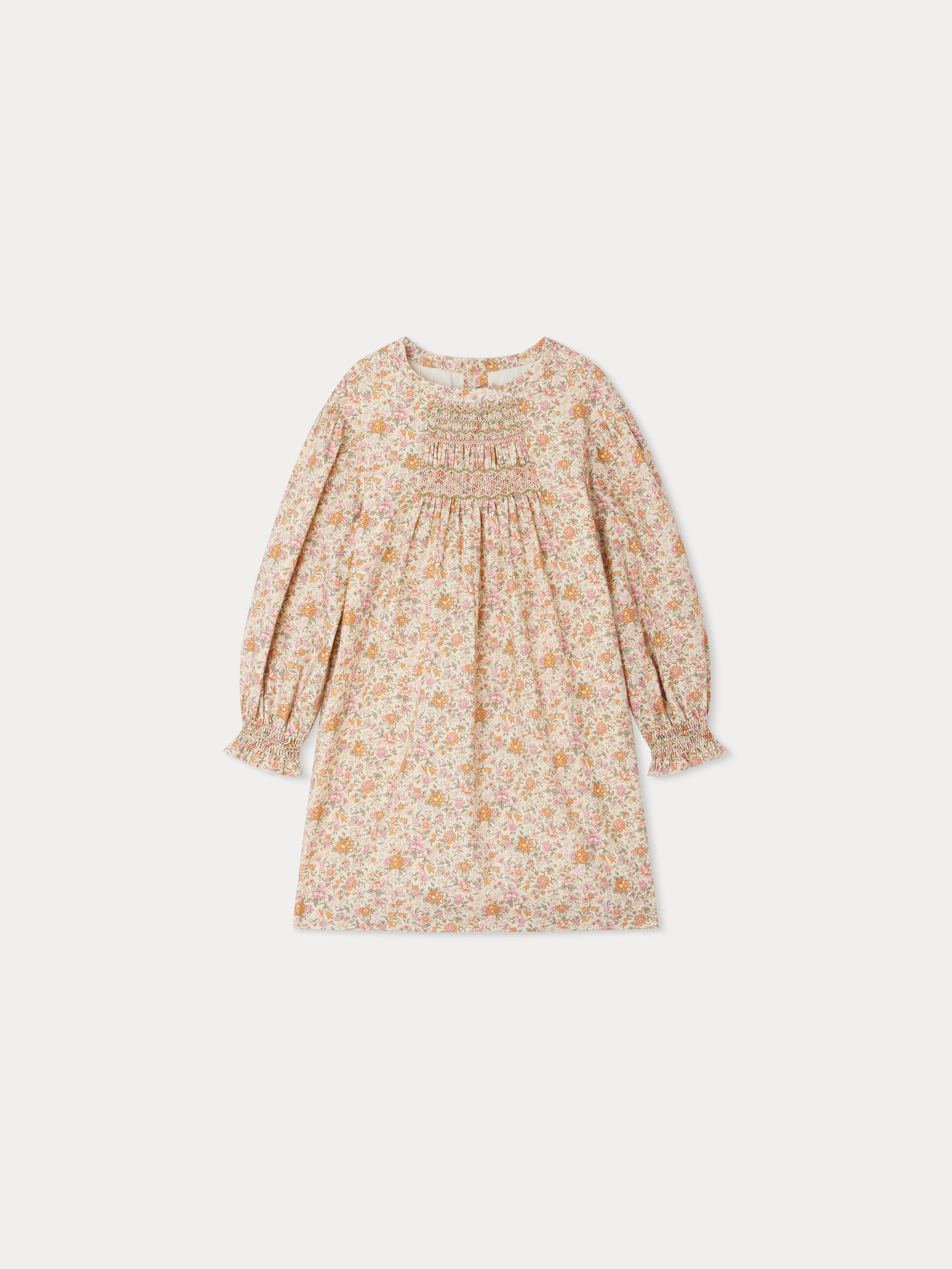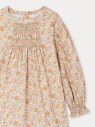 Atemberaubendes Bonpoint Kleid aus dem legendären Liberty Stoff. Die gestickten Smokarbeiten auf der Brust und an den Ärmeln verleihen Ihrem Kind einen märchenhaften Look.