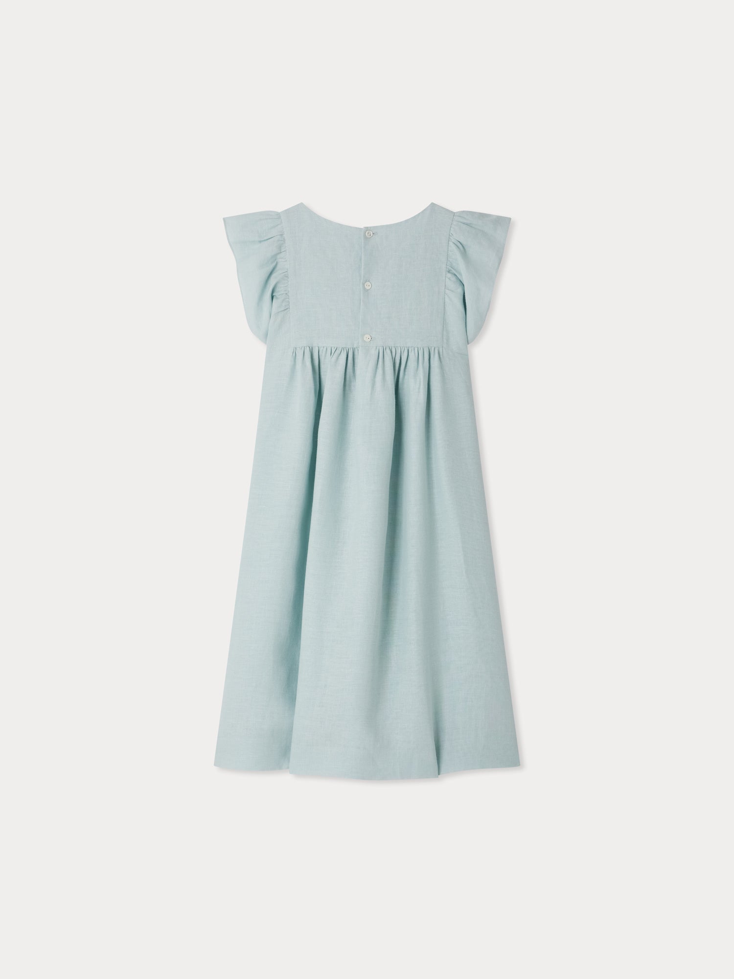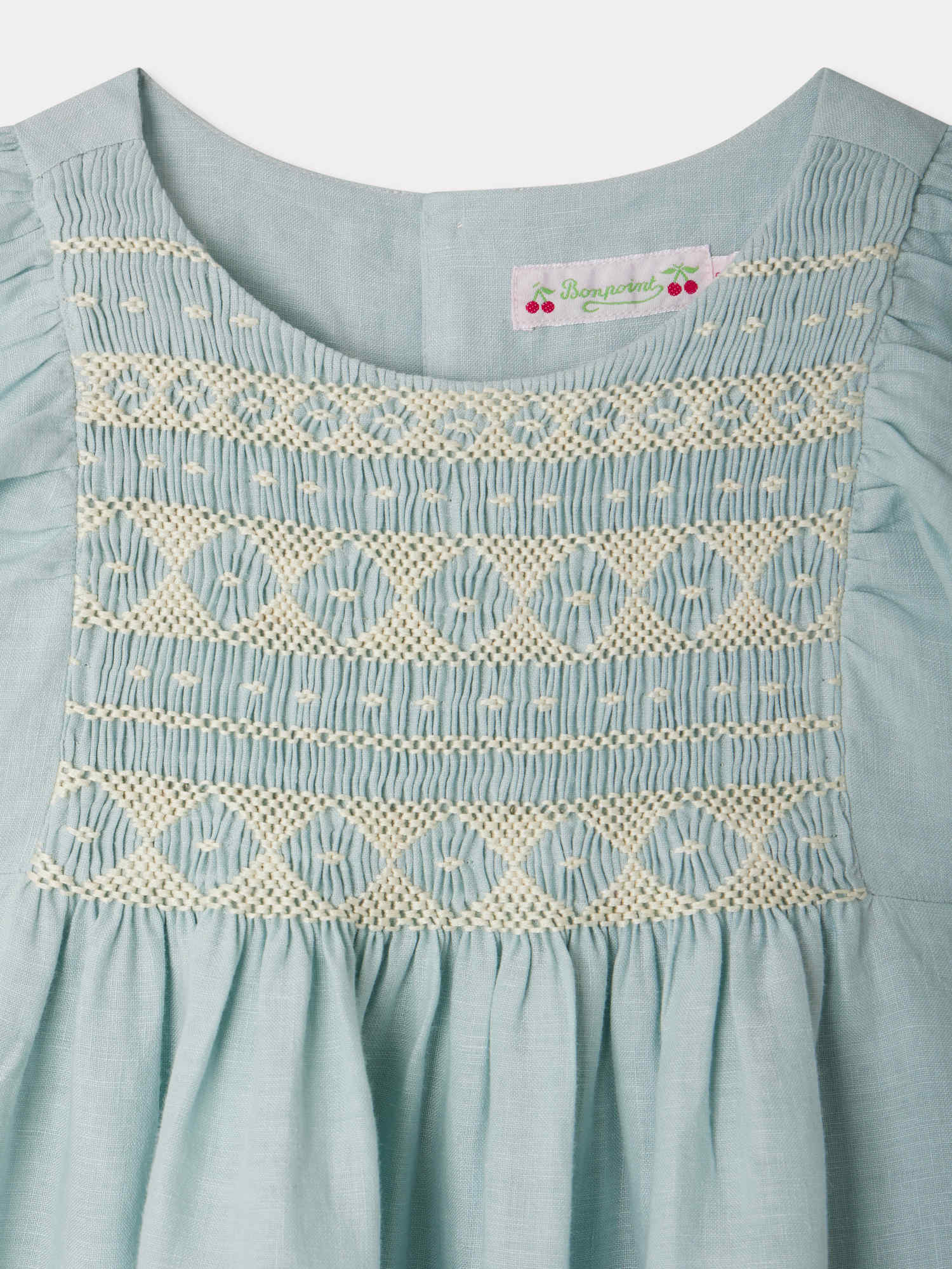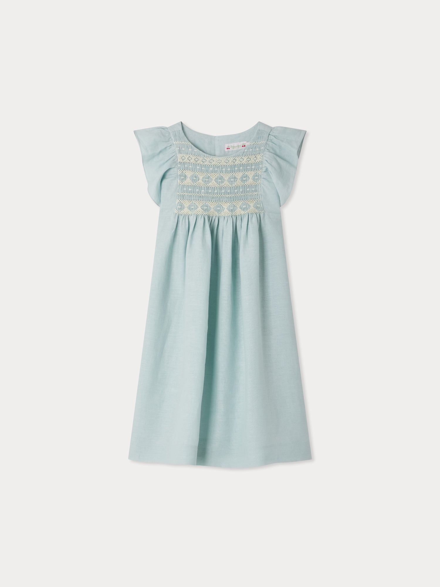 Das Bonpoint - Kleid Emeraude für Mädchen aus fließendem Leinen überzeugt mit markanten Einsätzen, handgesticktem Smokmuster auf der Brust und gerüschten Ärmeln. Der geraffte Schnitt unterhalb der Brust und der Knopfverschluss am Rücken runden das luftige Design ab.
