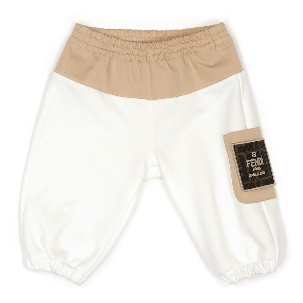 Die Fendi Kids Jogginghose aus hochwertiger Stretch-Gabardine in elegantem Weiß und Beige überzeugt mit einer Jacquard-Tasche und dem ikonischen FF-Logo in Tabakbraun.