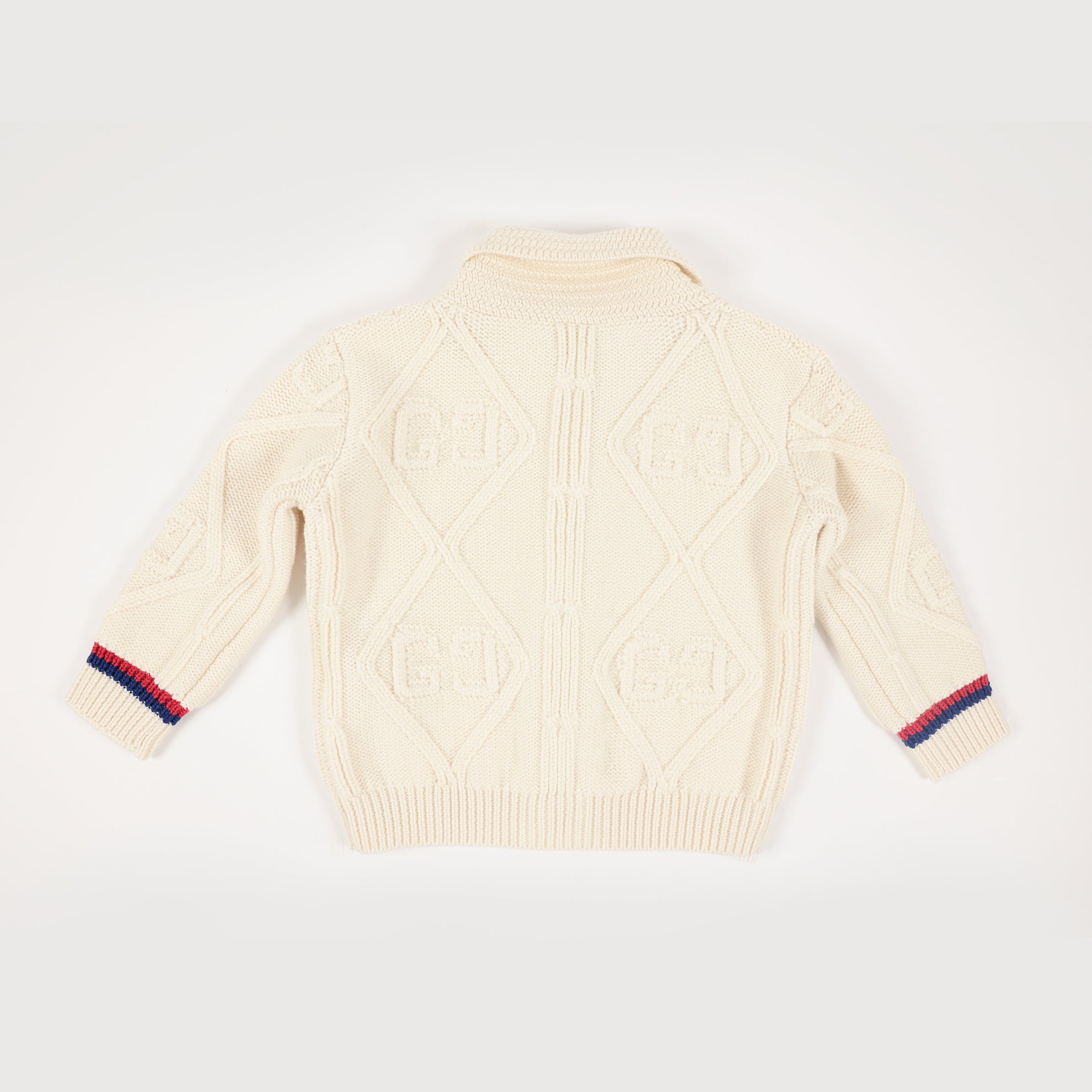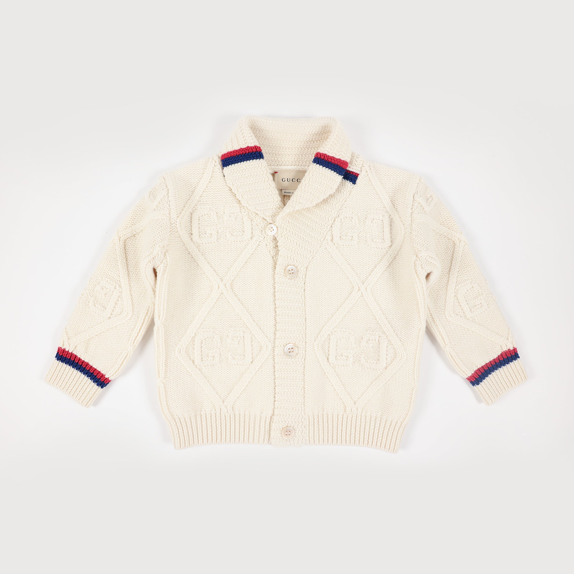 Entdecken Sie den stilvollen Gucci Kids Cardigan in klassischem Weiß mit auffälligen rot-blauen Akzenten. Perfekt für Babys geeignet, bietet er nicht nur Komfort sondern auch einen Hauch von Luxus. Kreieren Sie mit diesem Cardigan einen trendigen Look für Ihr Kind.
