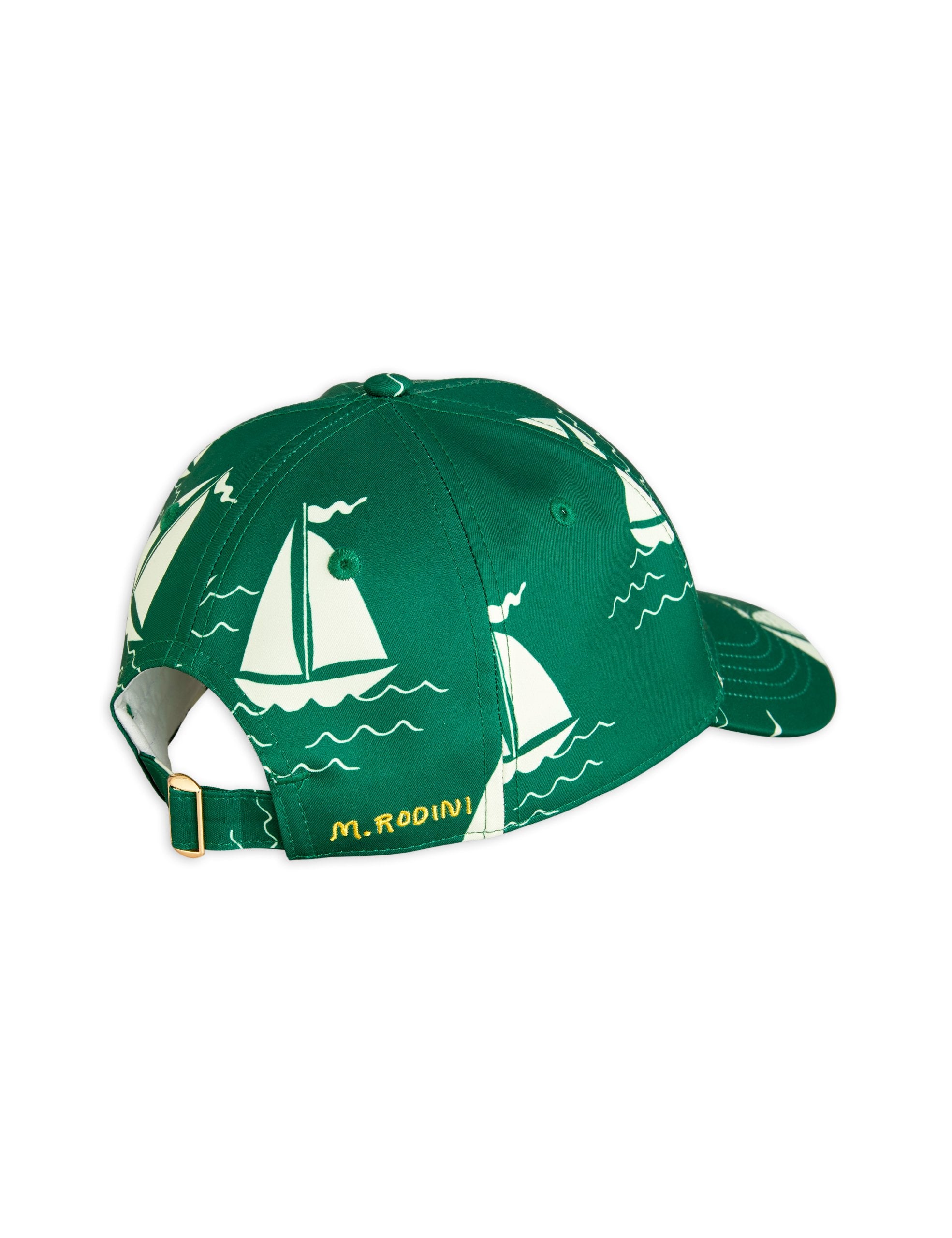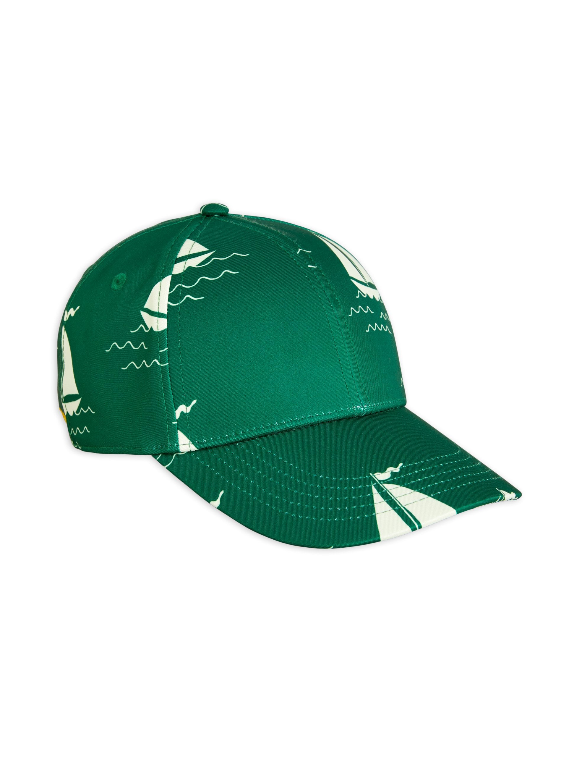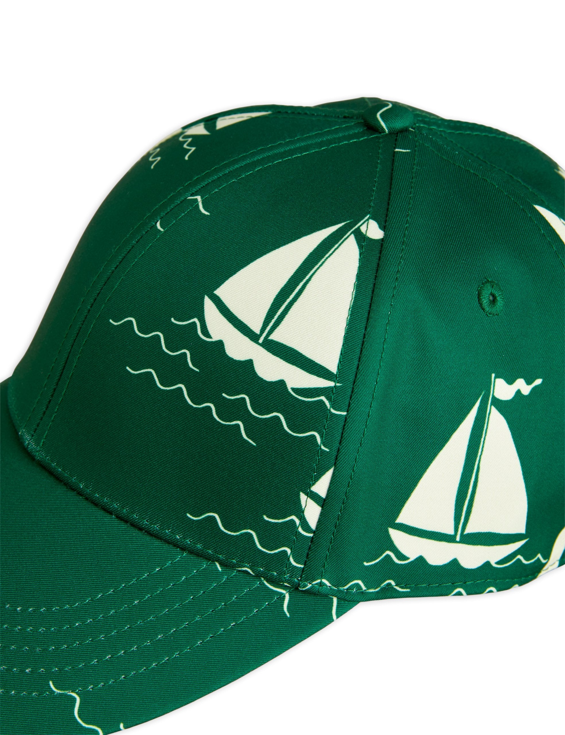 Die Mini Rodini - Sailing Boats Cap in Grün und Weiß ist mit einem charmanten Segelboot-Design versehen. Sie schützt vor der Sonne und verleiht jedem Outfit einen frischen, maritimen Look.