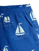 Die Mini Rodini - Sailing Boats Shorts zeichnen sich durch ein verspieltes Segelboot-Muster aus, das das gesamte Design ziert.