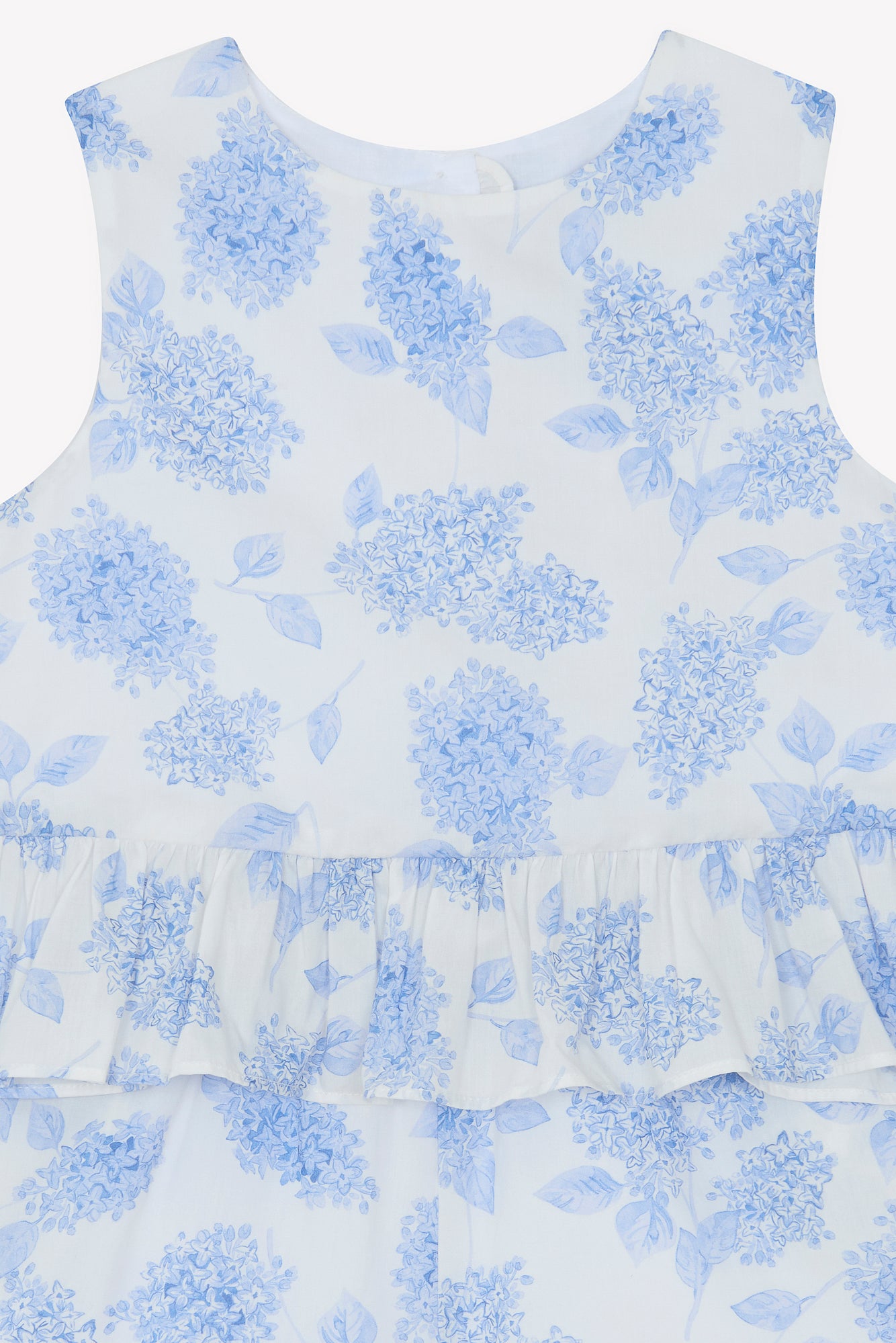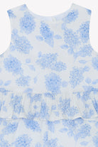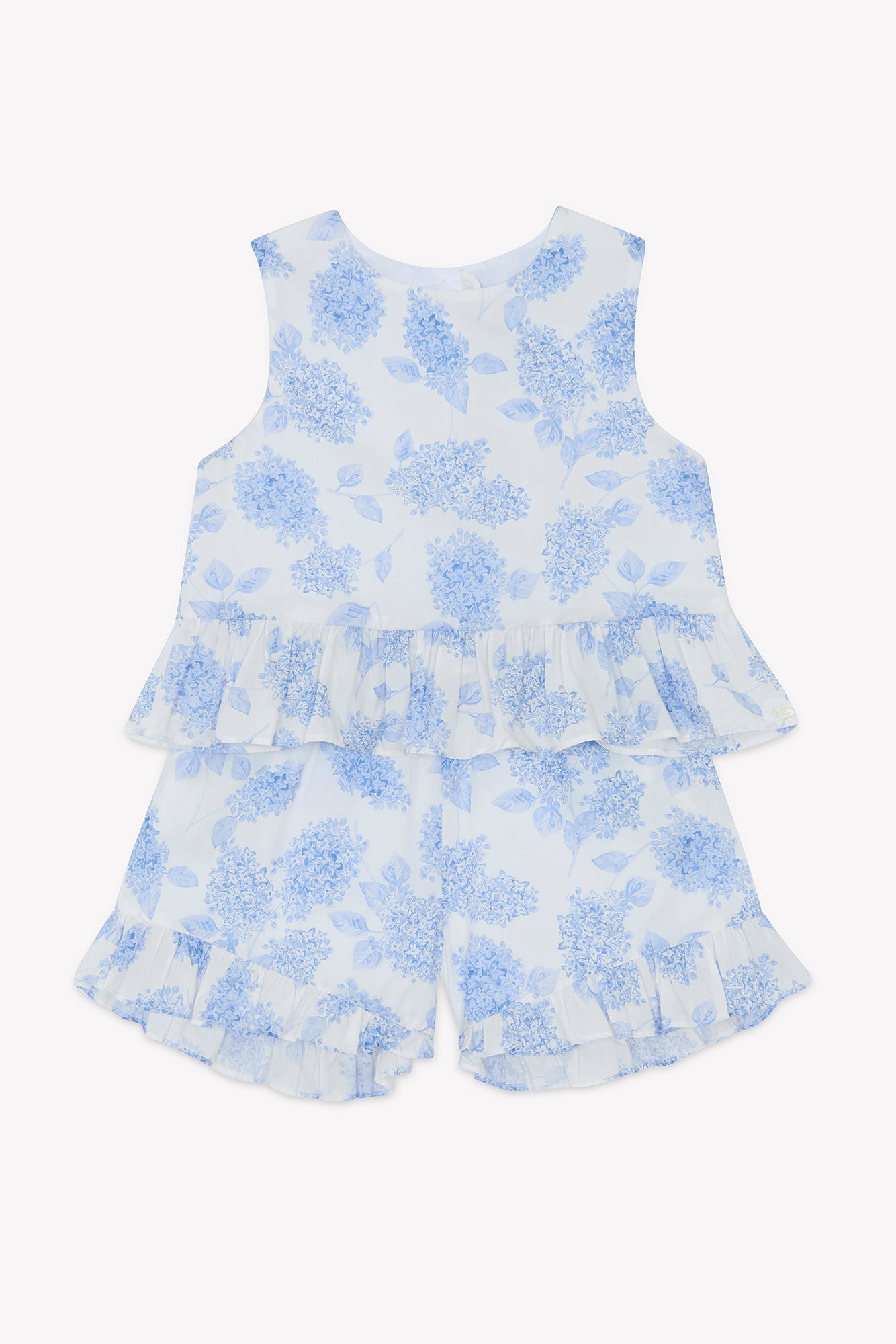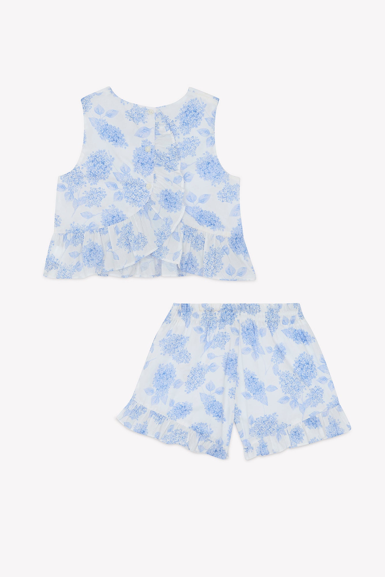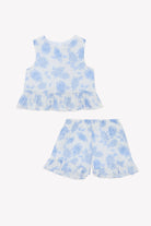 Dieses sommerliche Set für Mädchen besteht aus einem ärmellosen Oberteil mit zarten Rüschen und einer passenden Shorts, beide verziert mit einem floralen Druck in Blautönen. Leicht, romantisch und elegant – perfekt für sonnige Tage!