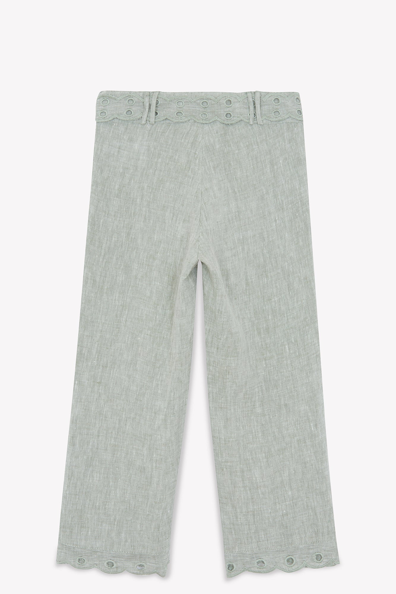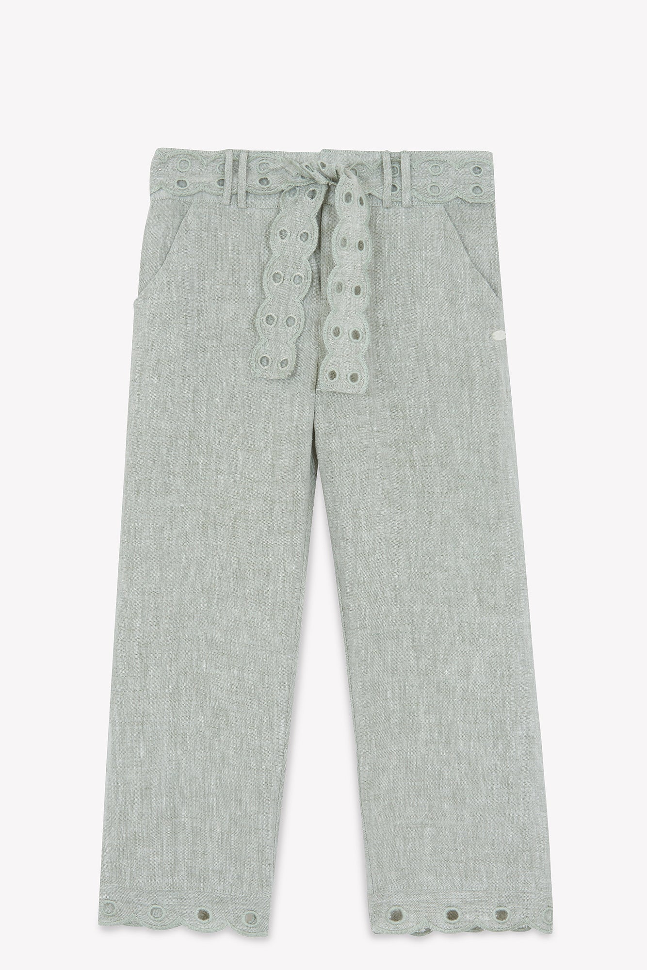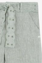 Diese elegante Khaki-Hose begeistert mit zarter englischer Stickerei am Bund und Saum. Leicht und bequem, ideal für sommerliche Tage – stilvoll, natürlich und raffiniert!