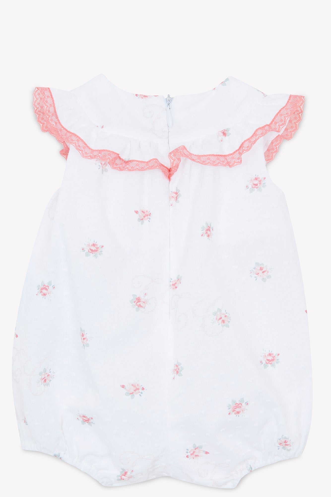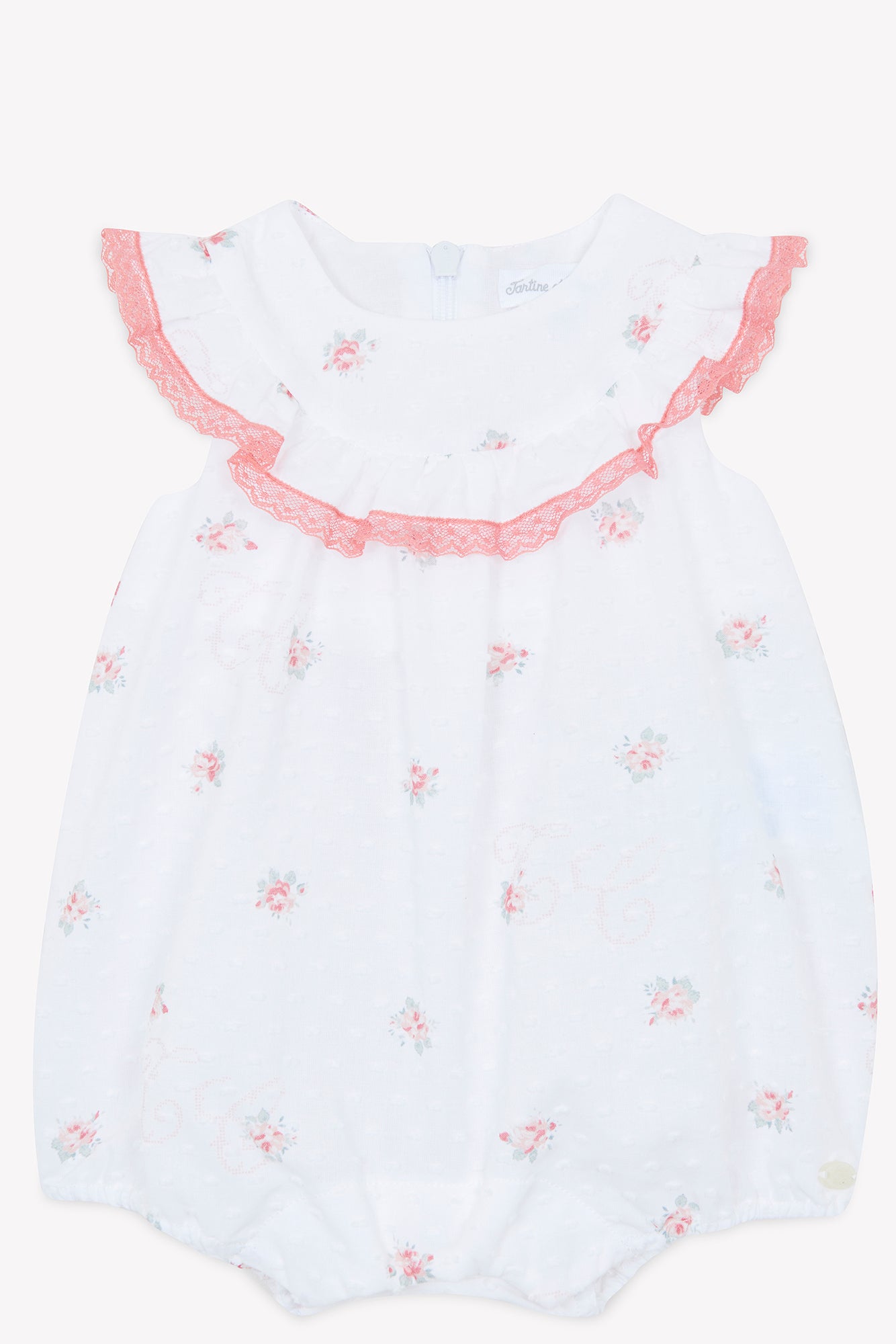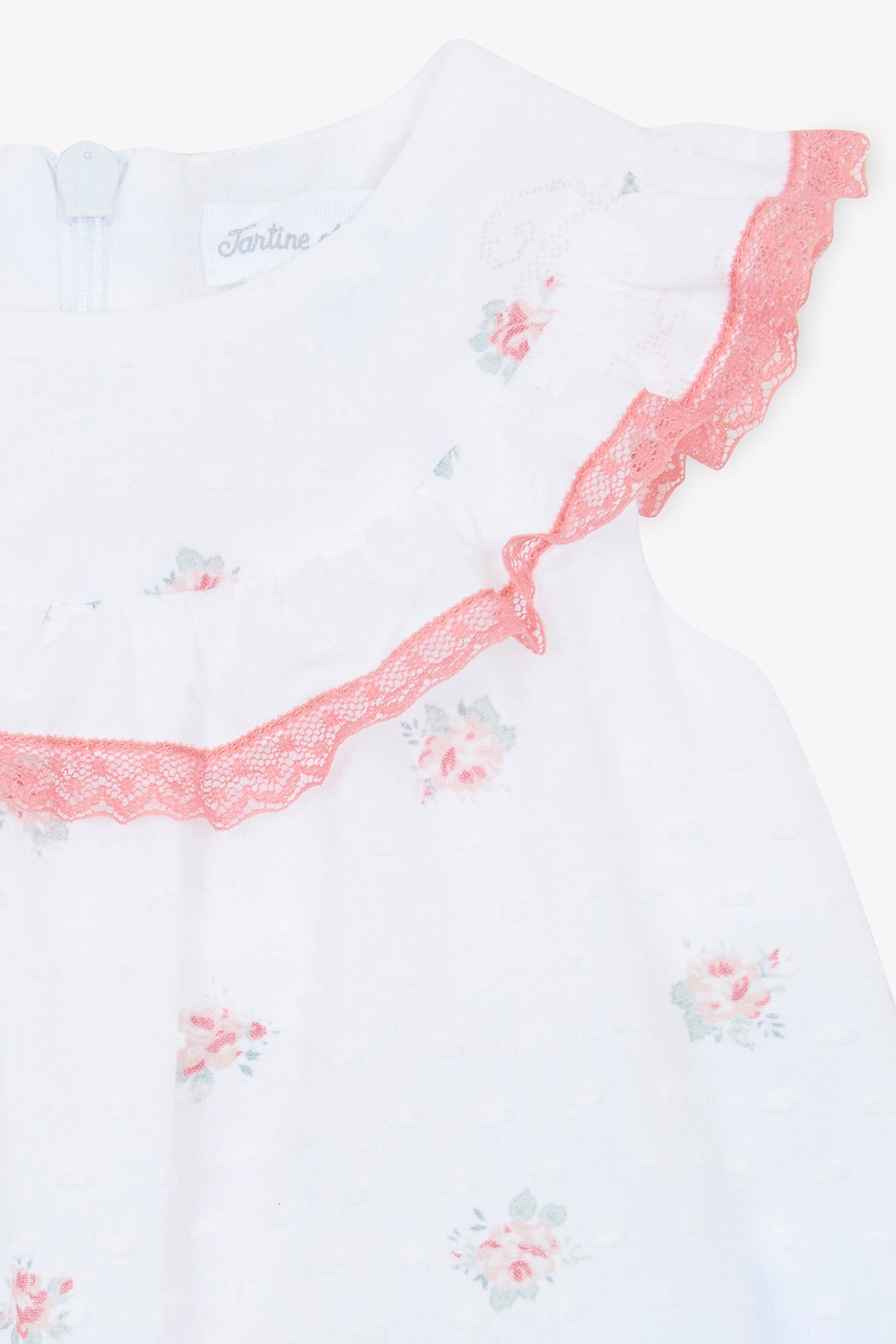 Diese weiße Plumetis-Kombination ist ideal für Neugeborene und verleiht den ersten Tagen sommerliche Eleganz. Mit floralem Print, Rundhalsausschnitt und zarter Spitzenverzierung verbindet sie Komfort und Charme – perfekt für sonnige Tage!