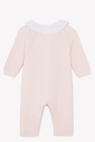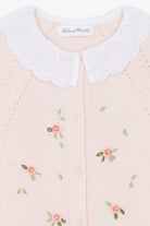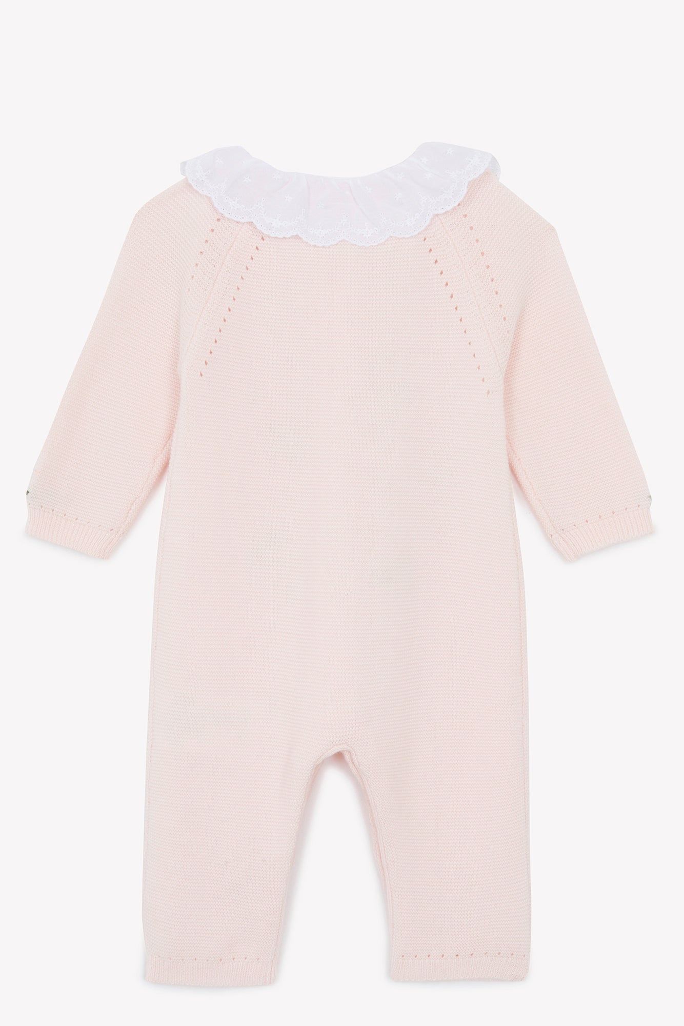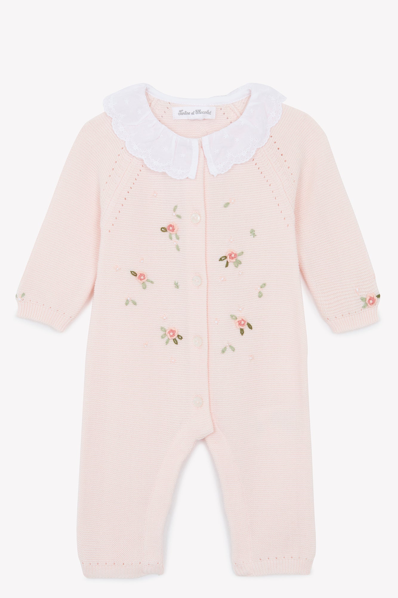 Dieser edle Strampler aus feiner Baumwolle bezaubert mit handgestickten Blüten, einem Rüschenkragen mit englischer Stickerei und filigranen Strickdetails. Perfekt für besondere Anlässe oder sonnige Tage – stilvoll, komfortabel und bezaubernd süß!