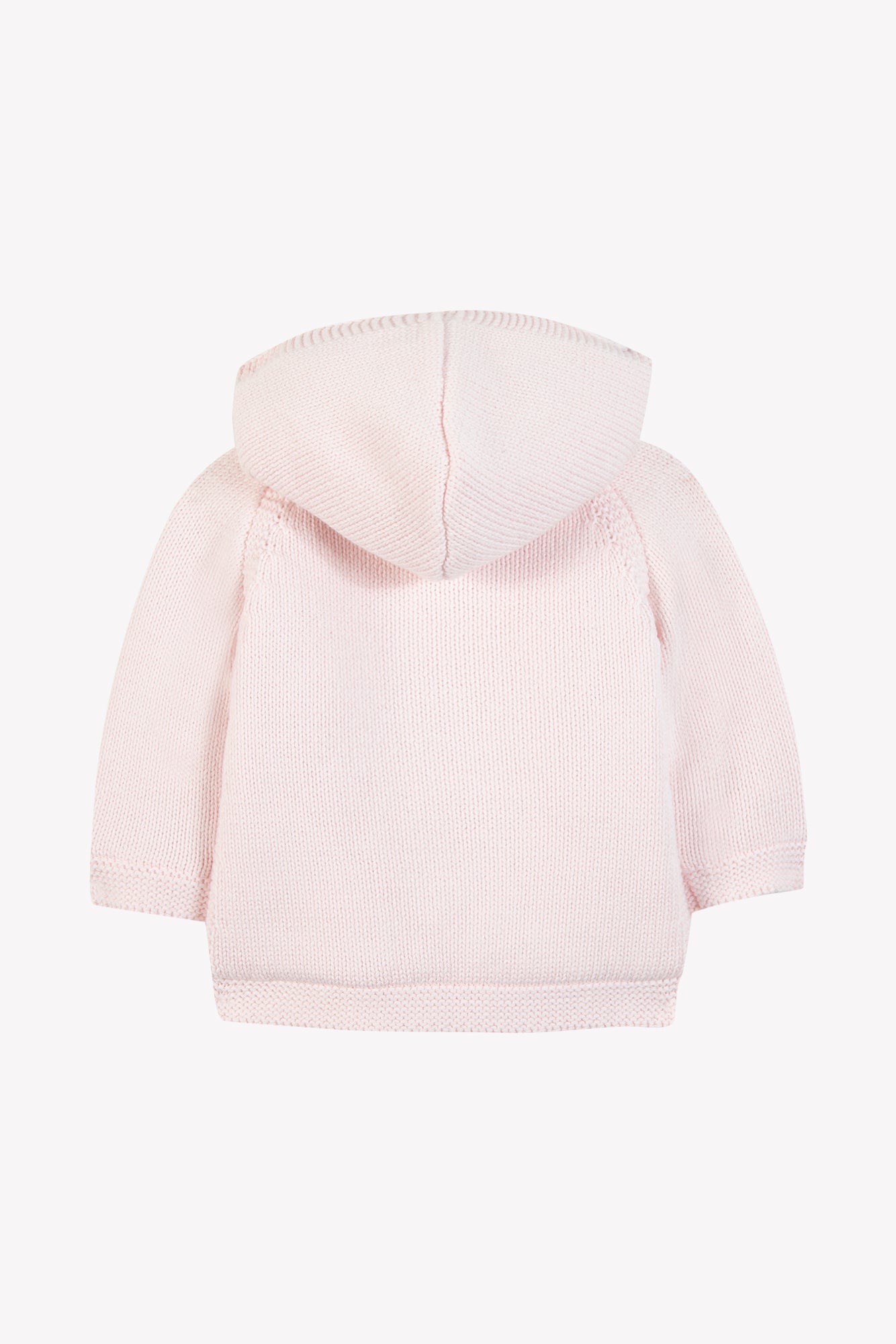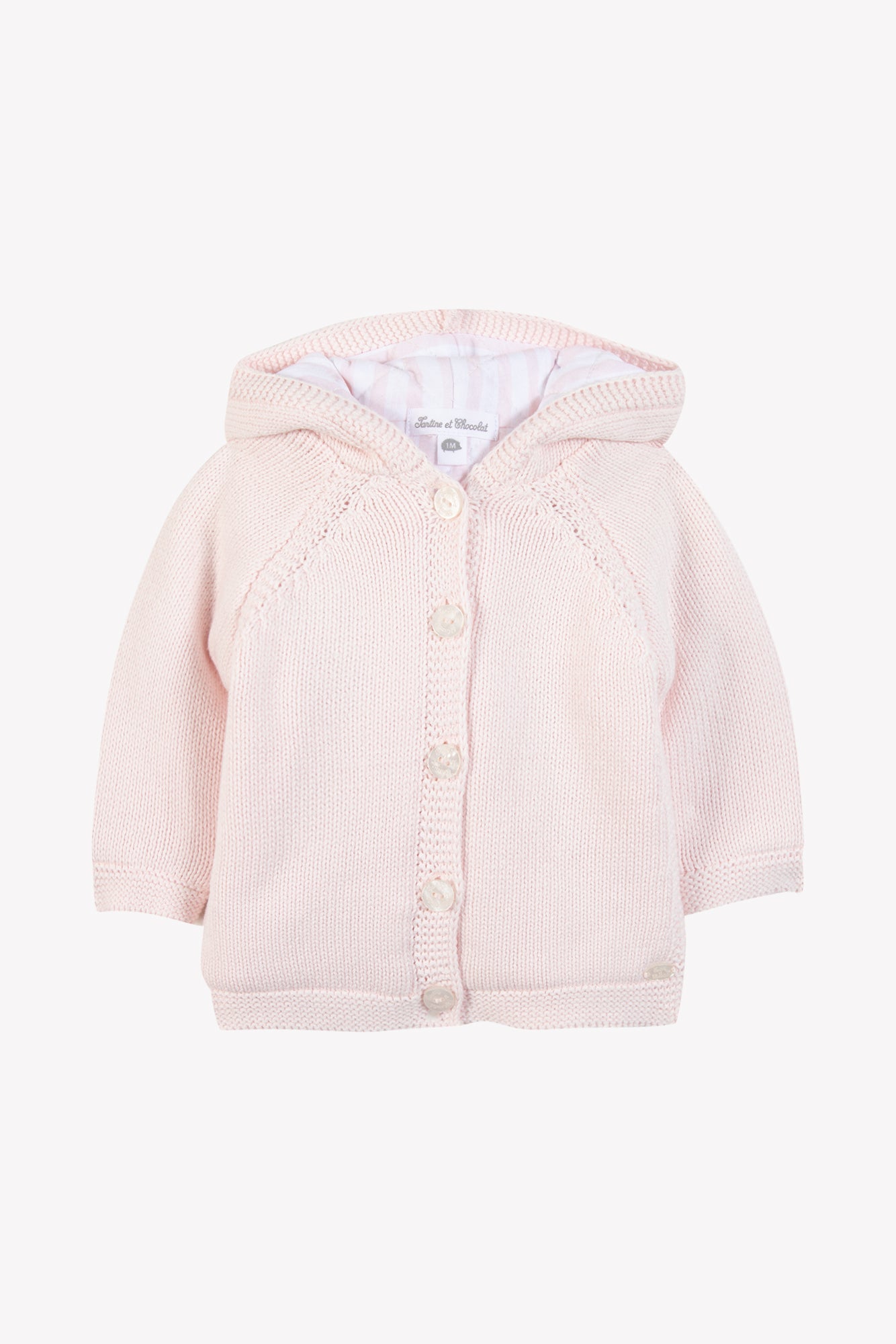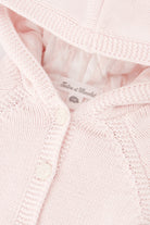 Zarter Strickmantel in Rosa mit feinen Openwork-Details und gestreiftem Futter – ideal für kühlere Tage. Mit Kapuze und Knopfverschluss für extra Komfort und Stil.