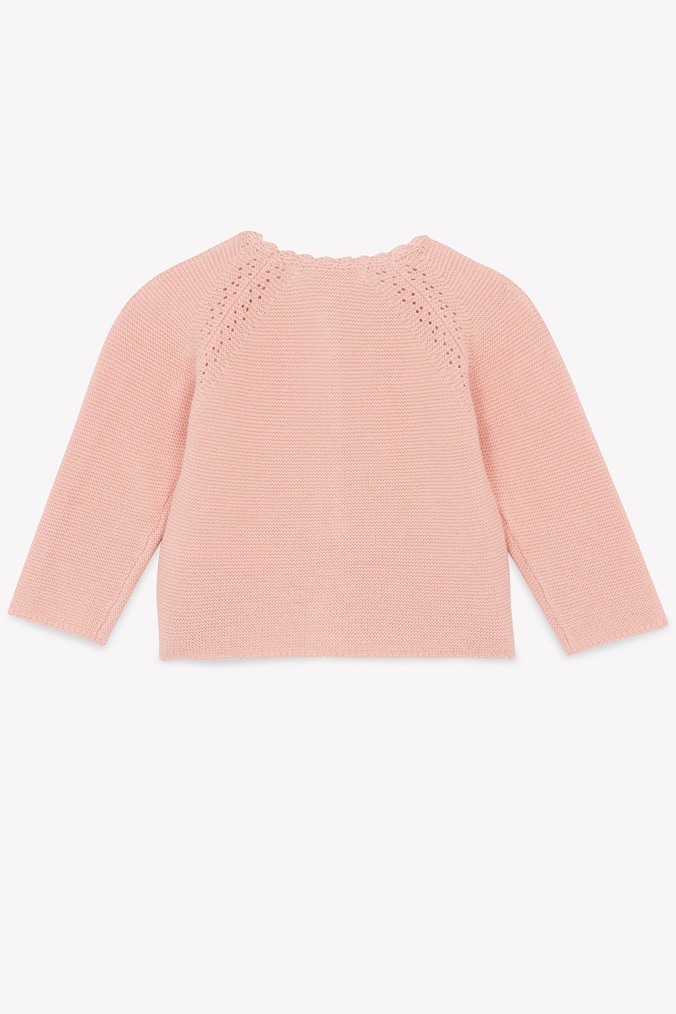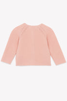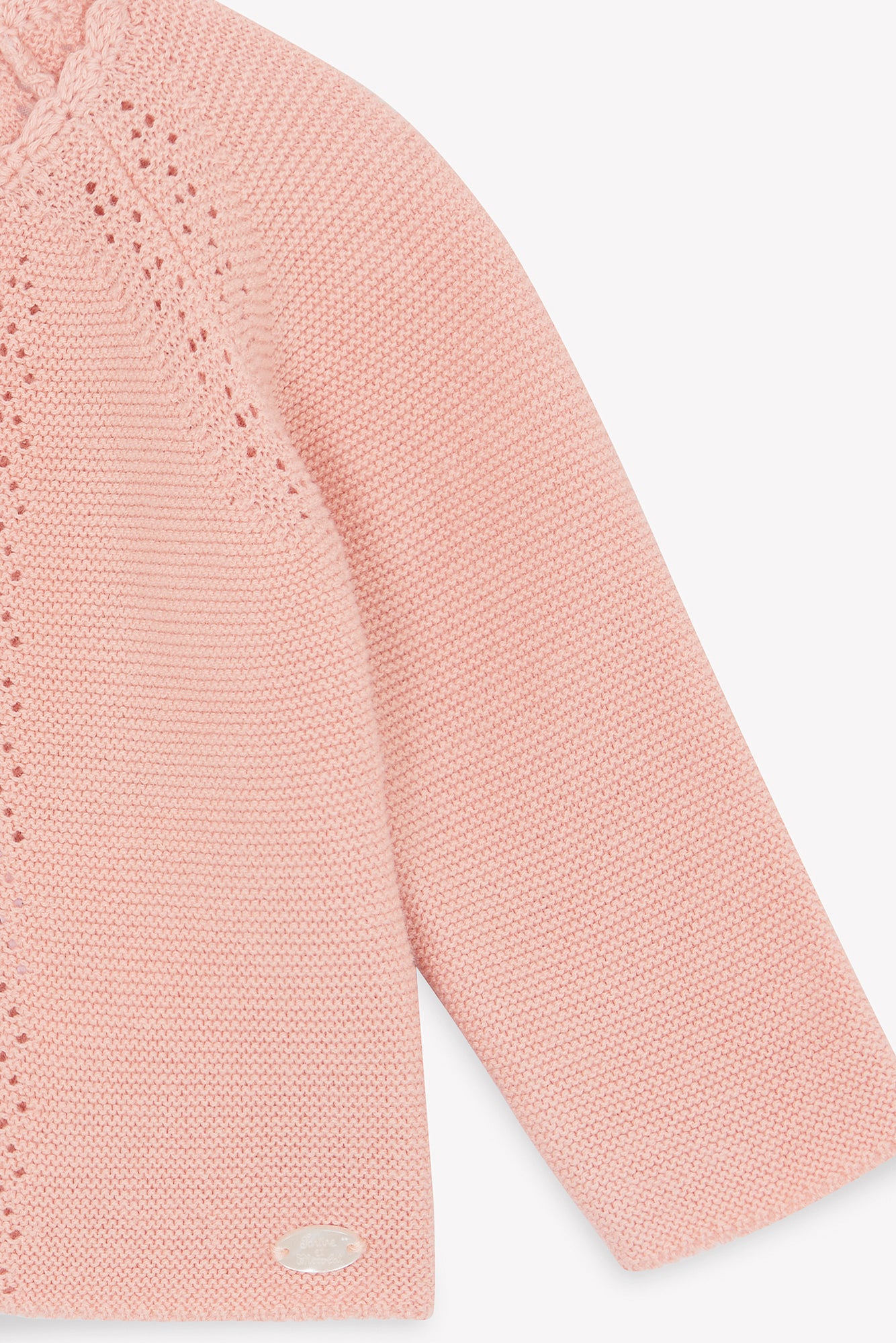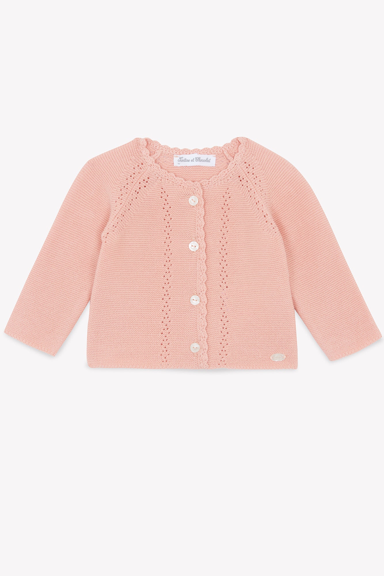 Zarter, offener Strickcardigan in Lachsrosa mit feinem Kragen – ideal, um die Outfits Ihrer kleinen Prinzessin an kühlen Sommertagen zu vervollständigen. Leicht, komfortabel und elegant.