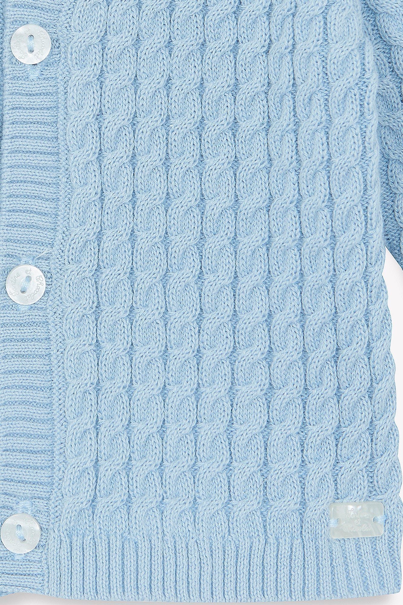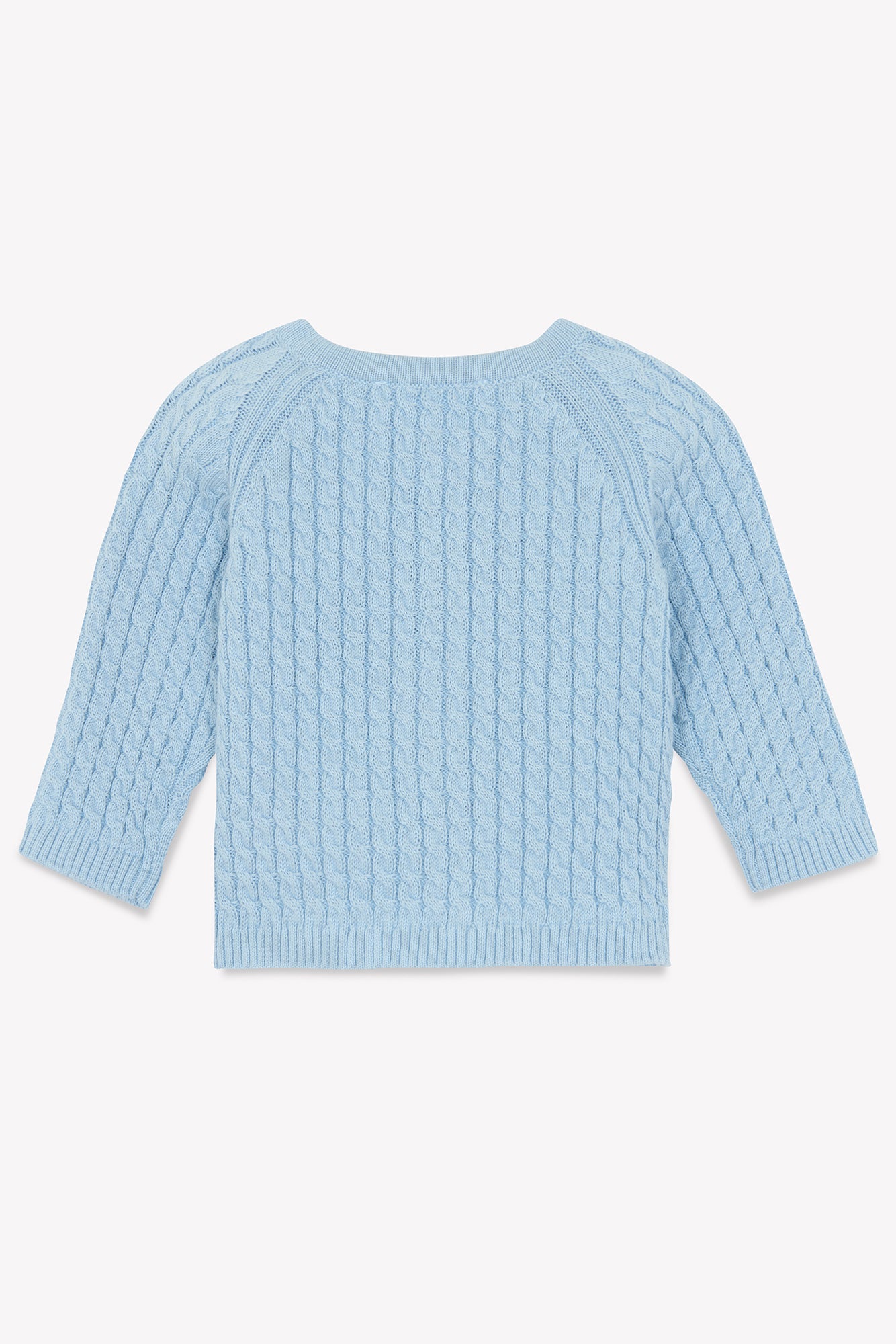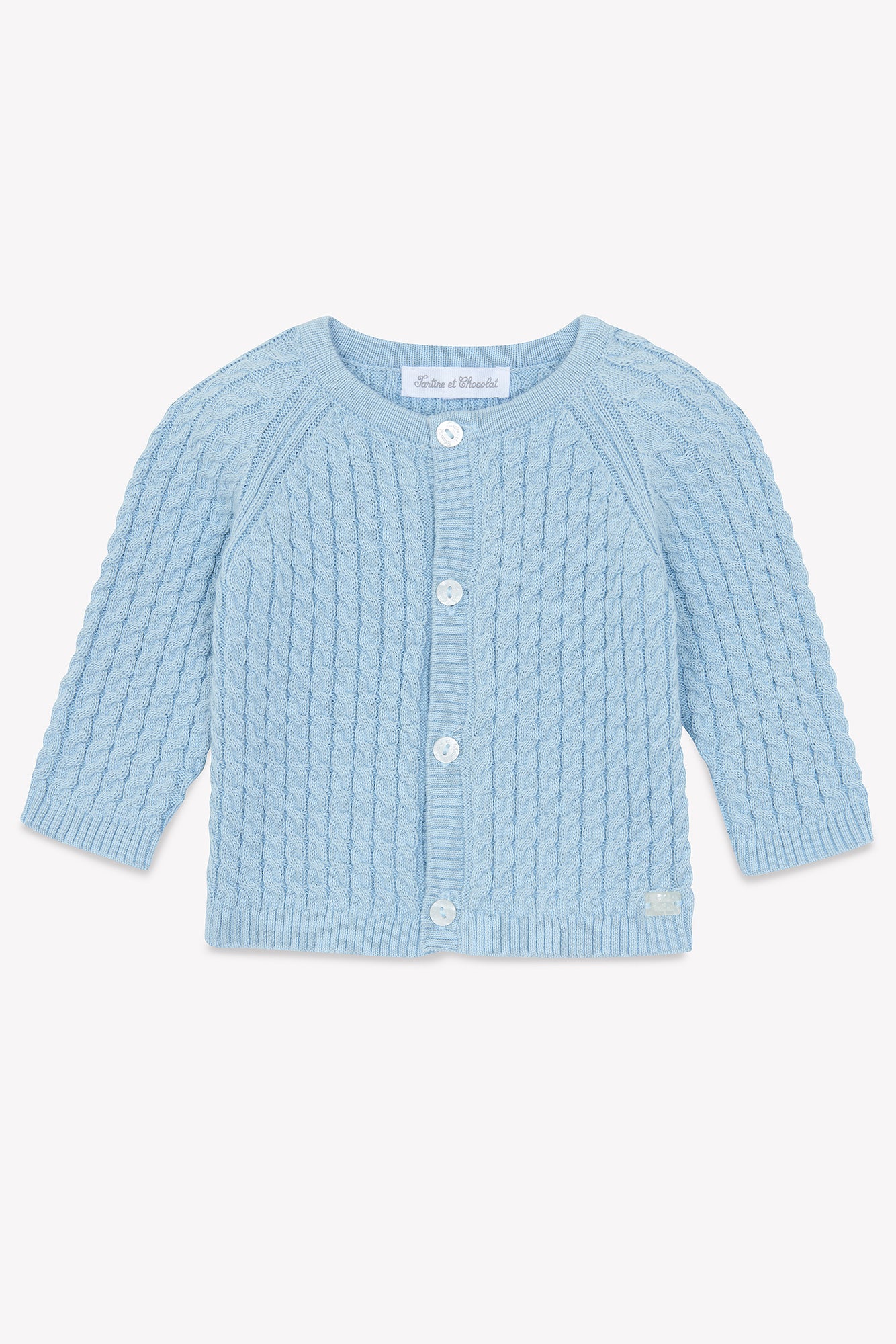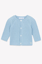 Himmelblauer Strickcardigan mit Zopfmuster und Knöpfen aus Perlmutt – zart und perfekt für kühle Tage. Bringt eine süße und elegante Note ins Outfit.