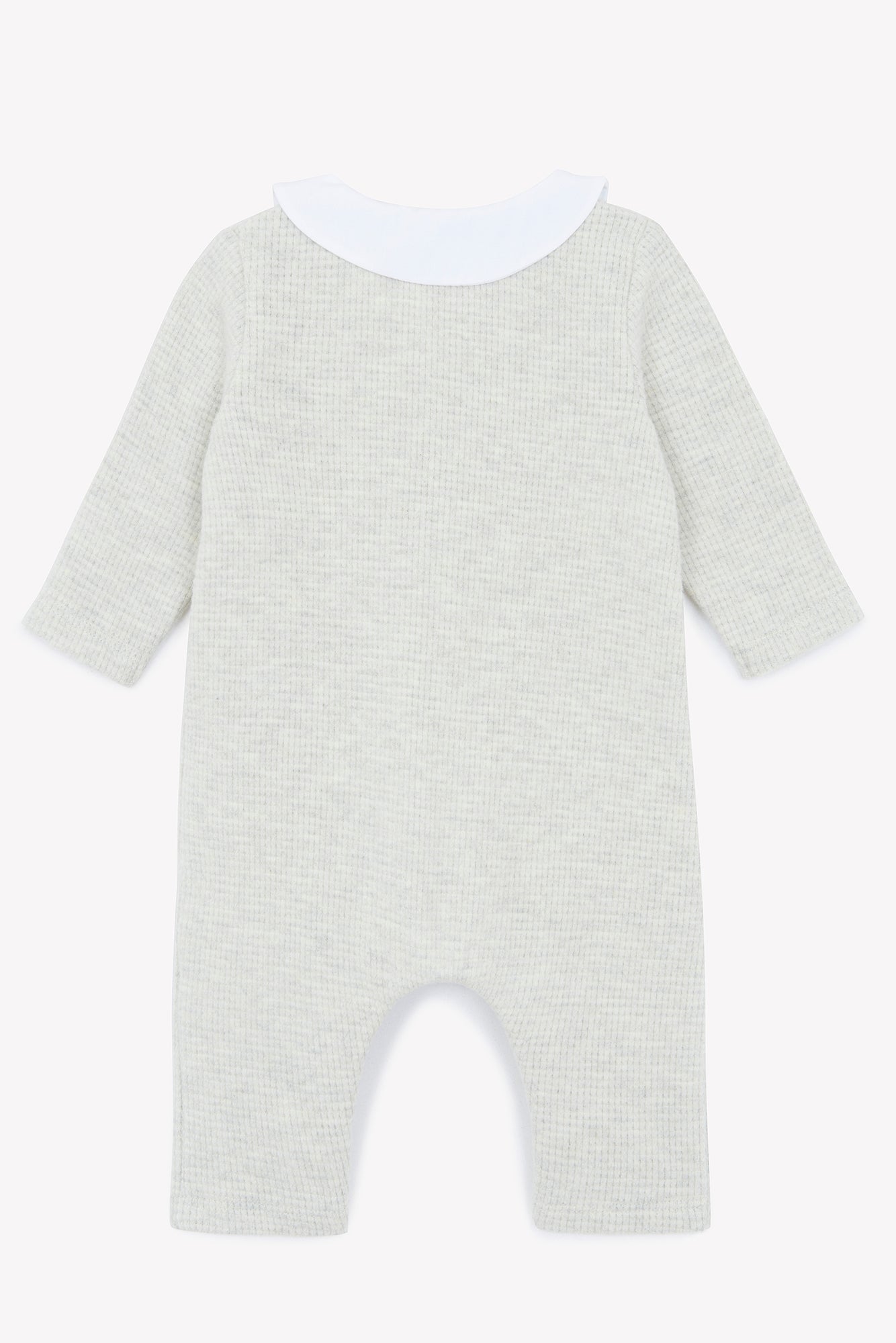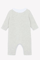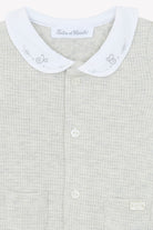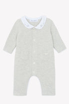Eleganter Strampler in Hellgrau mit Peter-Pan-Kragen und feiner Stickerei. Aus weichem Strickmaterial, bietet er Komfort und einen zeitlosen Stil für Ihr Baby.