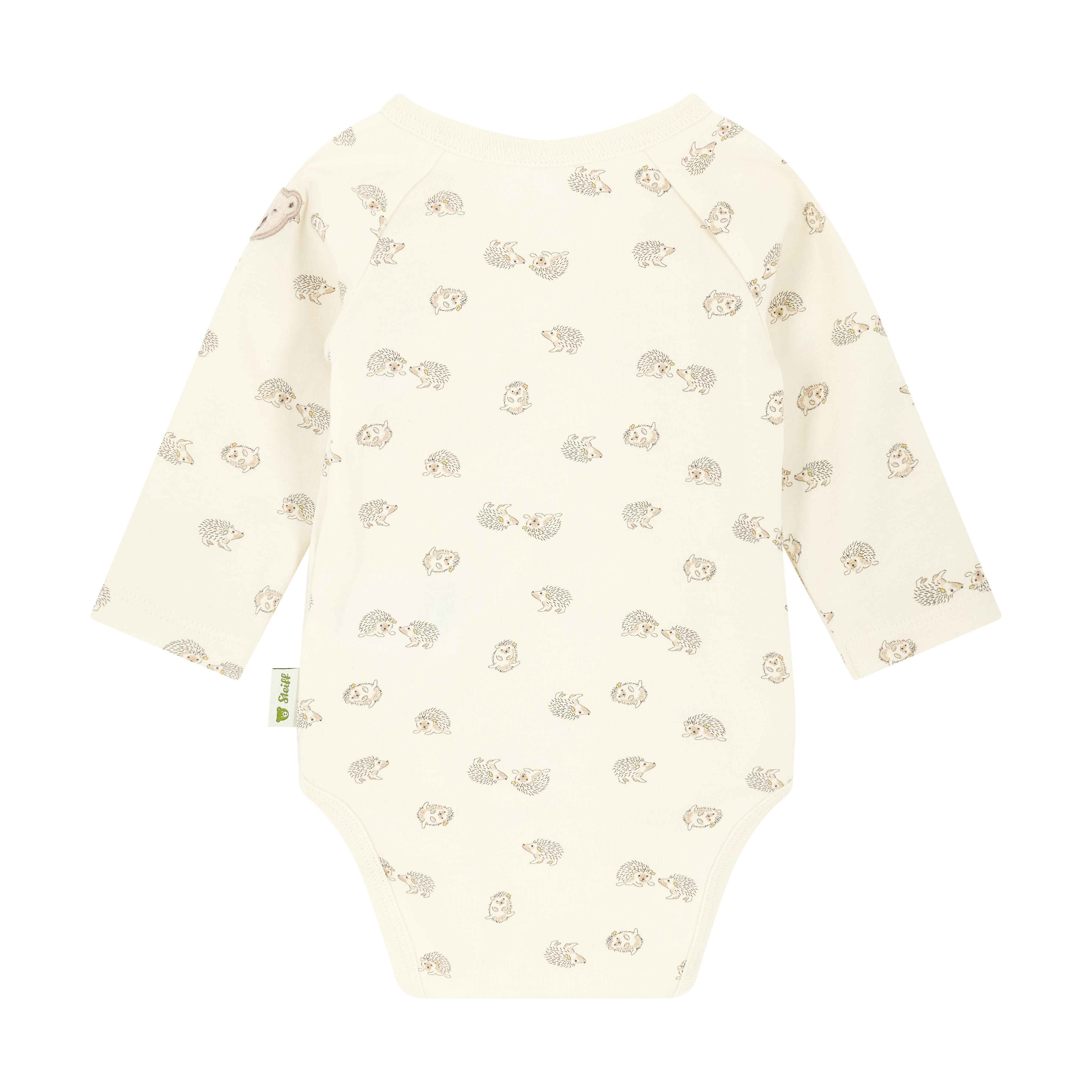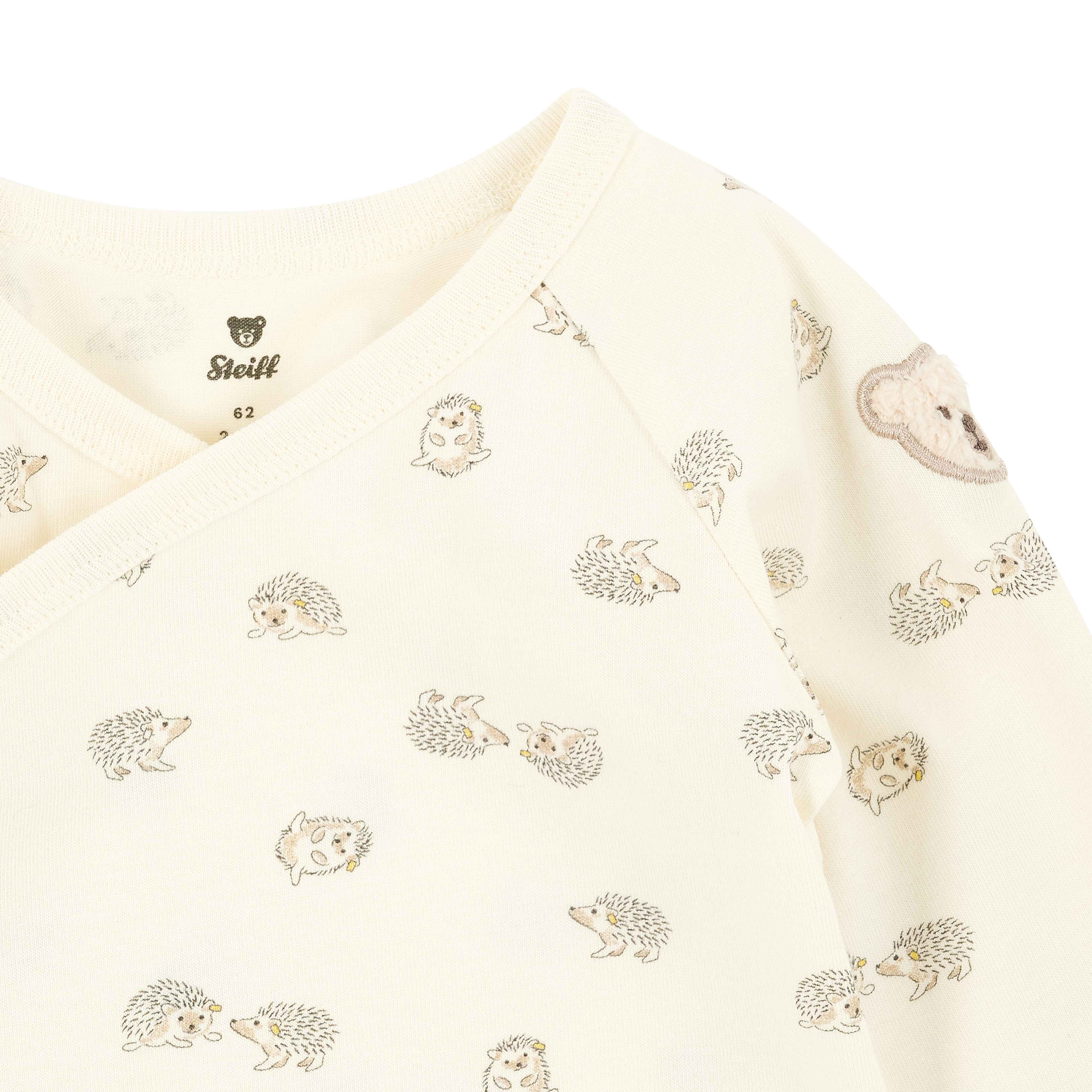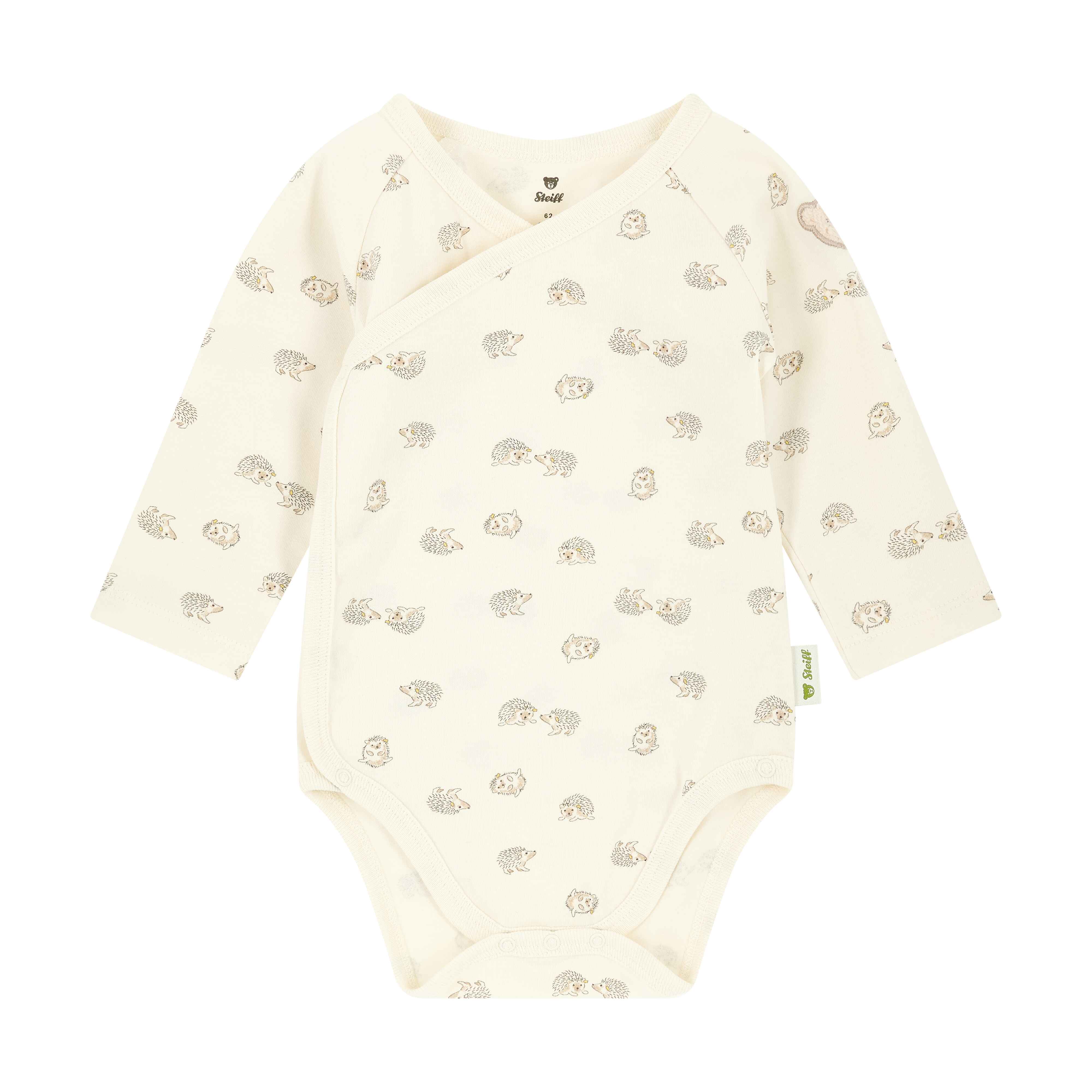 Der Steiff Wickelbody mit langen Ärmeln ist weich, praktisch und bezaubernd zugleich. Der zarte Allover-Print mit kleinen Igeln setzt verspielte Akzente und macht den Body zu einem süßen Hingucker im Alltag. Dank seitlicher Druckknopfleiste und Knöpfen im Schrittbereich ist das An- und Ausziehen besonders unkompliziert. Der weiche Single Jersey schmiegt sich sanft an die Babyhaut und sorgt für angenehmen Tragekomfort. Auf dem Ärmel rundet das klassische Steiff Teddybärmotiv den Look liebevoll ab. Ein Body mit Wohlfühlgarantie für jeden Tag.