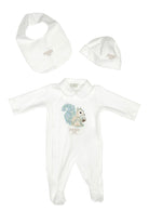 Dieses dreiteilige Baby-Set von Fendi Kids besteht aus Strampler, Mütze und Lätzchen – jeweils aus reiner, weicher Baumwolle gefertigt. Der Strampler zeigt ein zart gesticktes Eichhörnchen-Motiv auf der Vorderseite, das einen liebevollen Markenakzent setzt. Dank der feinen Stickereien und der sanften Materialien liegt das Set angenehm auf der Haut und eignet sich ideal als Erstlingsausstattung oder Geschenk zur Geburt.
