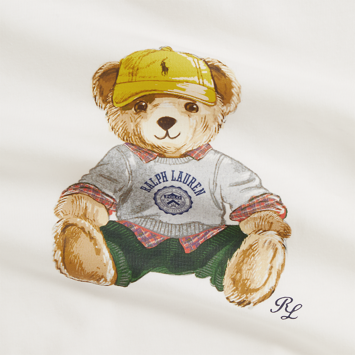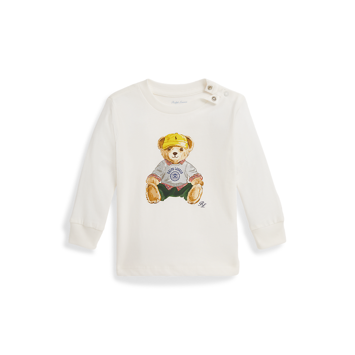 Die Größen 3M bis 12M sind an der linken Schulter mit einer Knopfleiste mit zwei Druckknöpfen versehen. Lange Ärmel mit gerippten Bündchen. Polo Bear und „RL“-Schriftzug als Druck vorne in der Mitte.
