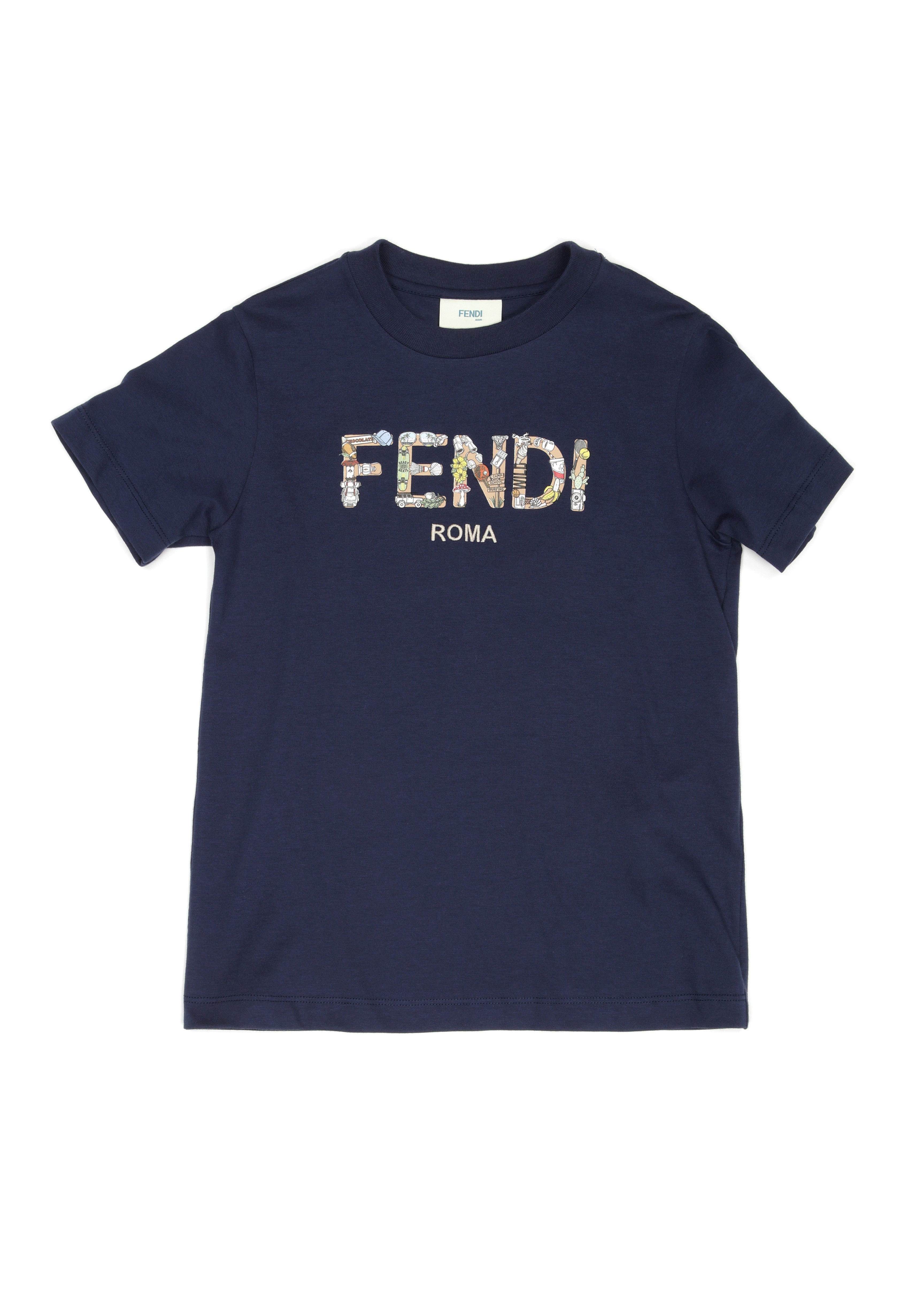 Das marineblaue T-Shirt von Fendi Kids besteht aus reiner, weicher Baumwolle und bietet ein komfortables Tragegefühl für den Alltag. Das bunte grafische „FENDI“-Logo auf der Vorderseite setzt einen spielerischen und modernen Akzent, während der klassische Schnitt vielseitig kombinierbar ist. Ideal für stylische Outfits mit einem Hauch Luxus.