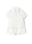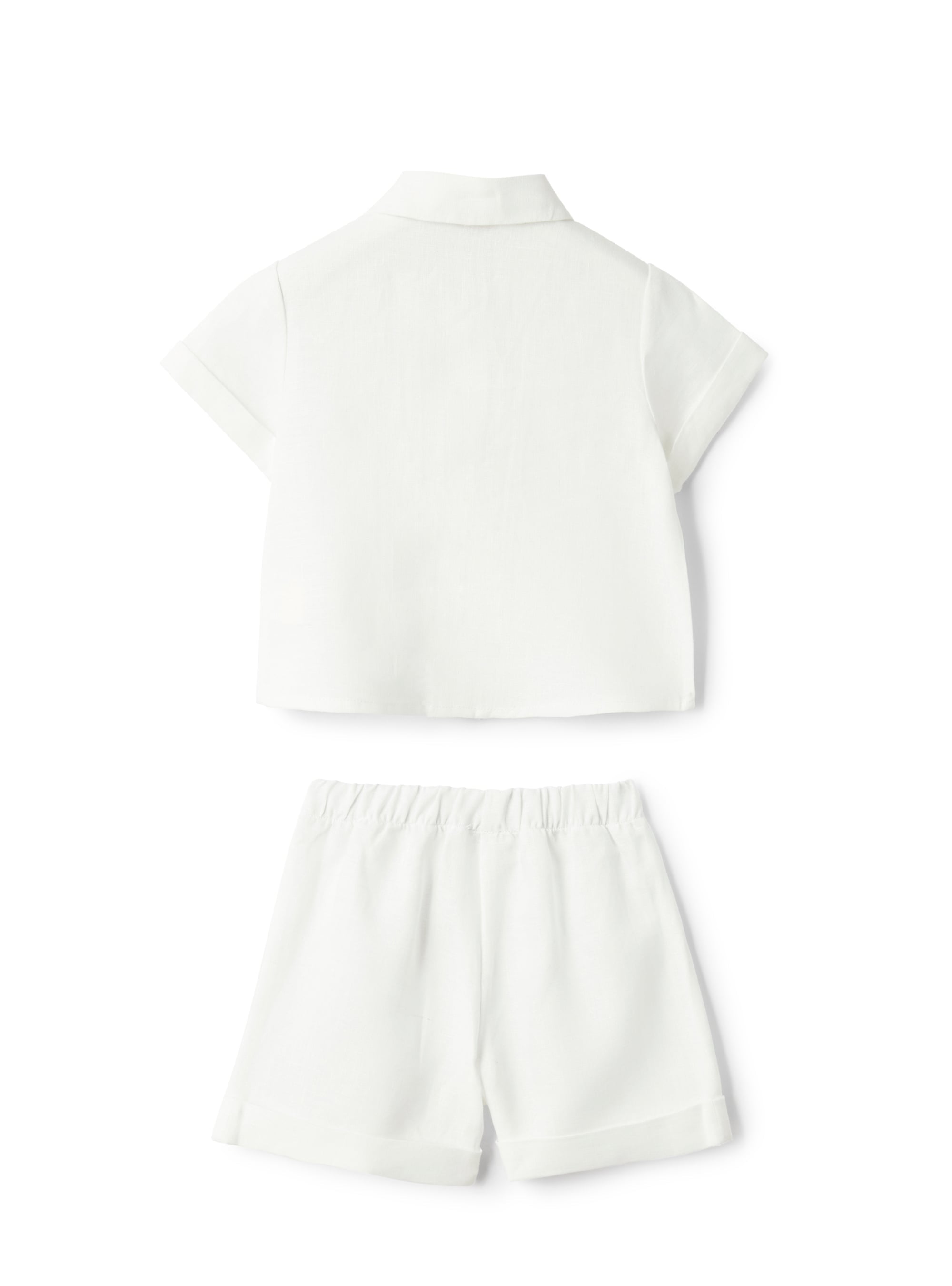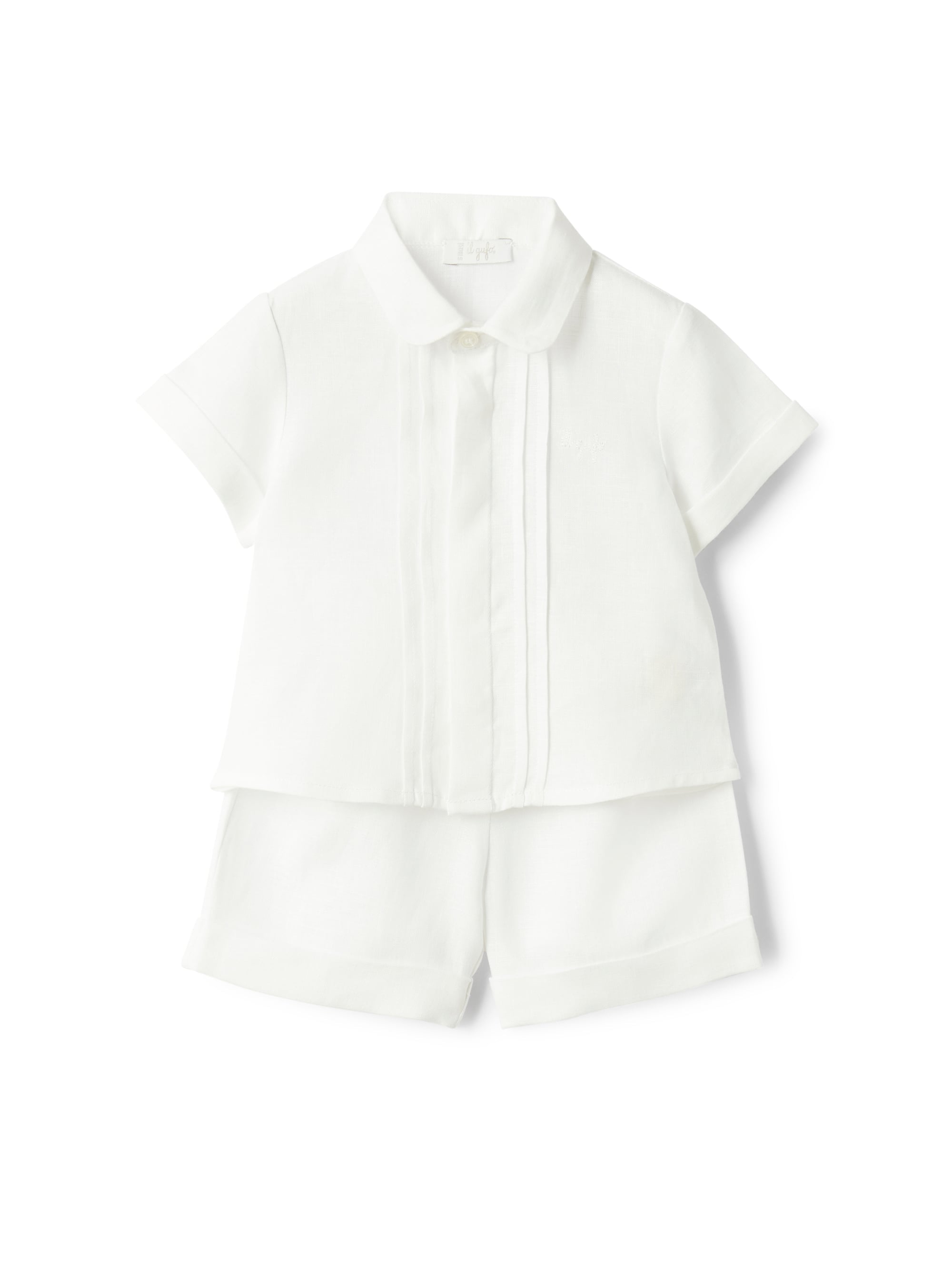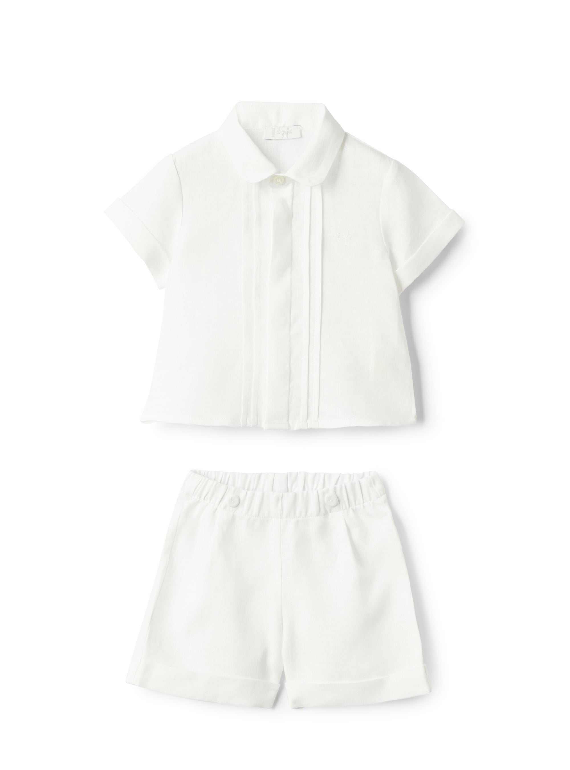 Dieses elegante Set von Il Gufo besteht aus einem leichten Leinenhemd mit verdeckter Knopfleiste und umschlagbaren Ärmeln sowie passenden Shorts mit elastischem Bund. Das 100% Leinen sorgt für ein angenehmes Tragegefühl, während das dezente Logo auf der Brust dem Look eine stilvolle Note verleiht. Perfekt für warme Sommertage.